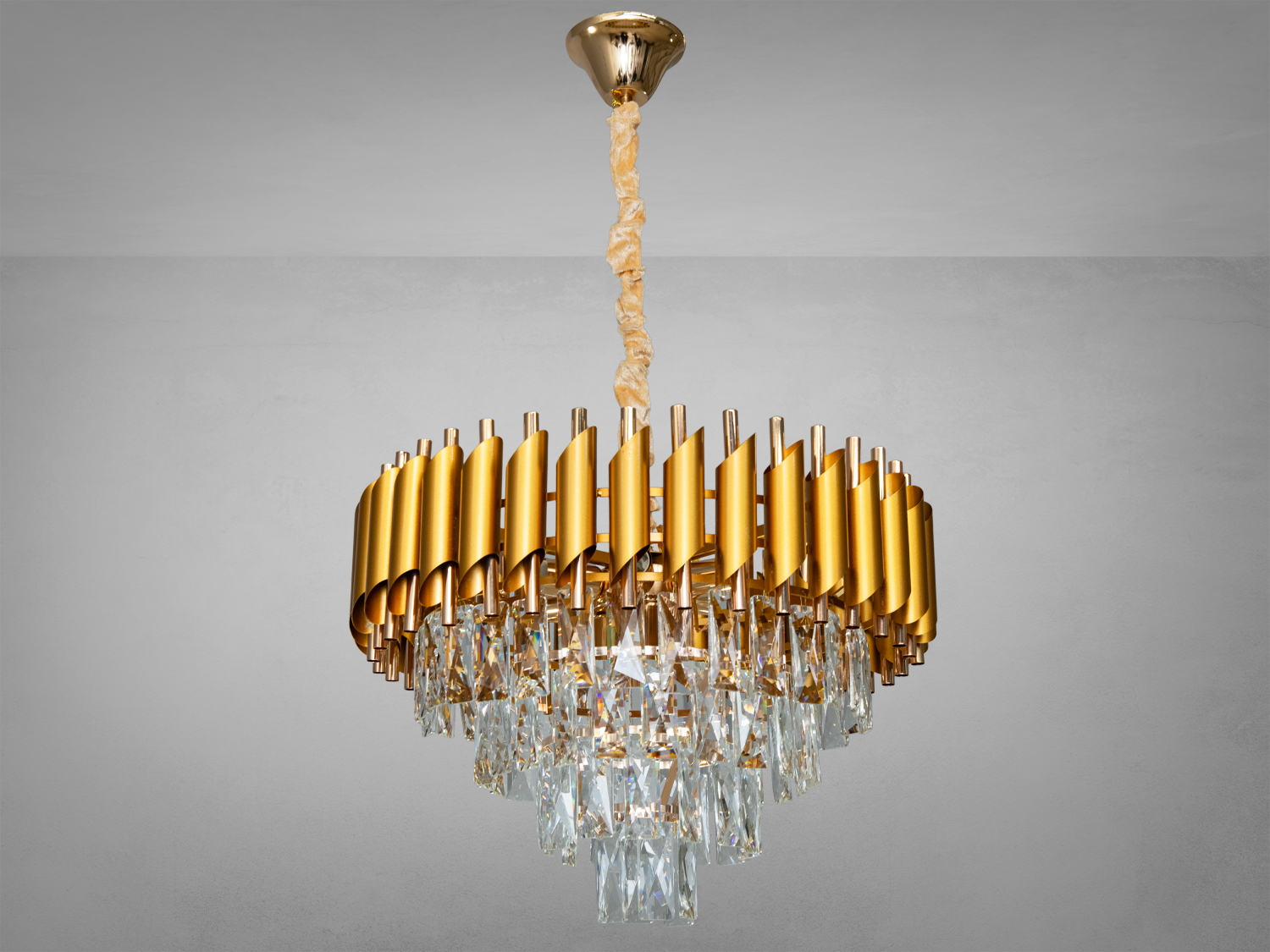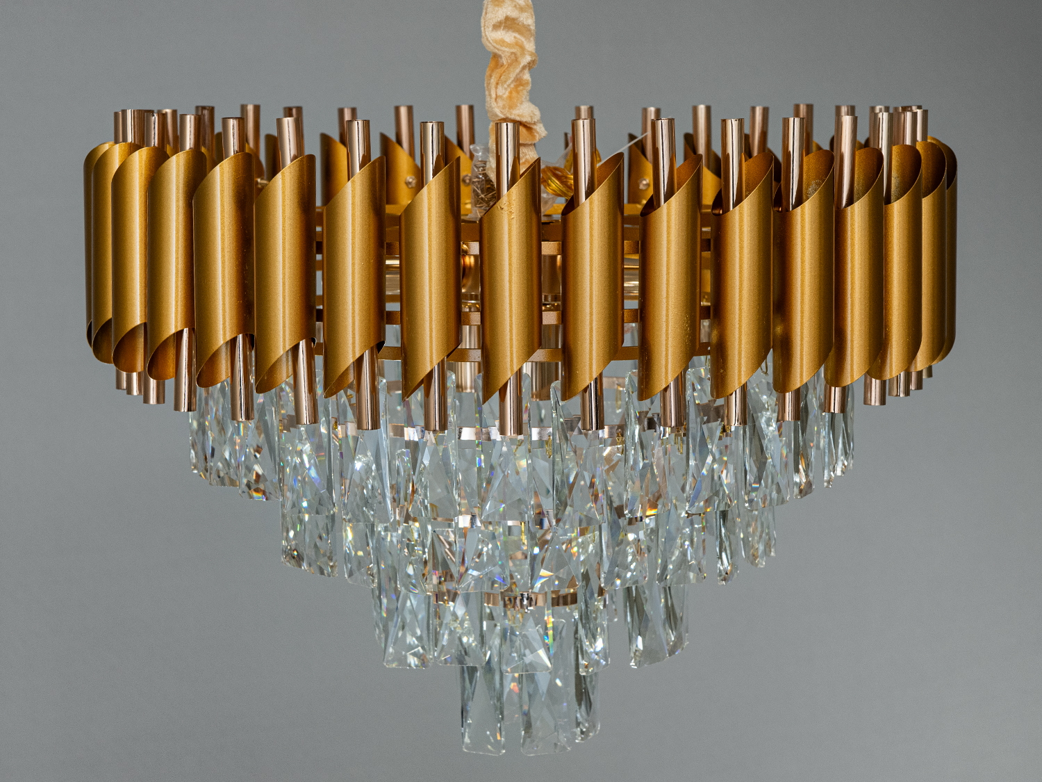Витончена кришталева люстра у вітальню виготовлена в сучасному стилі є яскравим акцентом в інтер'єрі. Корпус із металу з золотистим покриттям ідеально поєднується з каскадом кришталевих підвісок, які створюють розкішне світіння та вишукану атмосферу та створюють ефектне заломлення світла. Прямокутні кришталі, що звисають каскадом, ідеально рівної форми та розміру, захоплюють своєю чистотою й точністю відточки, відбиваючи світло та переливаючись усіма кольорами спектра за будь-якого освітлення. Ці кришталі доповнені оксамитовим чохлом підвісу, що відповідає колірній гамі основи люстри, надаючи їй завершеного вигляду.