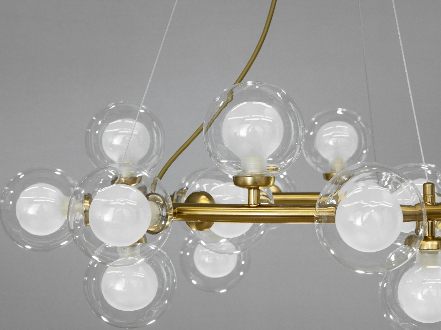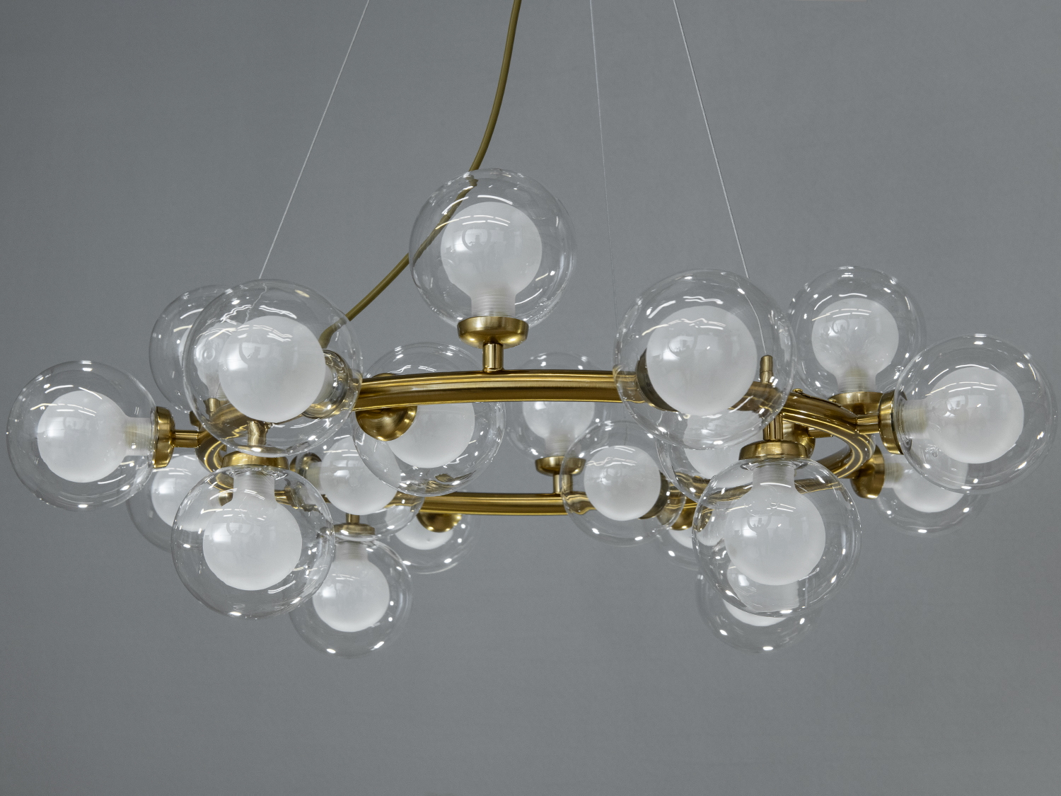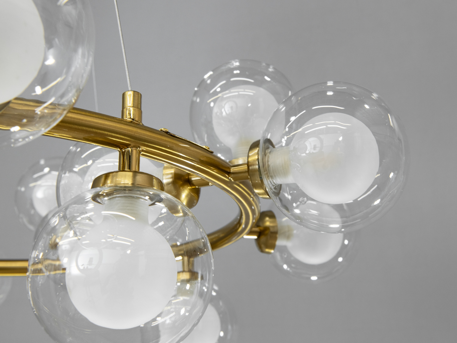 Підвісна люстра для зали відома під назвою "Пузирі" являє собою сучасний витвір мистецтва, який перетворить будь-яке приміщення. Її унікальні плафони виготовлені з прозорого скла з матовим покриттям усередині, створюючи стильний контраст і м'яке розсіяне світло. Ця комбінація додає витонченості дизайну та забезпечує комфортне освітлення без сліпучого ефекту.