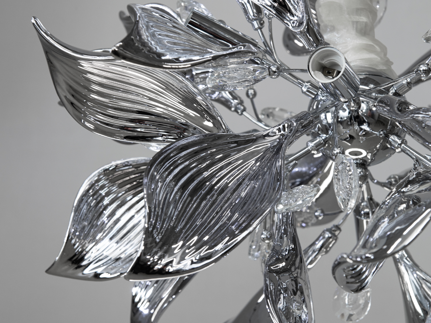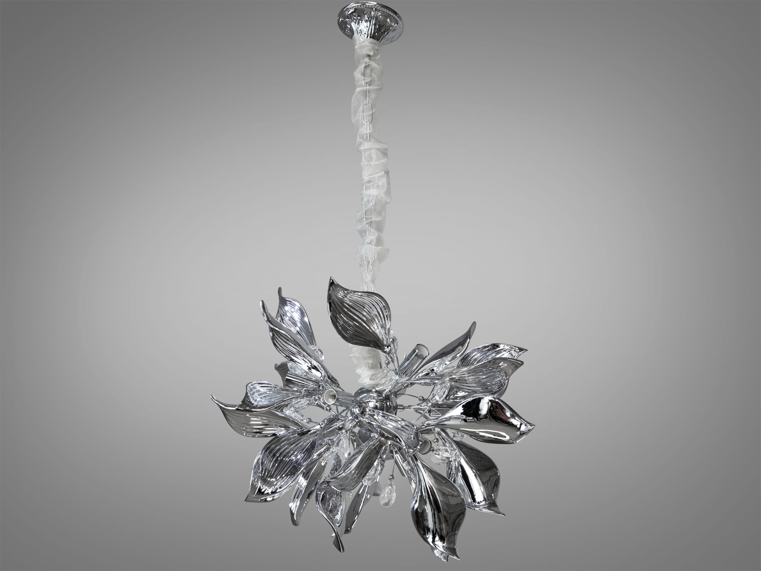 Ця люстра виготовлена з металу та кераміки, покритих хромом, що надає їй дзеркального блиску та сучасного вигляду.