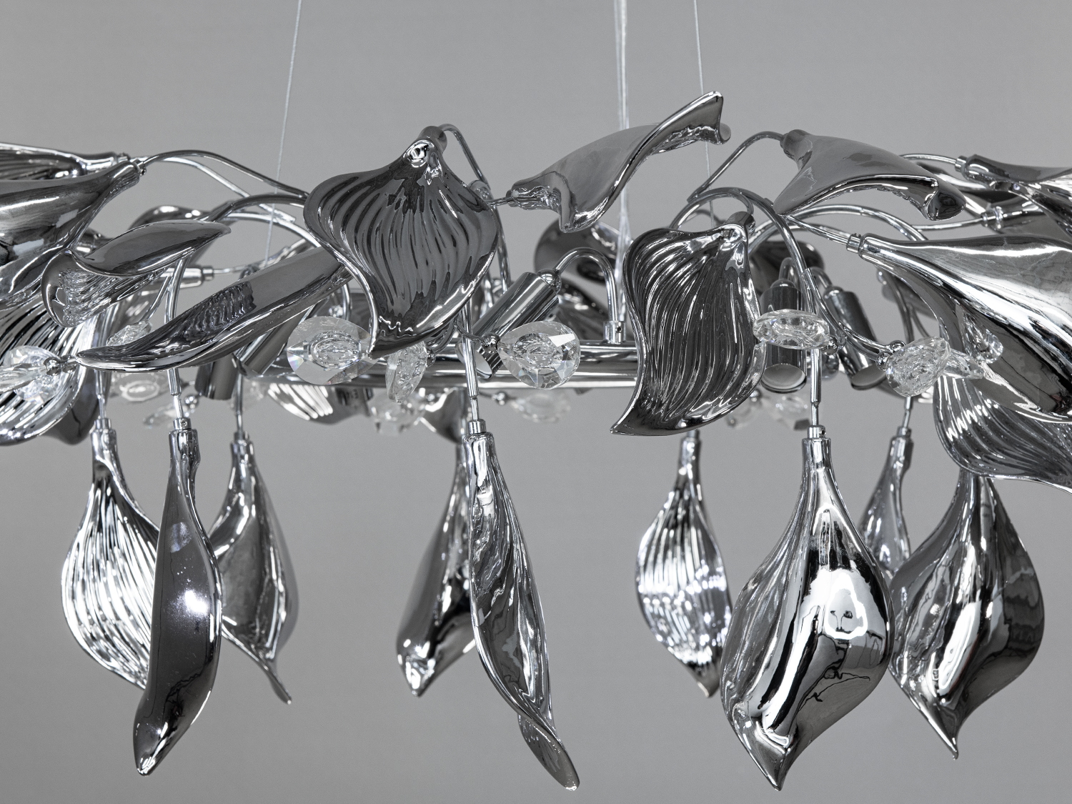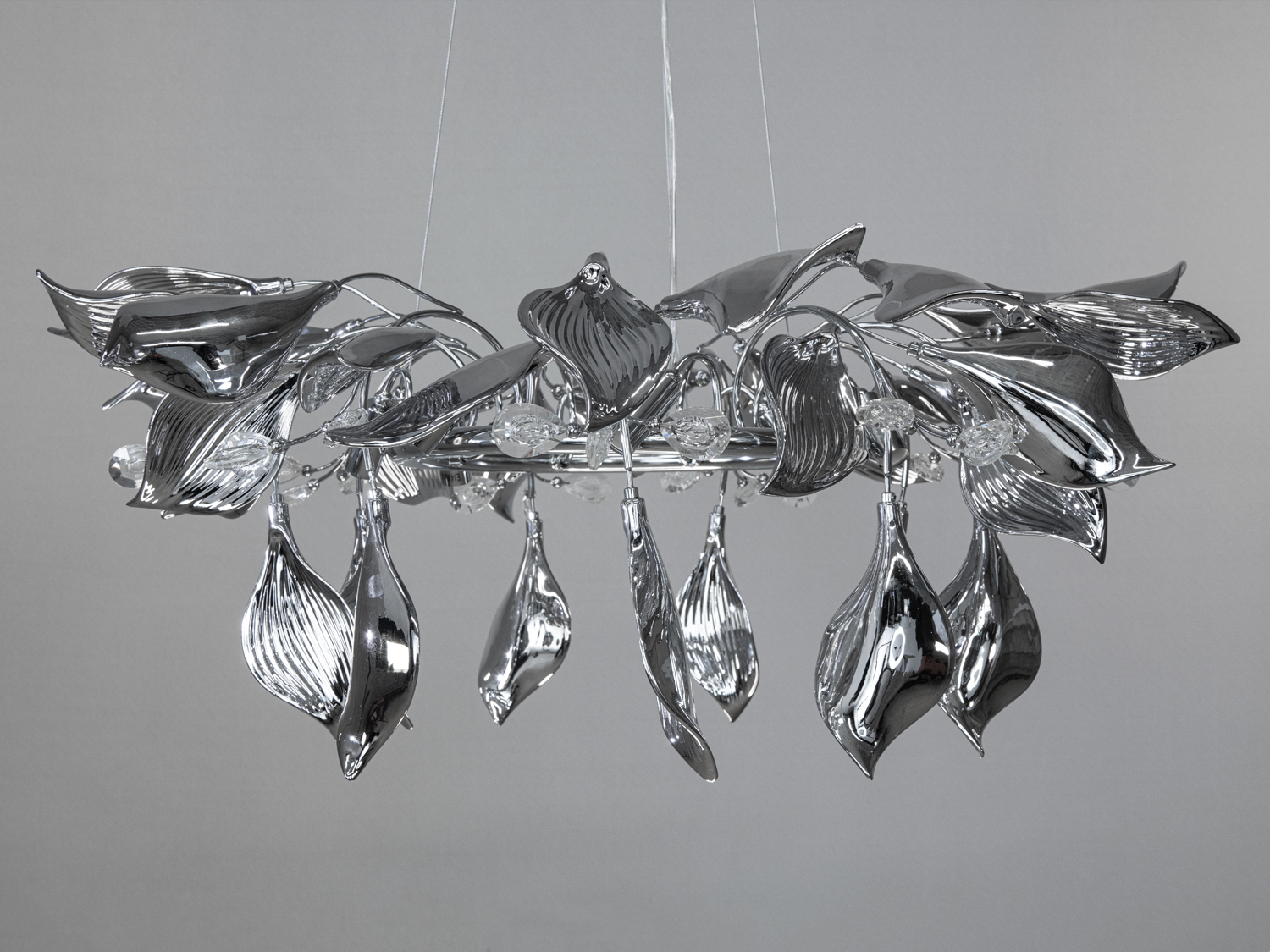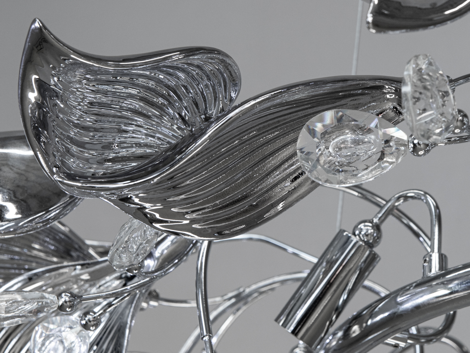 Основа виконана з хромованого металу, прикрашеного декоративними керамічними елементами у вигляді пелюсток. Ця унікальна комбінація матеріалів створює враження динаміки та природної гармонії.