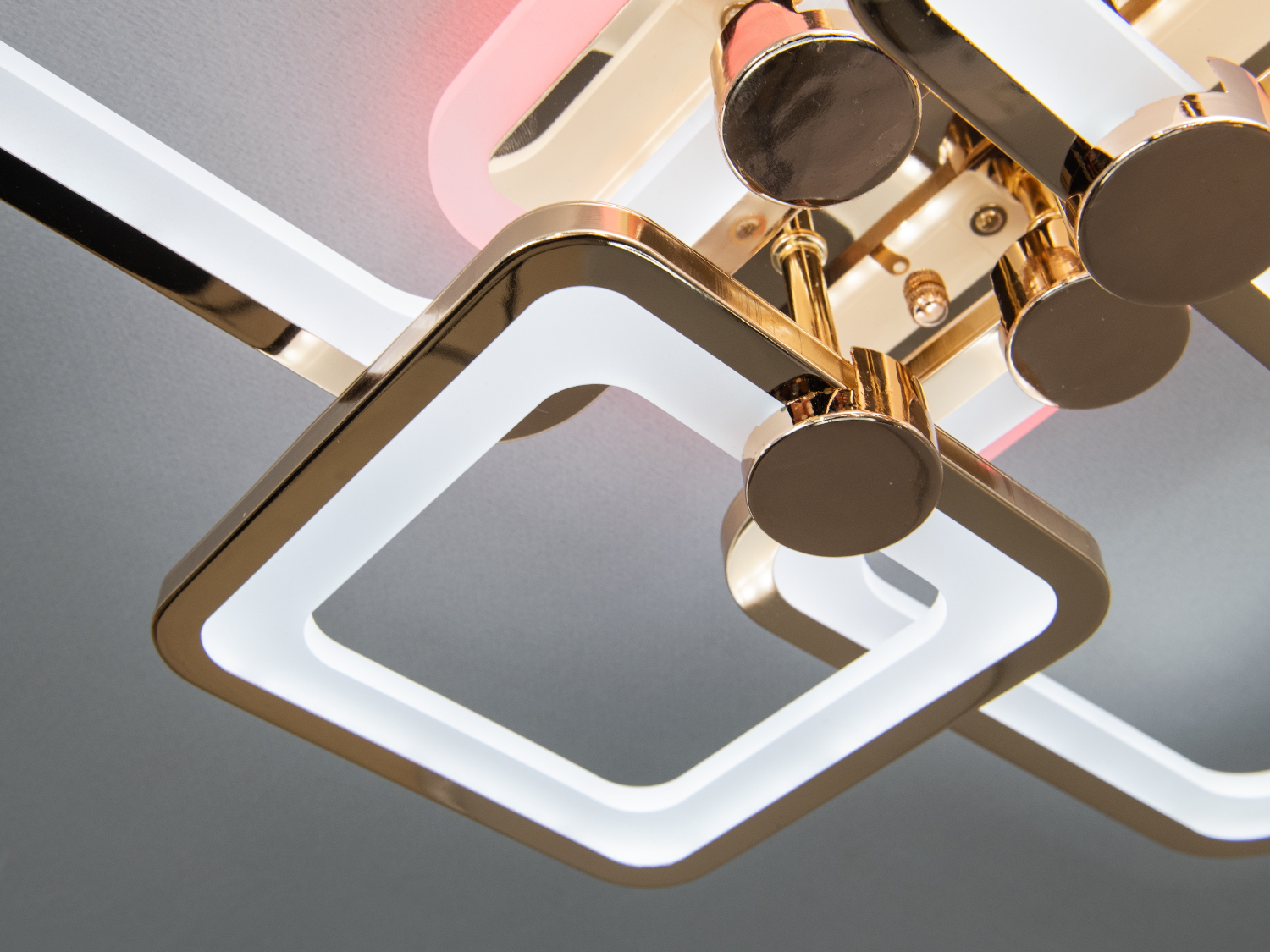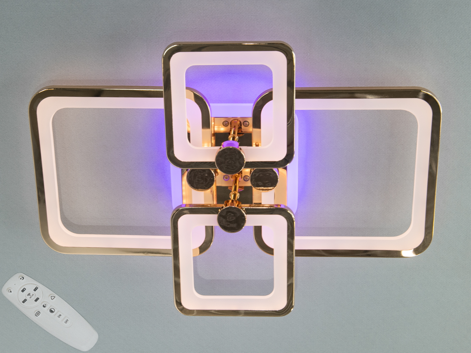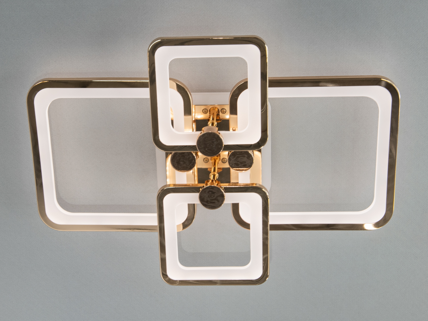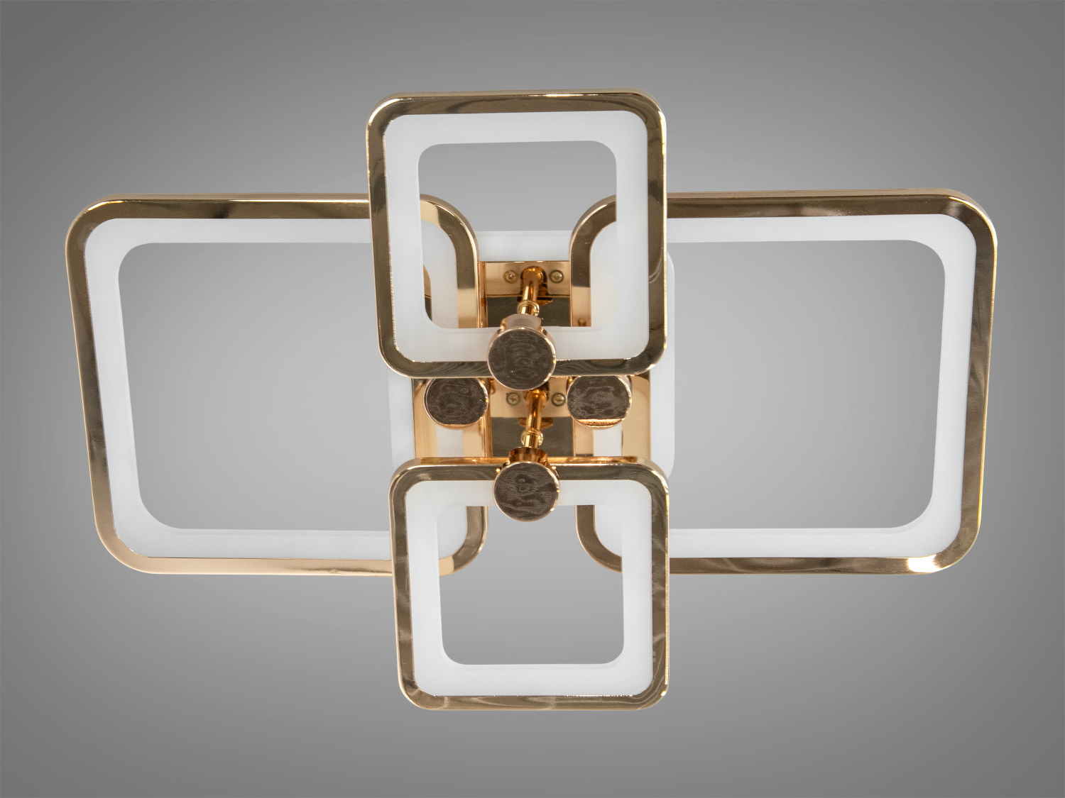 Плоска led люстра квадратами для офісу — це сучасне рішення для стильного освітлення, яке поєднує мінімалізм і елегантність. Її дизайн ґрунтується на перетині чотирьох геометричних елементів у формі прямокутників із заокругленими краями. Золотисті акценти та світлодіодна підсвітка з акриловими вставками створюють гармонійний баланс між функціональністю й естетикою. М'яке освітлення, яке можна налаштувати за допомогою пульта, дає змогу вибрати тепле, нейтральне або холодне світло, створюючи ідеальну атмосферу для будь-якої ситуації.