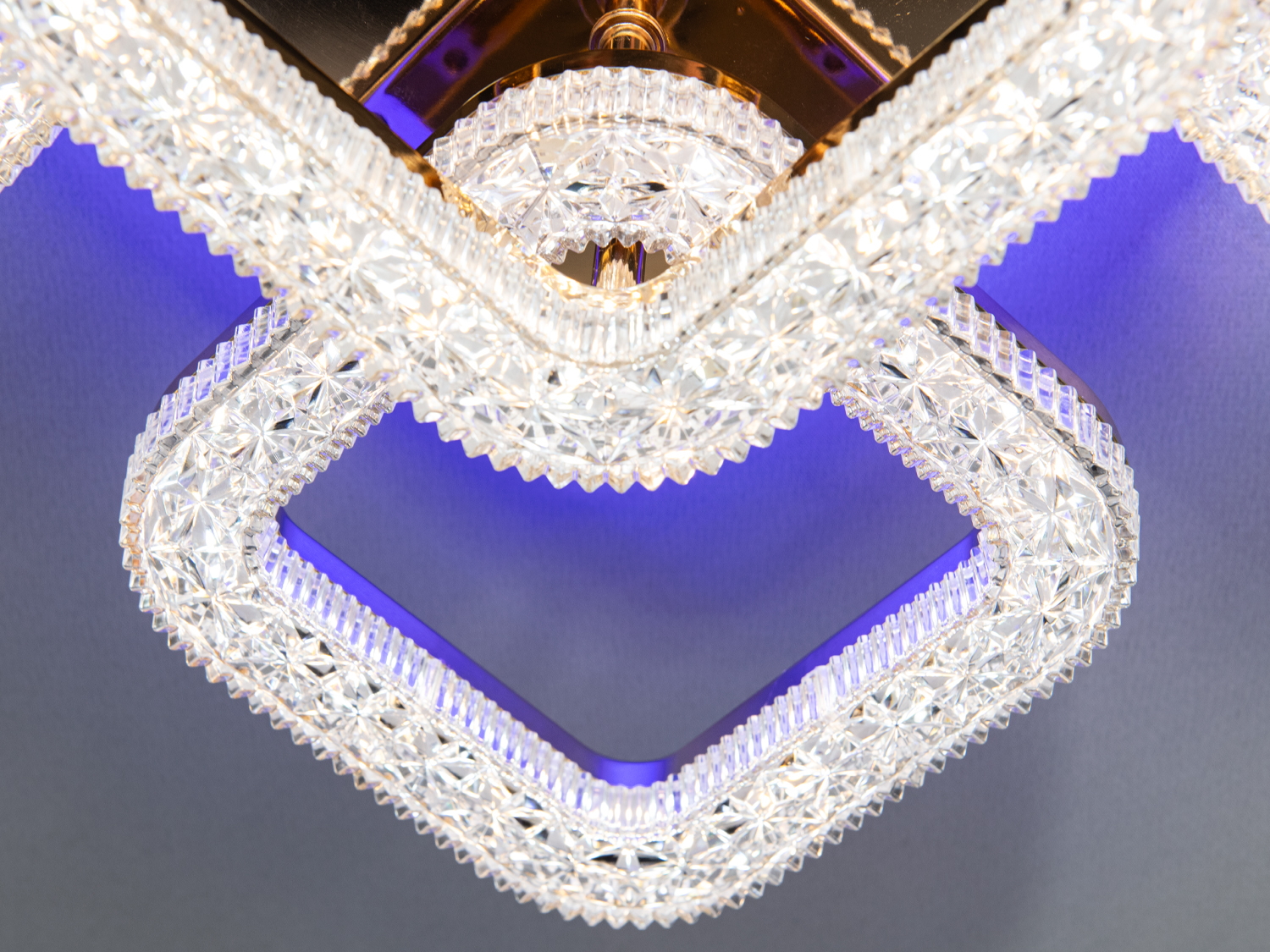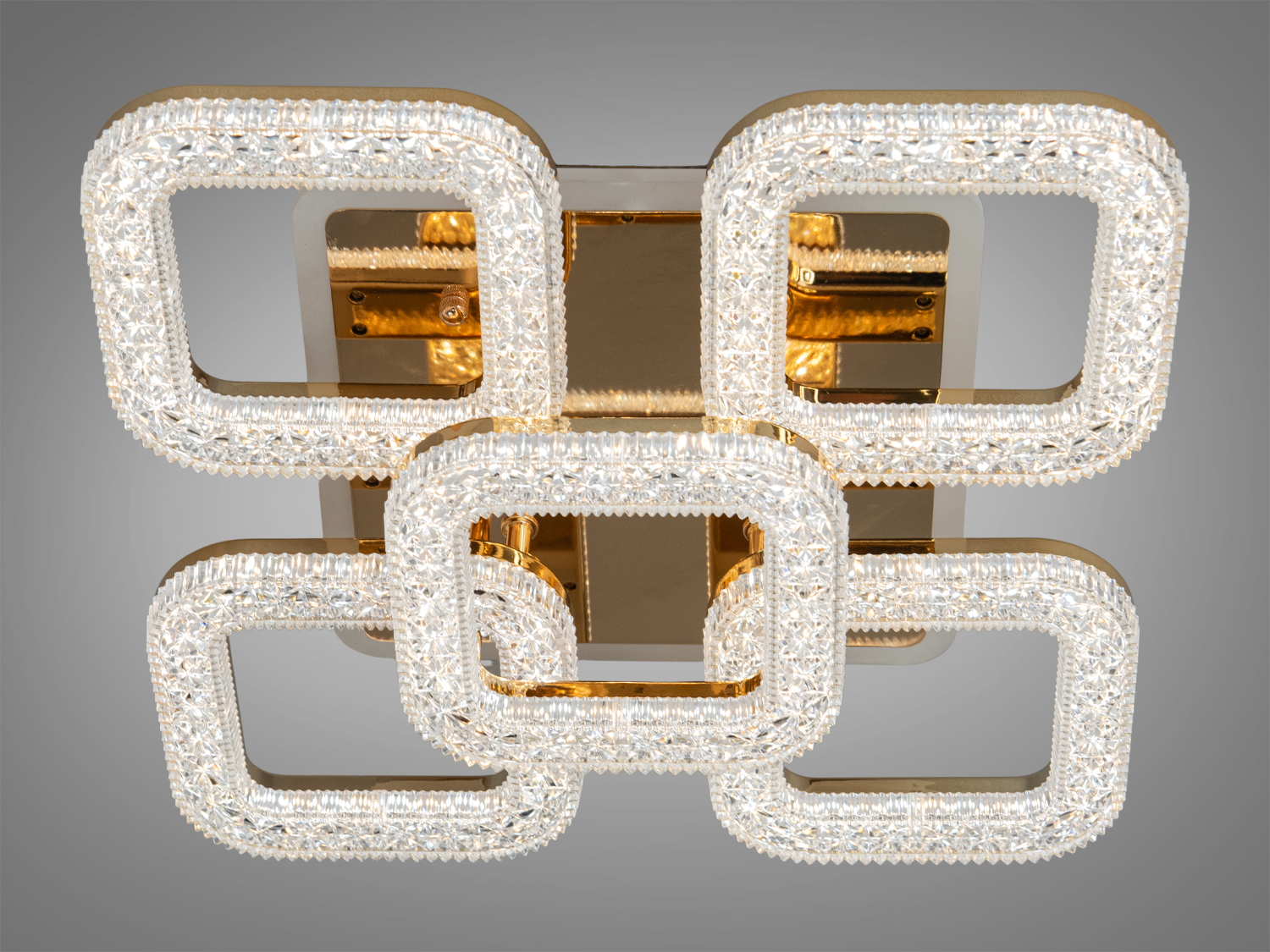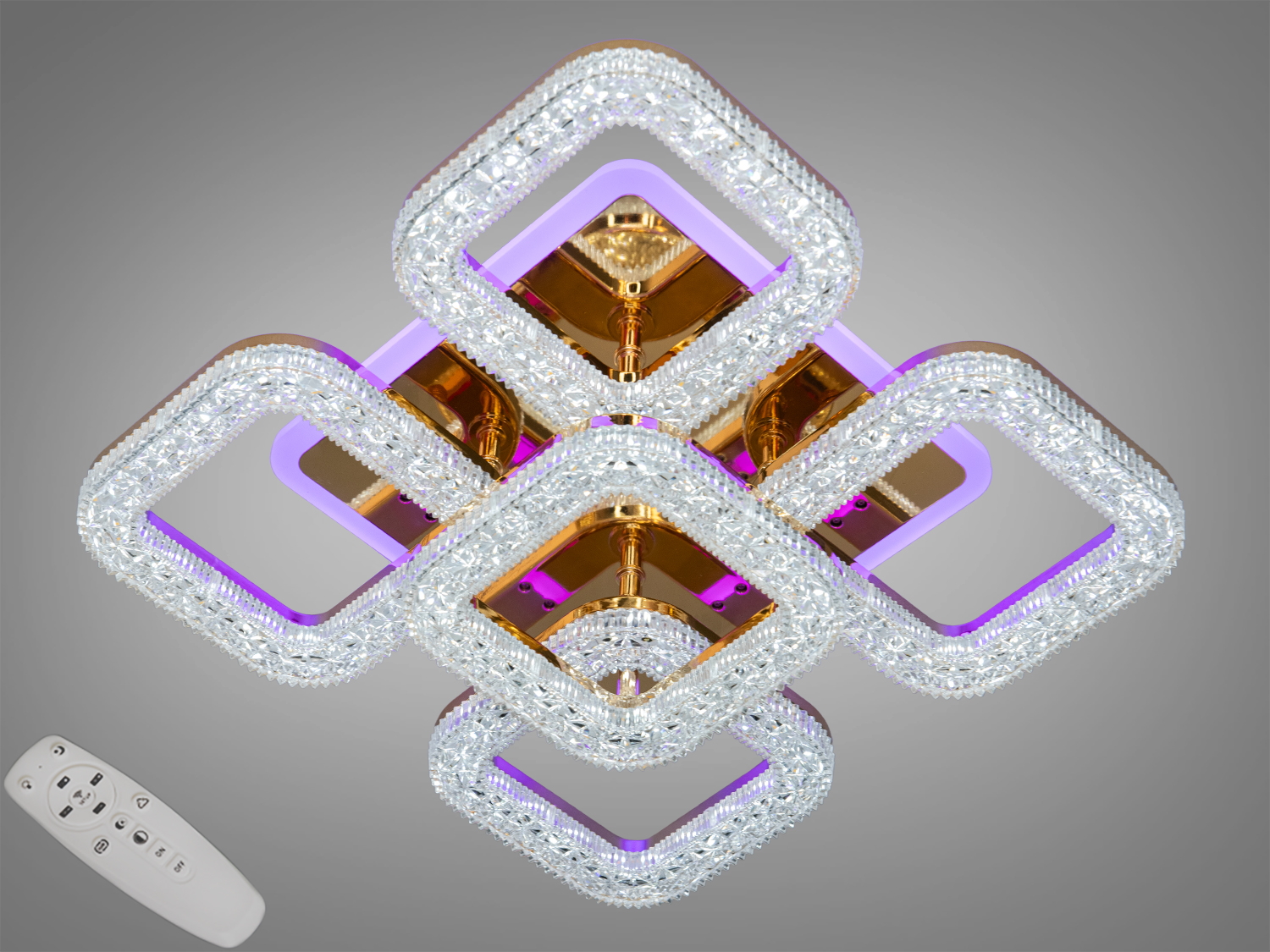 Корпус люстри виконаний з металу, а плафони з інкрустованого акрилу, що підсилює ефект розсіяного світла. Завдяки пульту керування та вбудованому димеру, ви зможете регулювати яскравість від 5% до 100%, а також обирати між теплим, нейтральним та холодним освітленням (3200K, 4100K, 6000K).