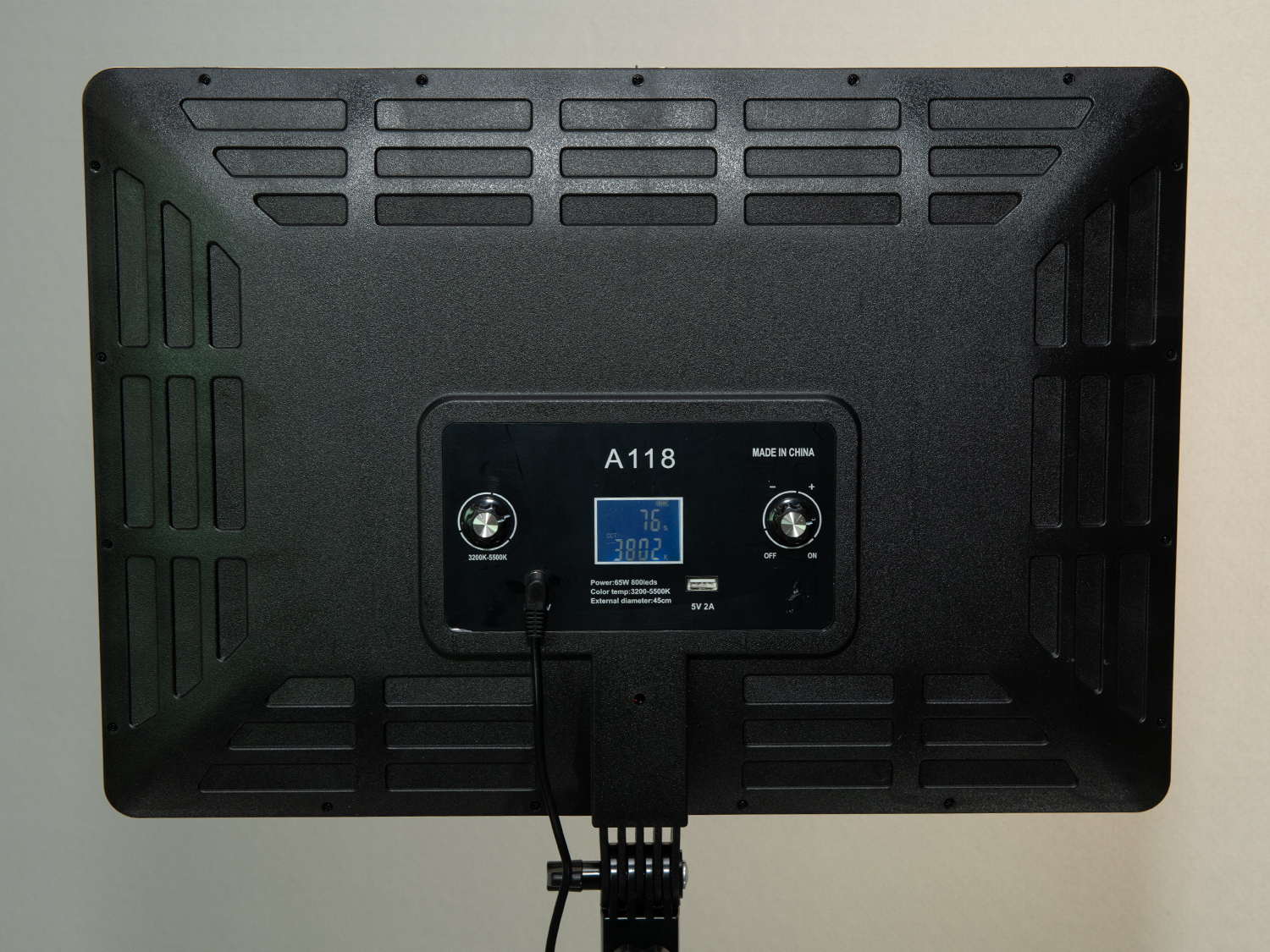 На тильній стороні розташовується цифровий дисплей, що показує поточні параметри, що забезпечує точний контроль над освітленням. Також є USB-роз'єм для під'єднання аксесуарів або заряджання ґаджетів.