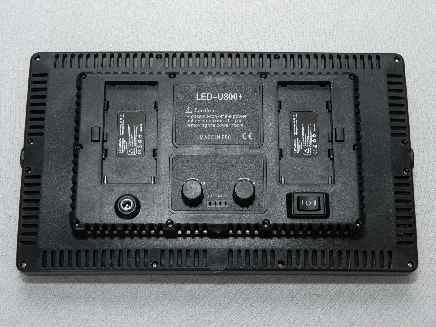 Прожектор підтримує роботу від мережі та двох акумуляторів Sony F серії, що дозволяє використовувати його в автономному режимі. На задній панелі розташовані регулятори яскравості та індикатор заряду акумулятора, що додає зручності в процесі експлуатації.