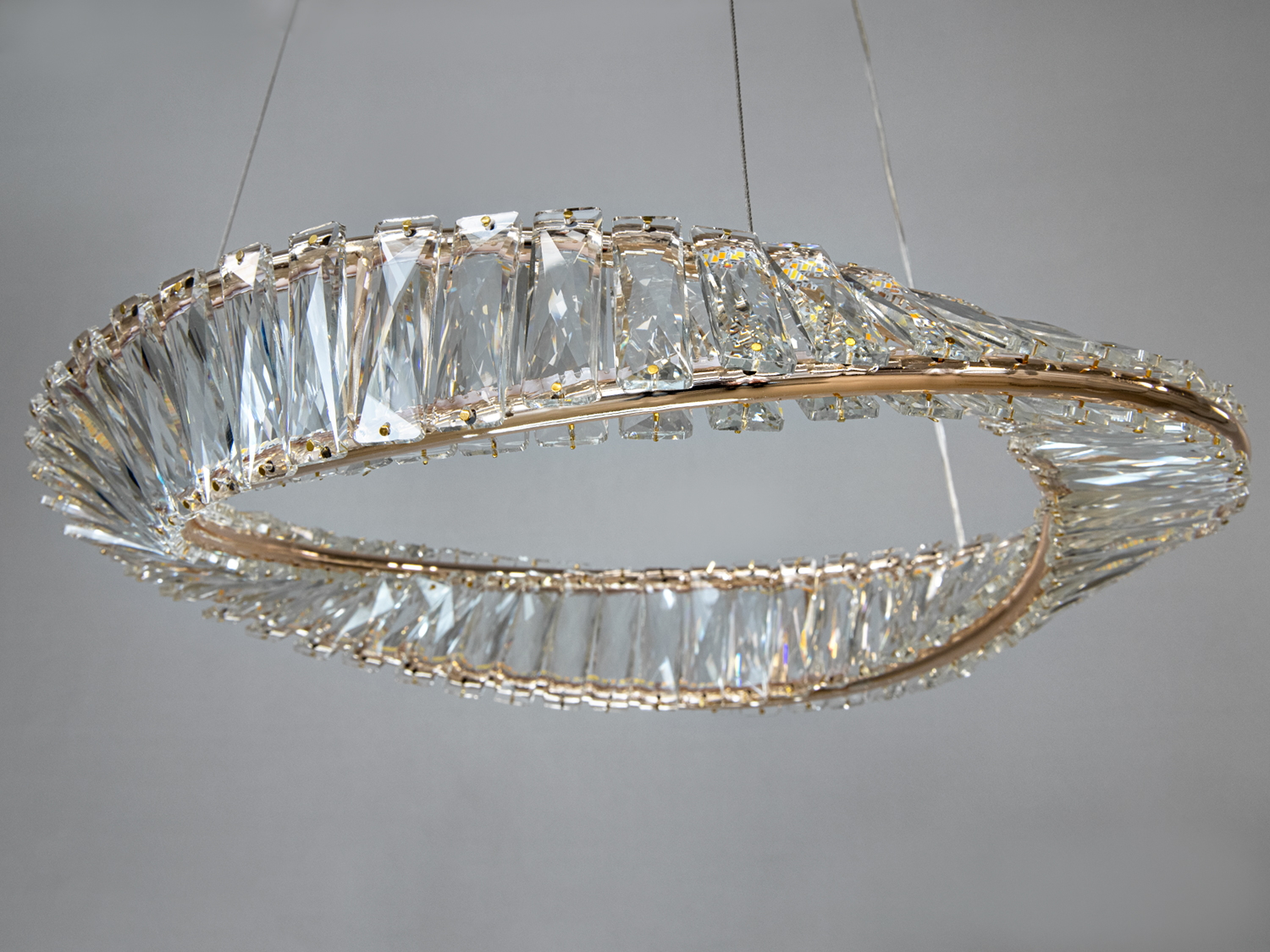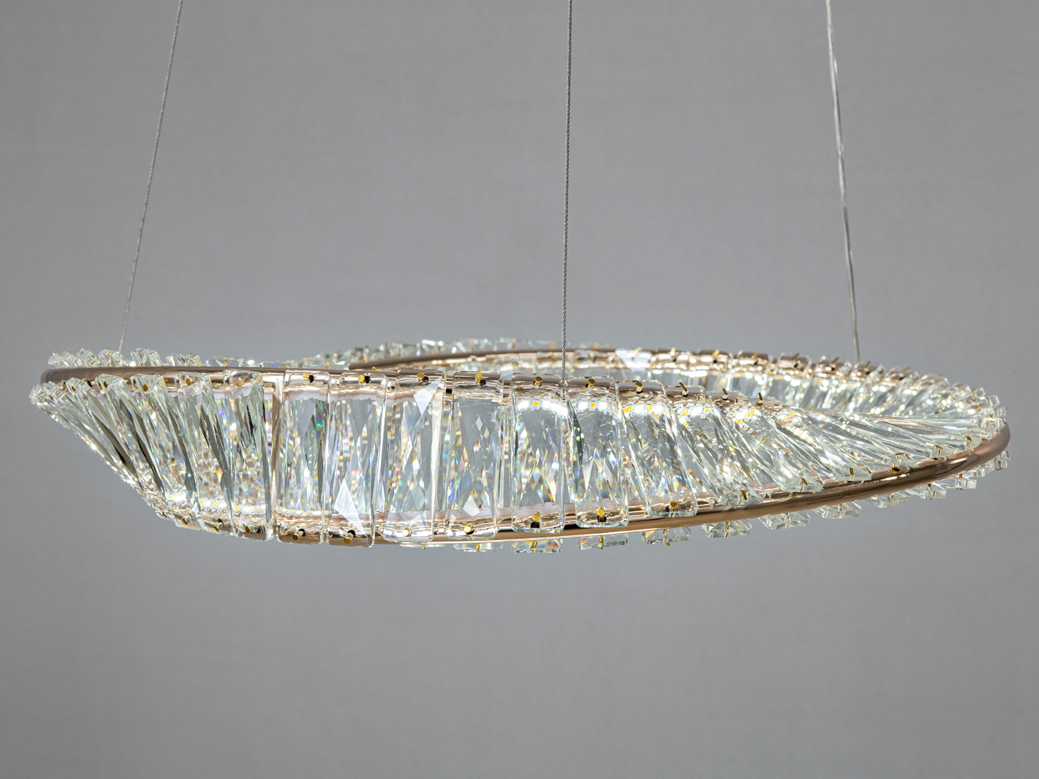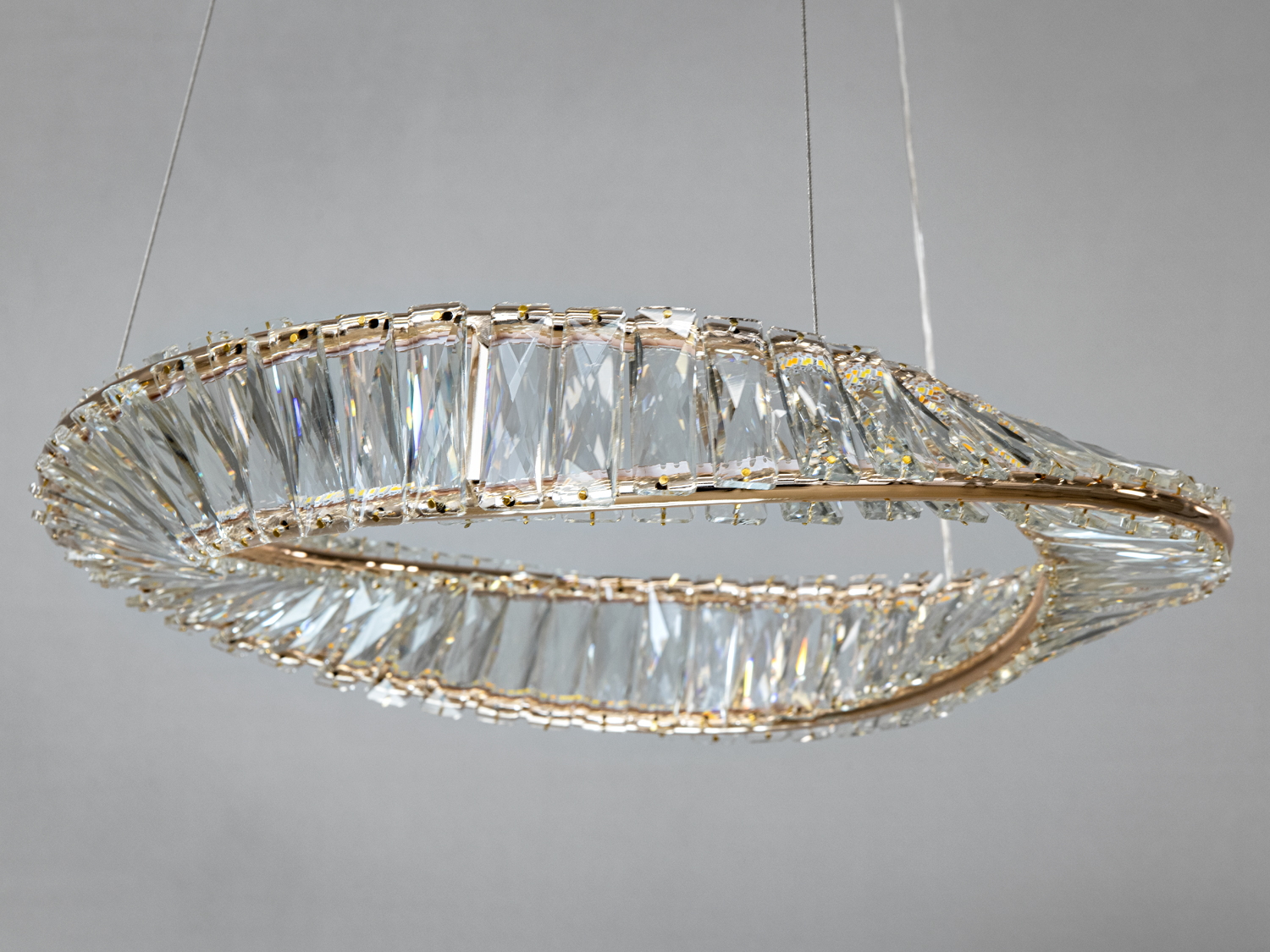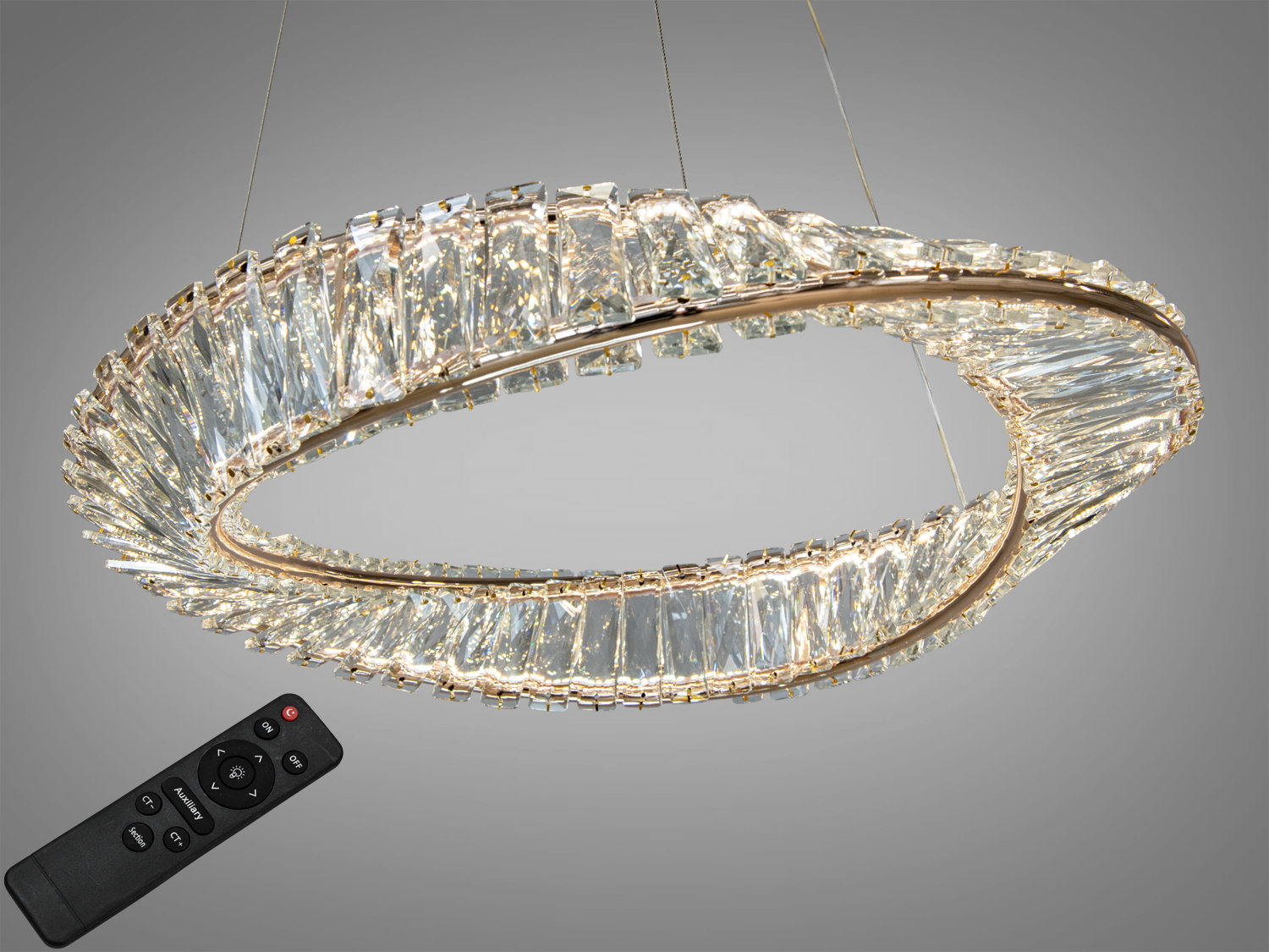 Люстра виготовлена з металу та прикрашена кристалами, що створюють ефект водоспаду світла. Пульт керування дозволяє змінювати яскравість і температуру світла, а також вмикати режим нічника.