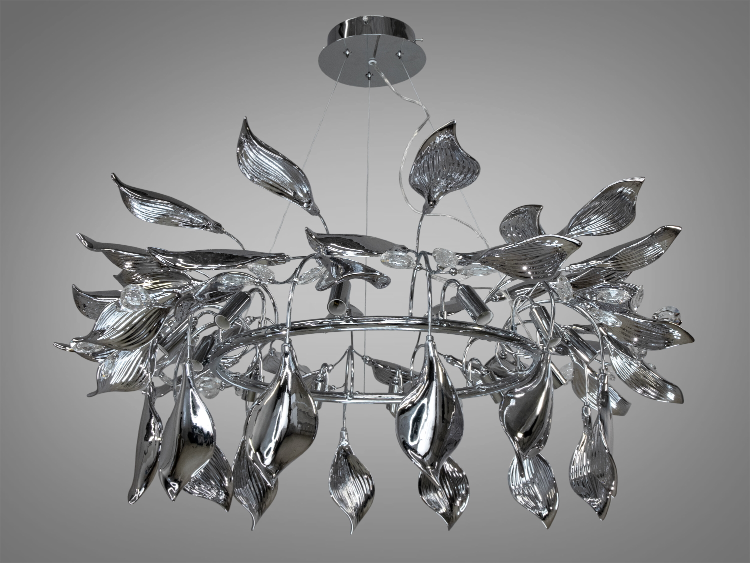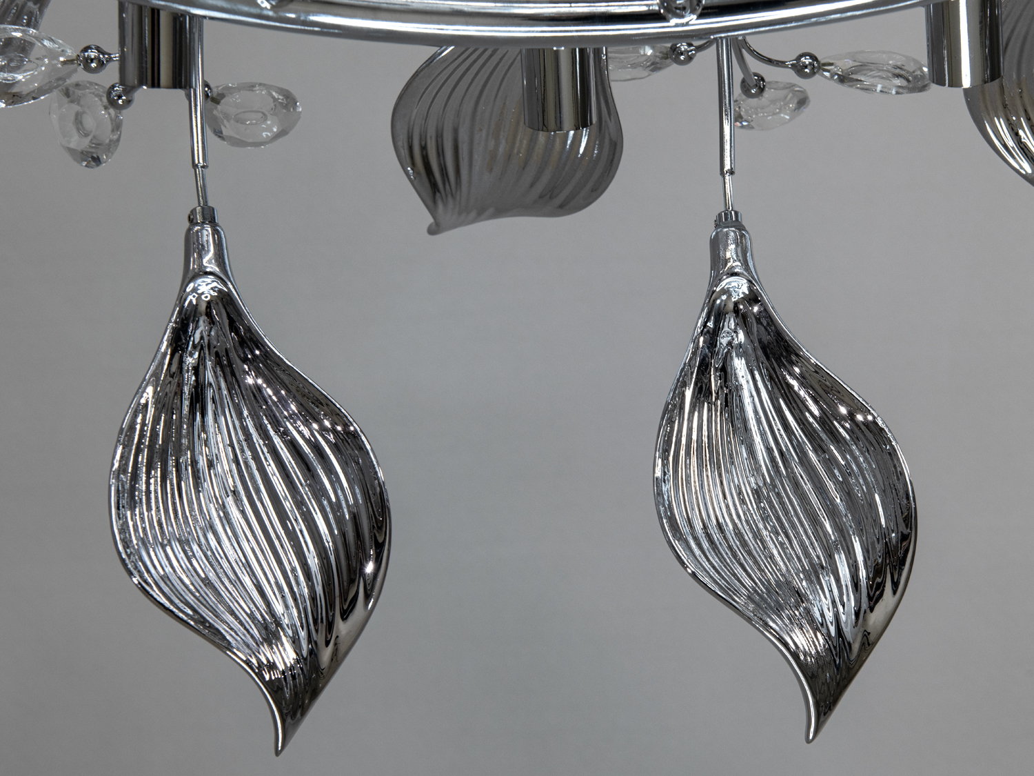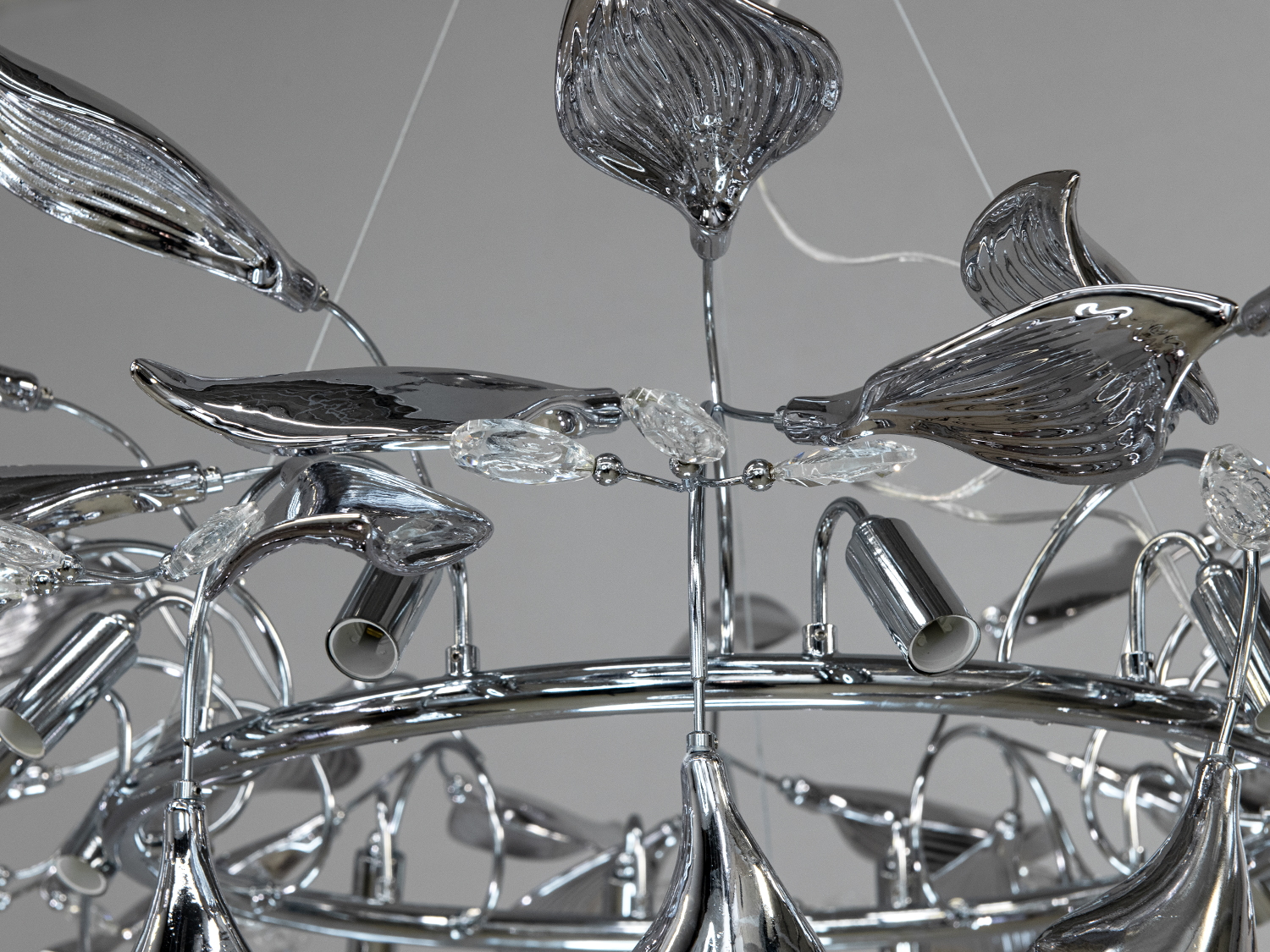 Люстра виконана з кераміки та металу, що надає їй міцність та довговічність. Хромоване покриття каркаса додає сучасний блиск, а декоративні елементи зі скла створюють ефект розквітлих листя, що переливаються на світлі.