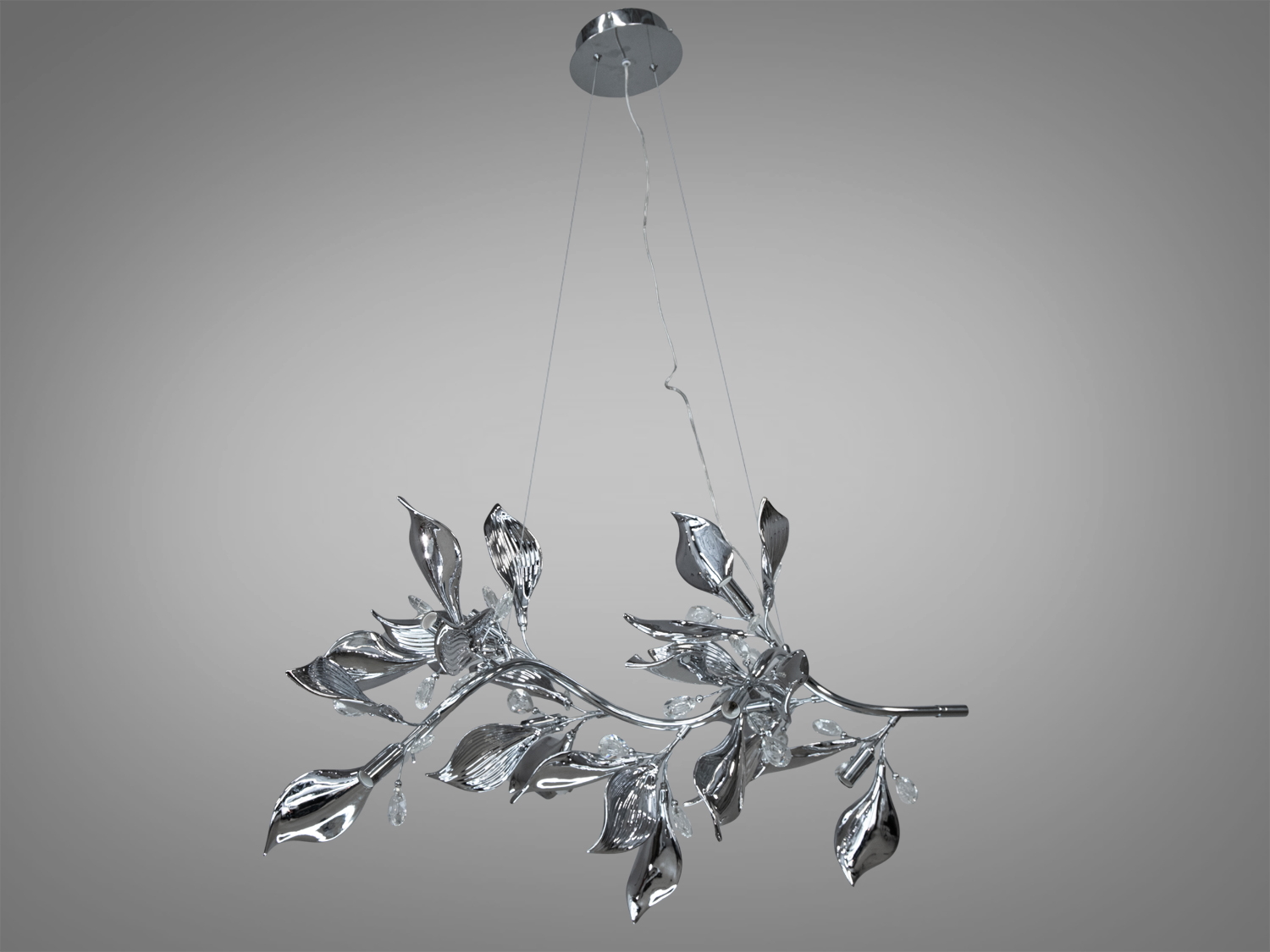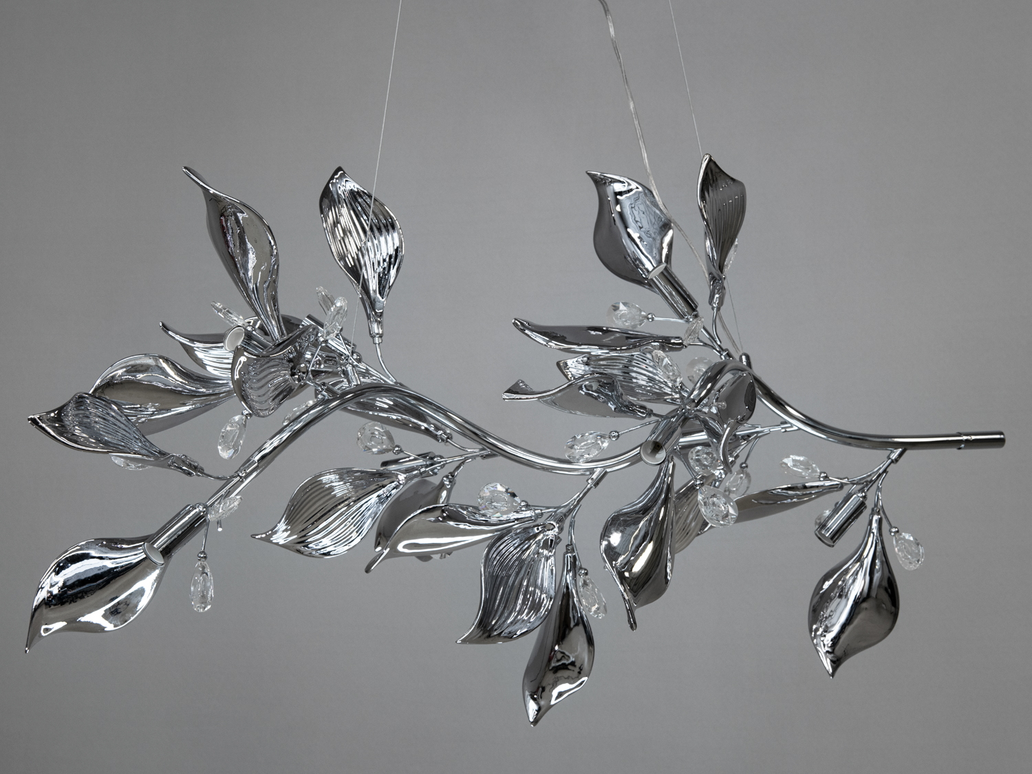 Підвісна керамічна люстра витягнутої форми — це не просто освітлювальний елемент, а справжній витвір мистецтва, натхненний природними формами. Вигнуті металеві гілки, прикрашені керамічним листям і кришталевими підвісками, створюють враження легкості та динаміки.