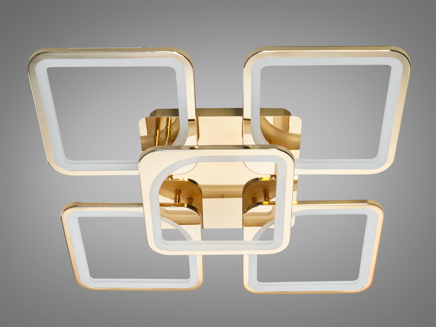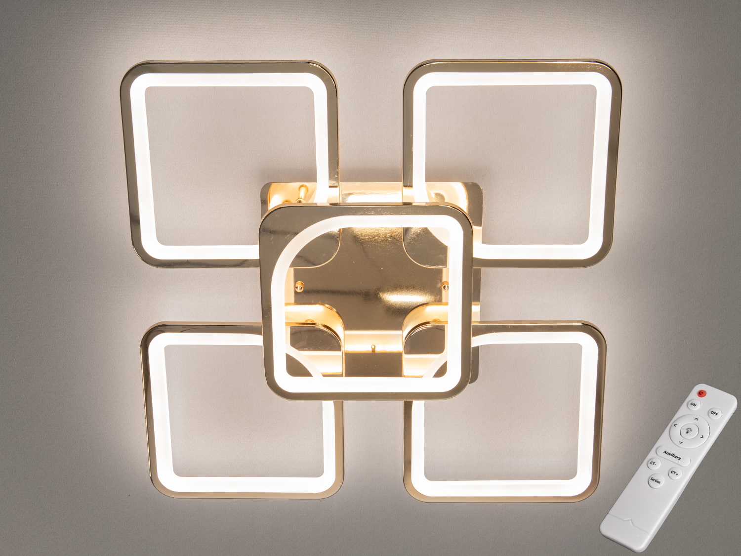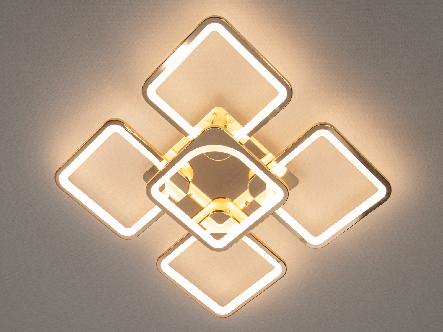 Світлодіодна люстра в спальню з пультом – це елегантне поєднання геометричної симетрії, м'якого освітлення та сучасних технологій, що створює унікальний стильний акцент в інтер'єрі. Її конструкція є композицією з п'яти квадратів, чотири з яких плавно обрамляють центральний елемент, формуючи гармонійне перетин ліній і об'ємів, створюючи ефект легкості і ширяння. Колірні рішення в золоті та хромі дозволяють підібрати люстру для різних стилів інтер'єру: золота версія підкреслює розкіш та тепло, а хромована – строгість і технологічність, що робить цей світильник універсальним рішенням для різних приміщень.