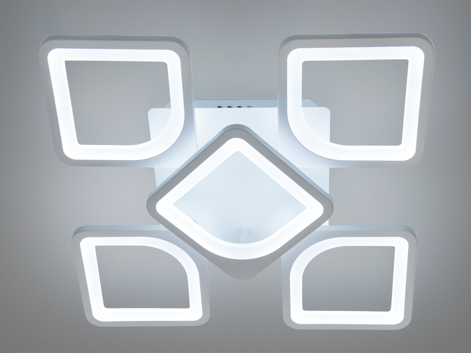 Квадратна LED люстра в дитячу з диммером – це стильне та технологічне рішення для освітлення, що поєднує гармонію геометричних форм та м'якого світла, її дизайн представлений у вигляді п'яти об'ємних квадратів різного розміру, розташованих симетрично навколо центрального елемента, створюючи ефект просторової легкості та візуальної симетрії.
