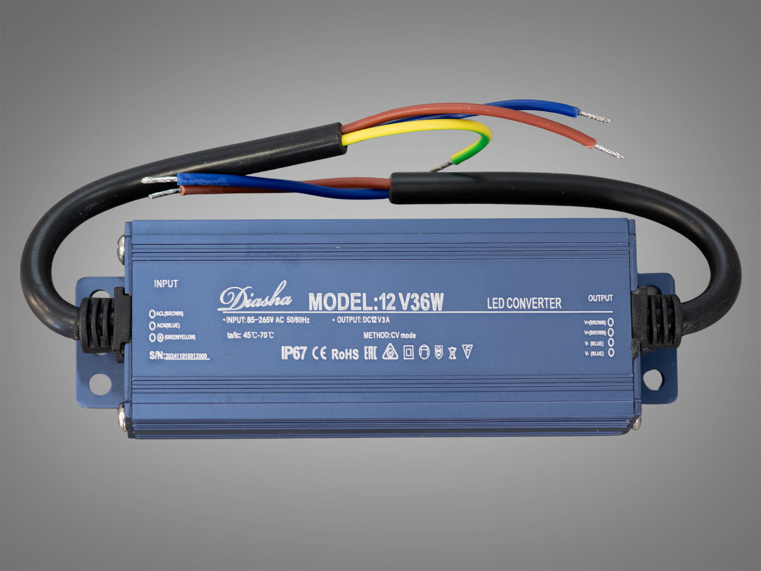 Блок живлення NP-12V-36W-IP67 від ТМ "Діаша" — це компактне, герметичне та надійне джерело живлення, створене для підключення світлодіодної стрічки у будь-яких умовах. Його металевий корпус із ребристою текстурою не лише надає пристрою міцності, а й сприяє ефективному охолодженню без потреби у вентиляторах. Всередині корпусу плата повністю залита компаундом, що забезпечує максимальний рівень захисту від вологи, пилу, вібрацій та корозії. Завдяки високому ступеню герметичності IP67, цей блок живлення може експлуатуватися як у приміщеннях, так і на вулиці — навіть під впливом опадів або бризок. Його компактні розміри роблять його зручним для встановлення в будь-яких умовах — від меблевих ніш до герметичних розподільчих коробок.
