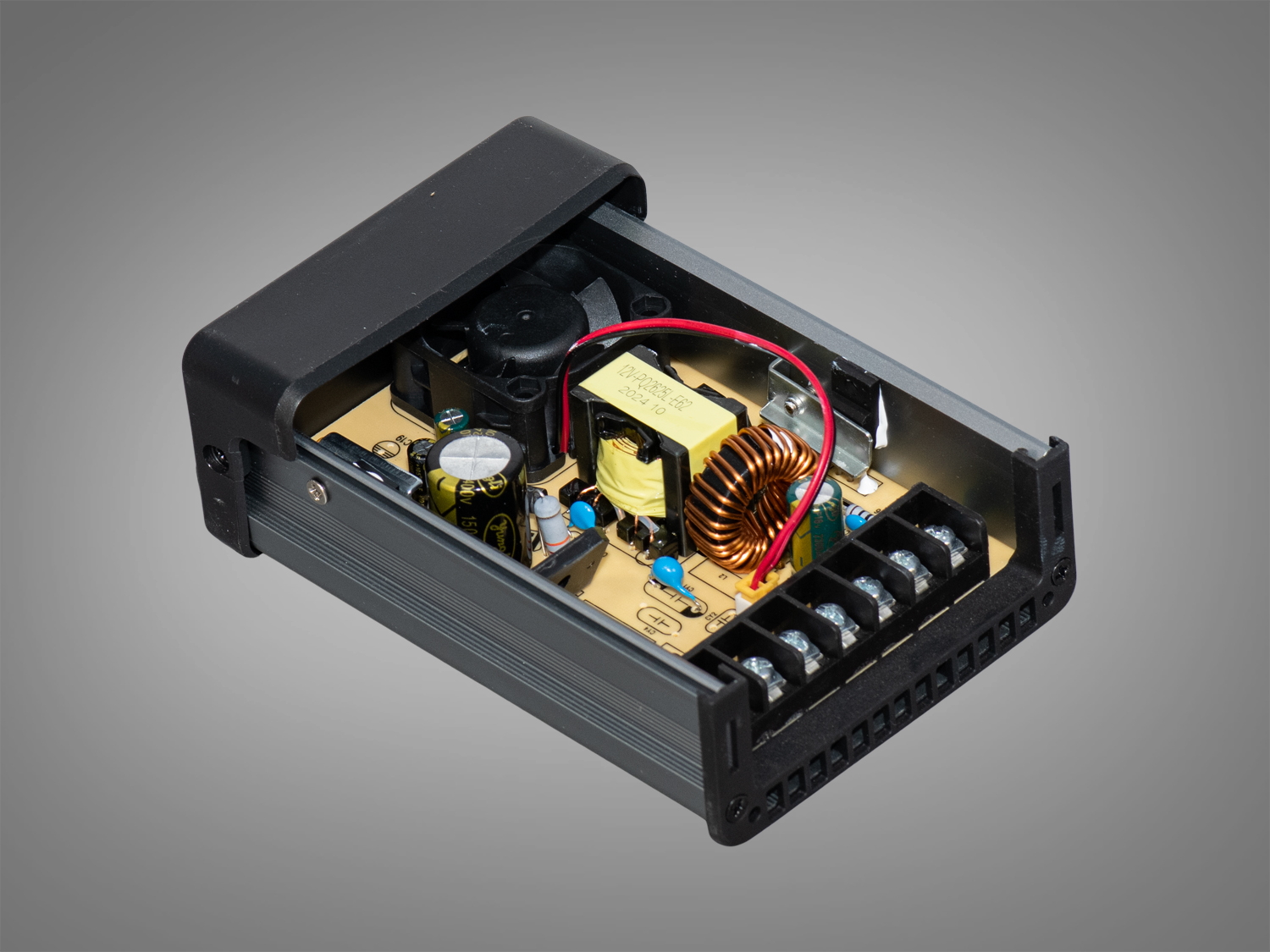Пристрій обладнаний активним вентилятором, що ефективно охолоджує блок навіть у закритих нішах або технічних шафах, отже, він виступає як LED блок живлення з активним охолодженням.