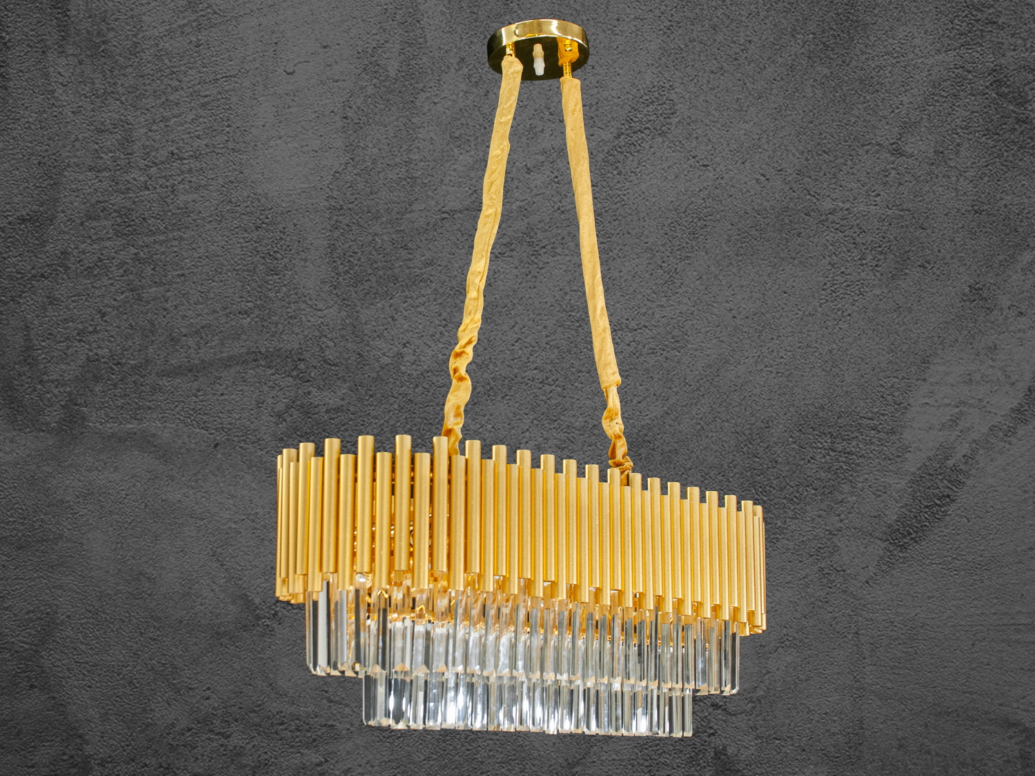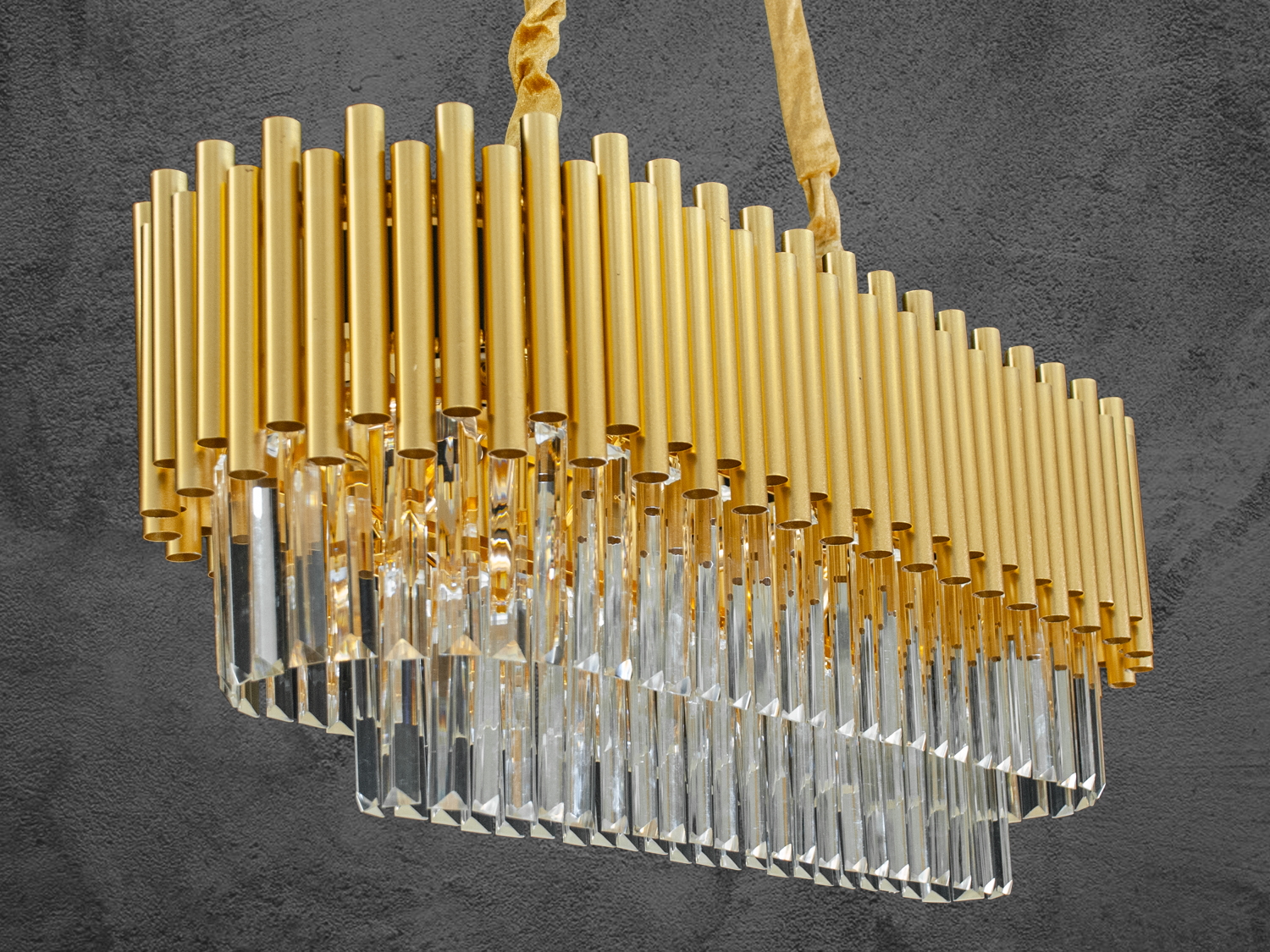 Кришталева люстра овальної форми для вітальні – це поєднання розкоші та сучасного дизайну. Виконана з міцного соснового металу з вишуканим золотистим оздобленням, вона прикрашена кришталевими підвісками, які переливаються за будь-якого освітлення, створюючи гру світла і тіней. Люстра підвішена на міцні ланцюги, обрамлені оксамитовим чохлом, що надає конструкції додаткову естетику і робить її вишуканою.