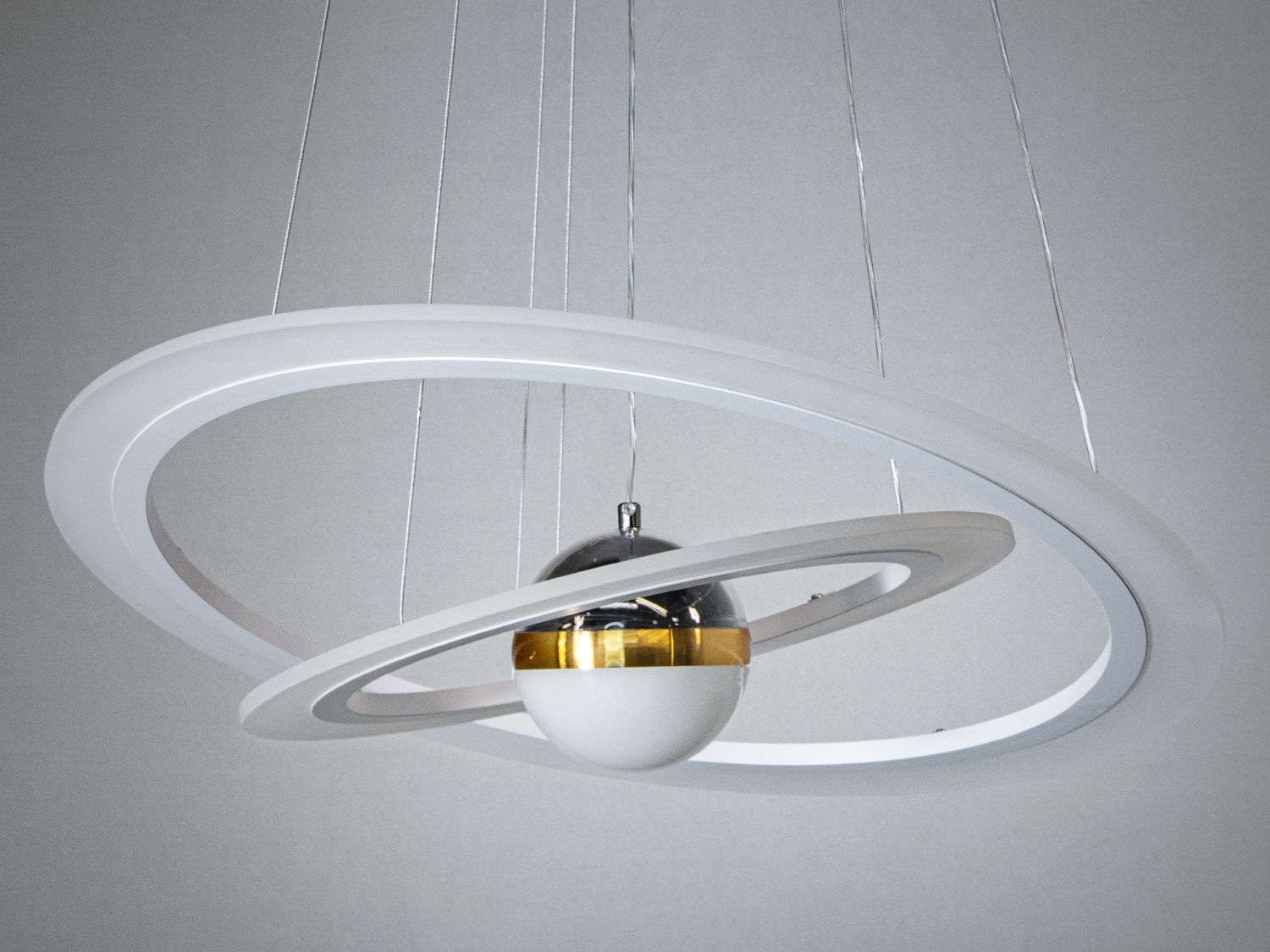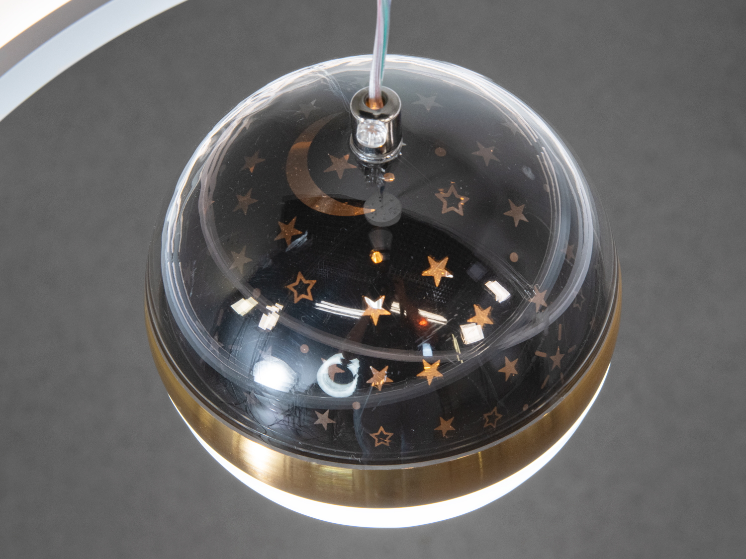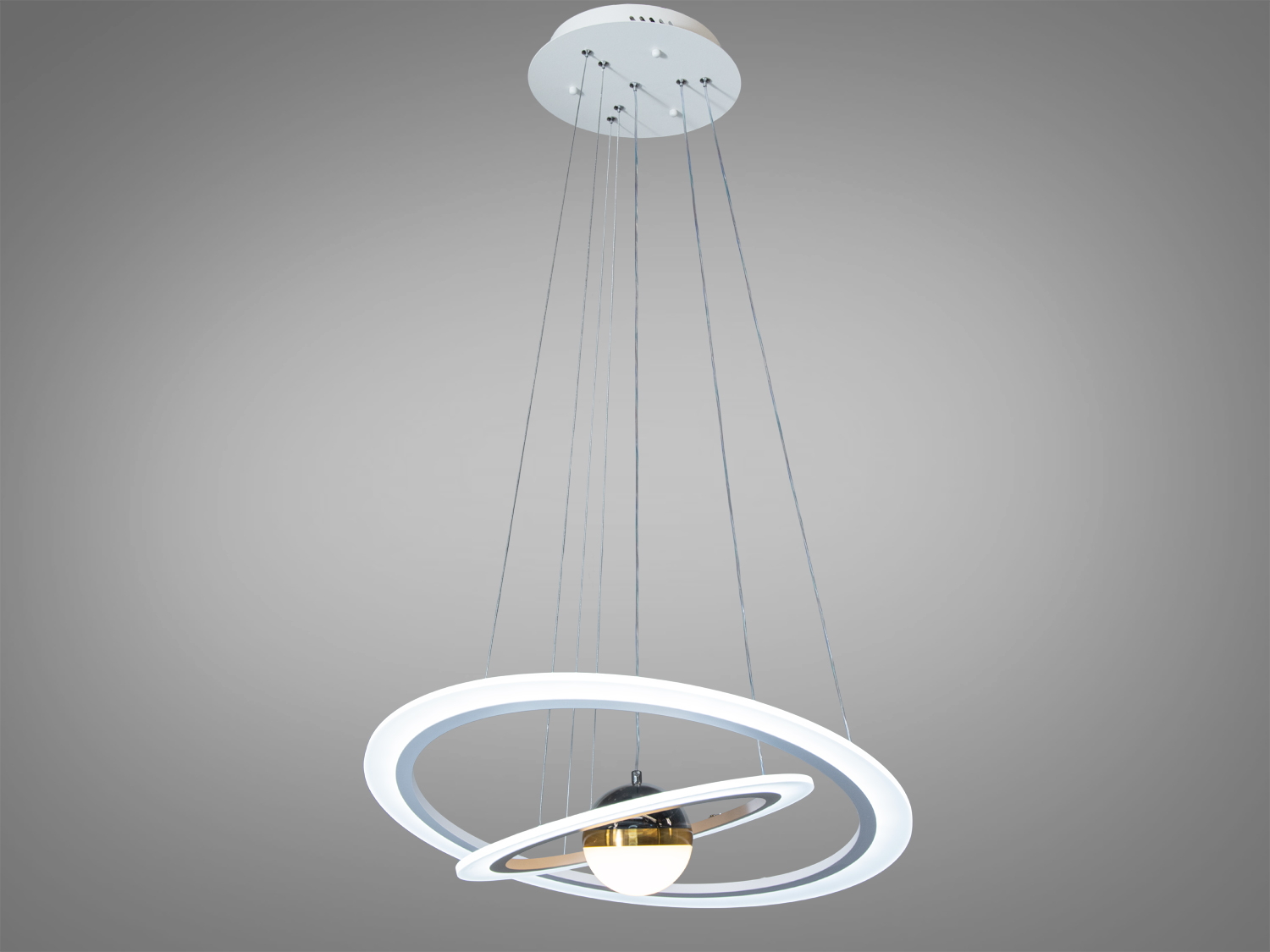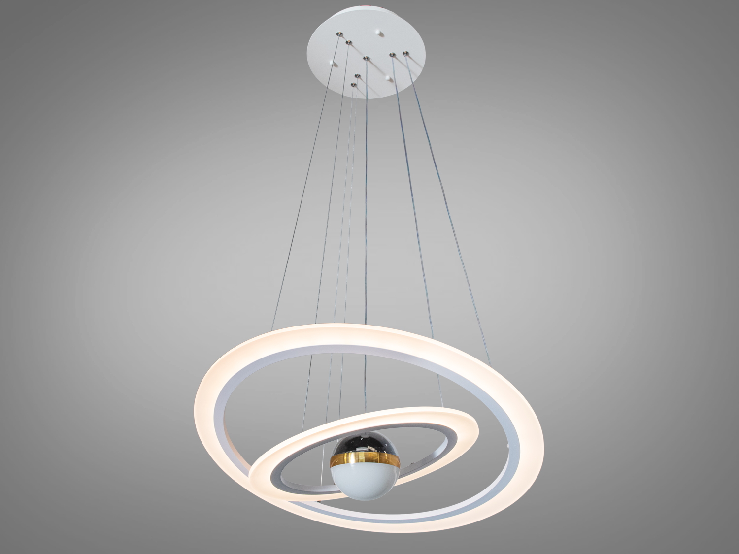 Люстра має унікальну форму з центральною кулею, що відтворює ефект зоряного неба, додаючи таємничості вашому інтер’єру. Акрилові дифузори забезпечують рівномірне розсіювання світла, що робить атмосферу затишною та приємною.