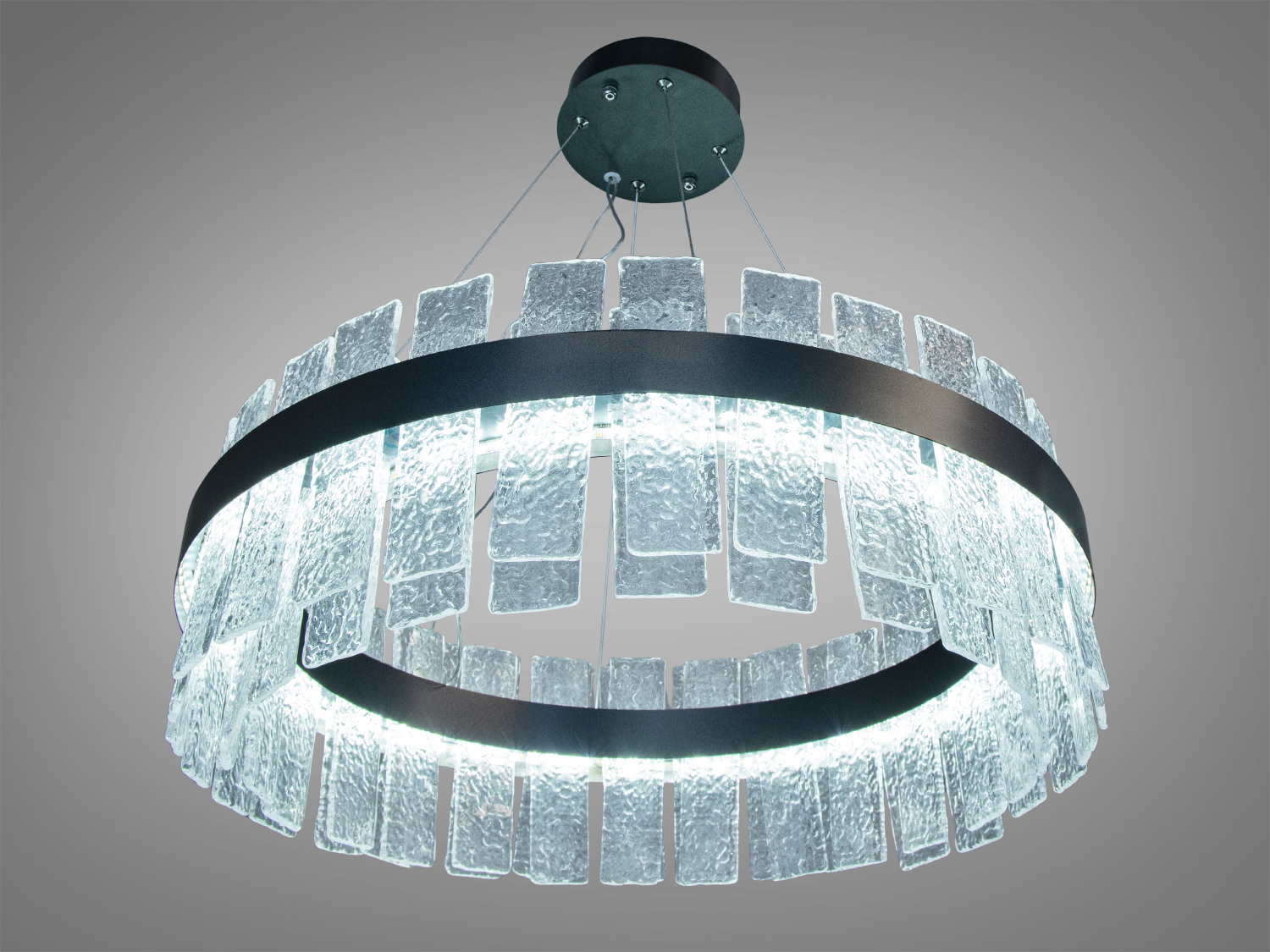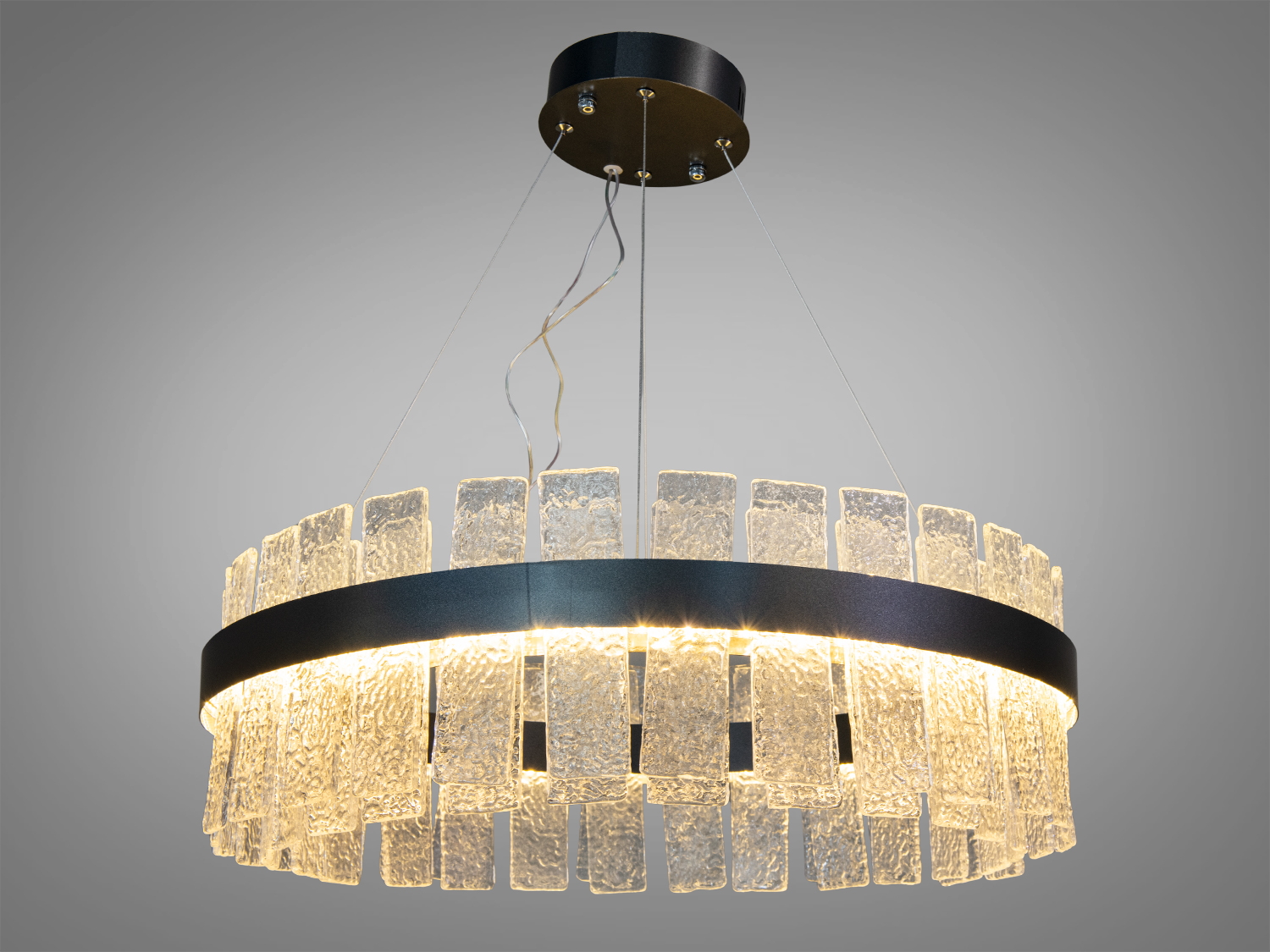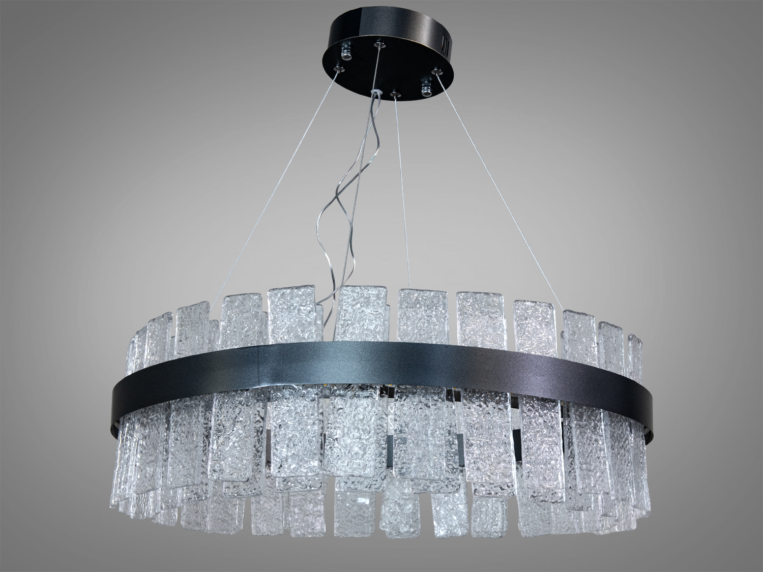 Люстра має круглу форму з текстурованими скляними панелями, що відбивають і заломлюють світло, створюючи унікальну гру тіней. Металевий каркас забезпечує надійну фіксацію на стелі, а його міцність гарантує довговічність виробу.