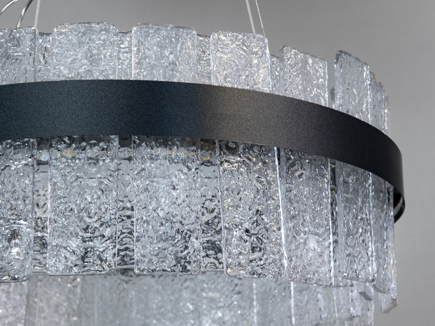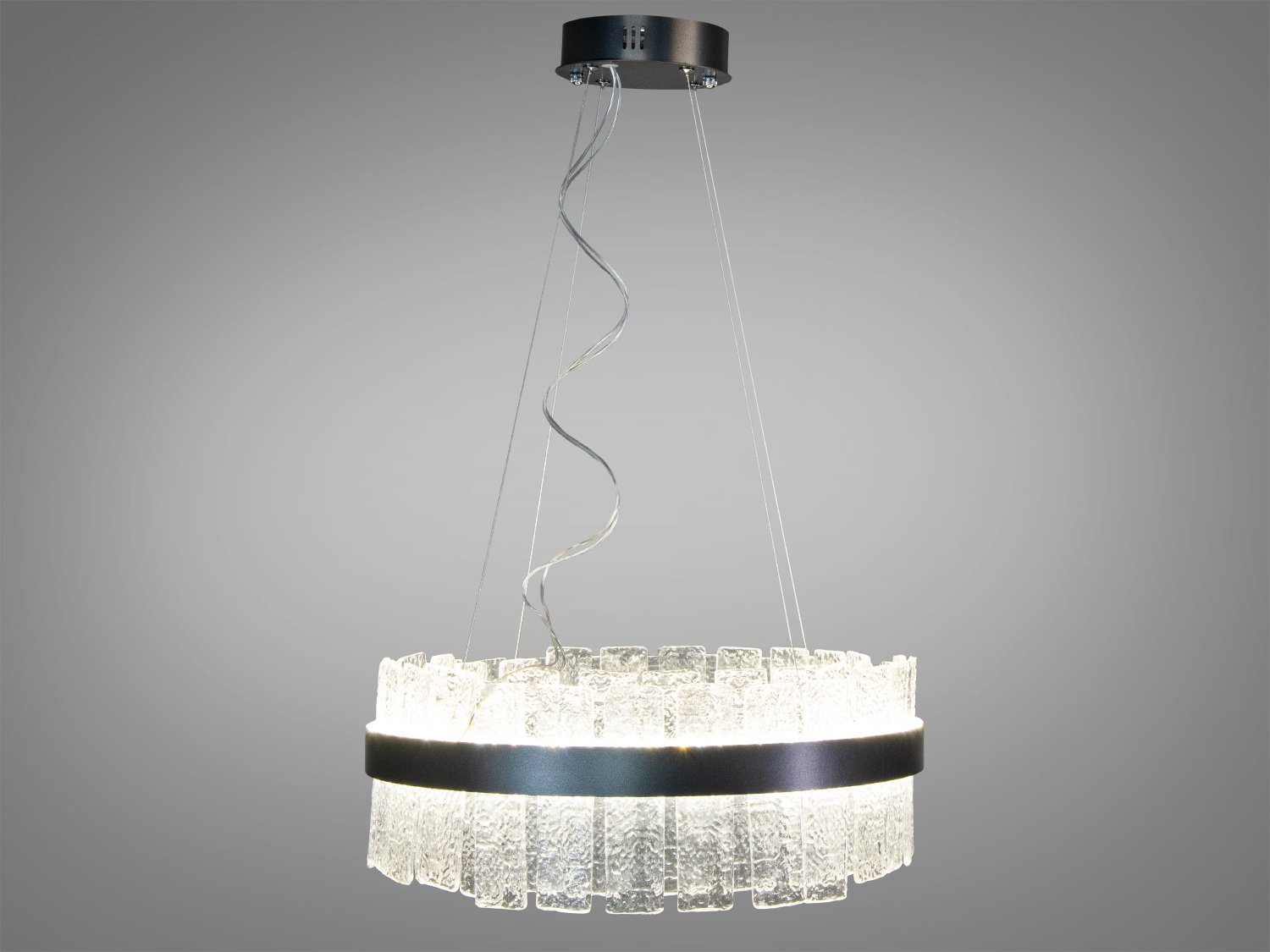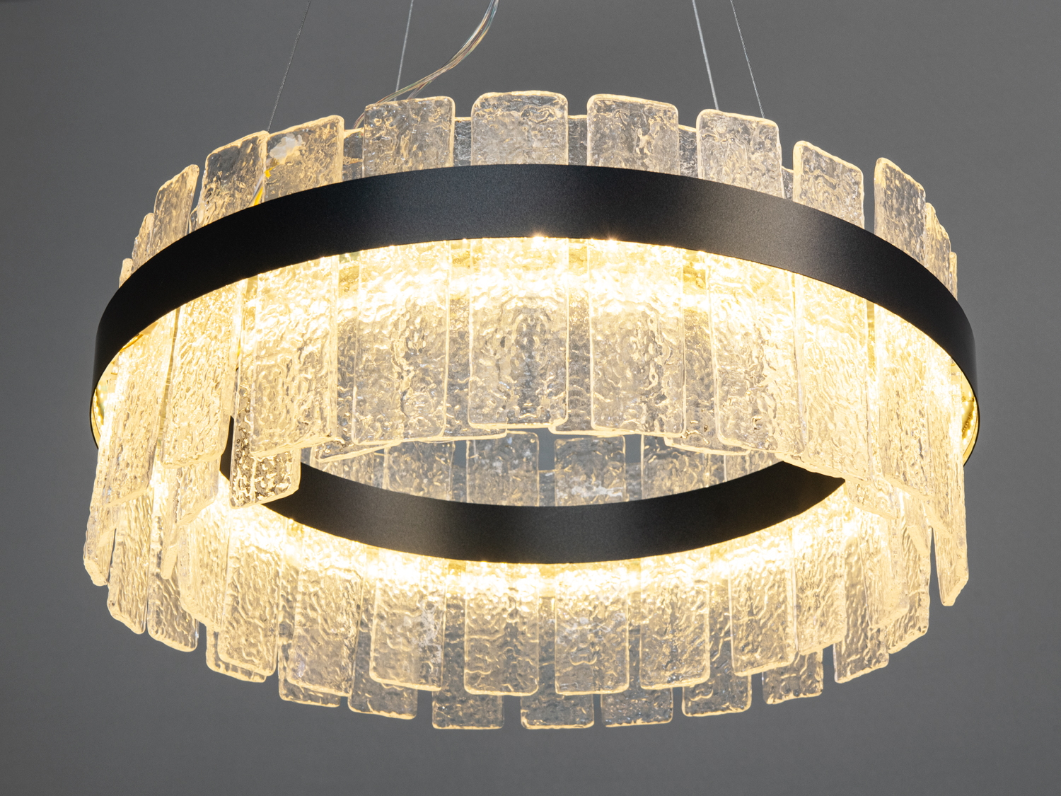 Люстра виконана в круглій формі та виготовлена з високоякісних матеріалів, які забезпечують її міцність і довговічність. Кришталеві панелі вражають прозорістю та блиском, створюючи ефект розкішного освітлення.