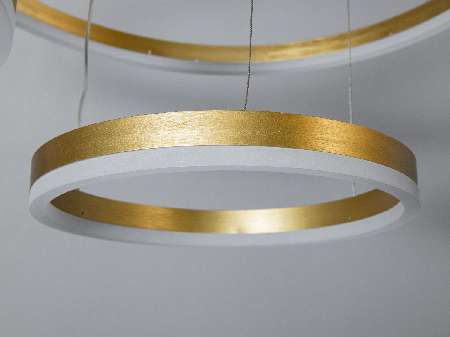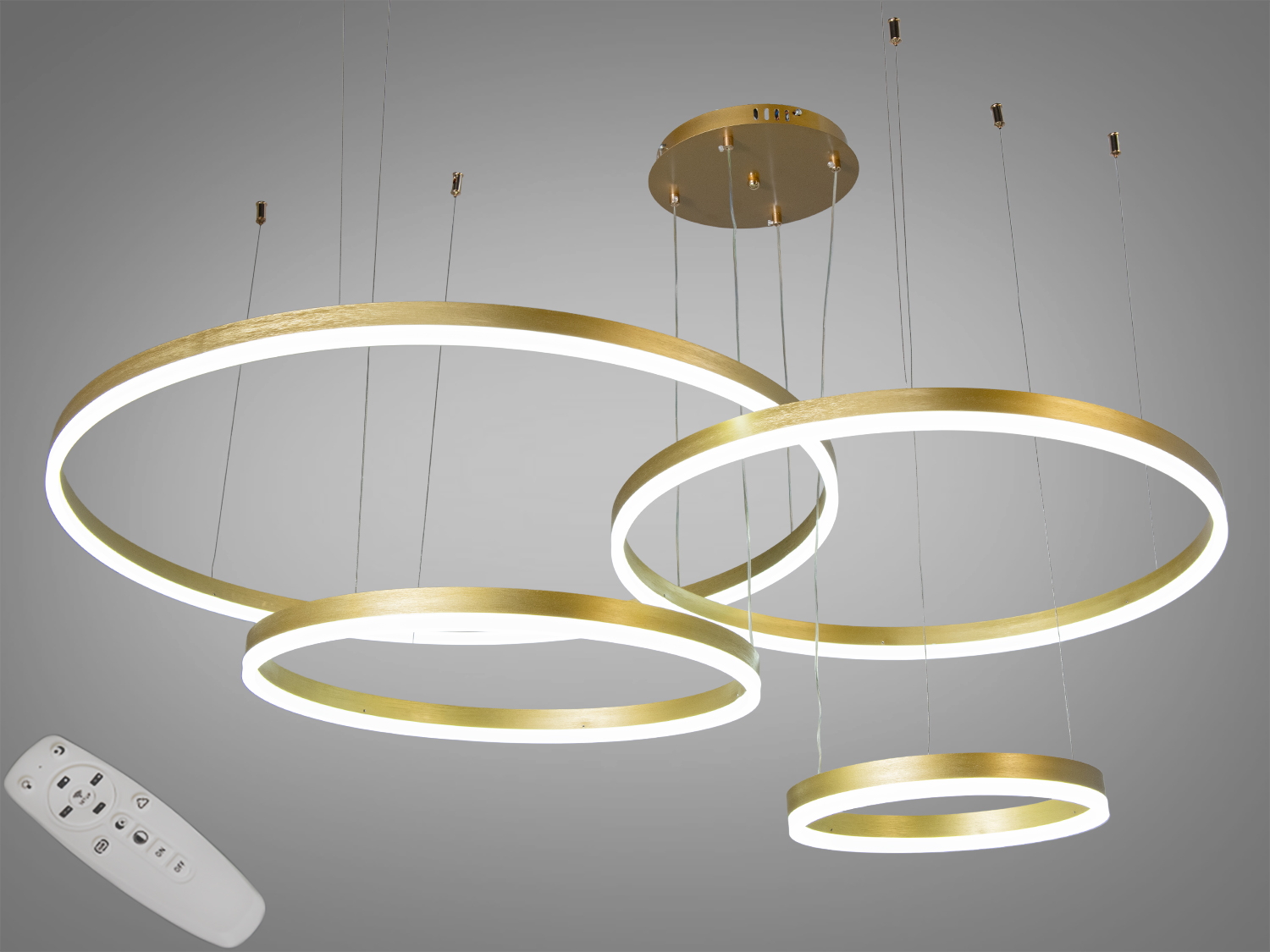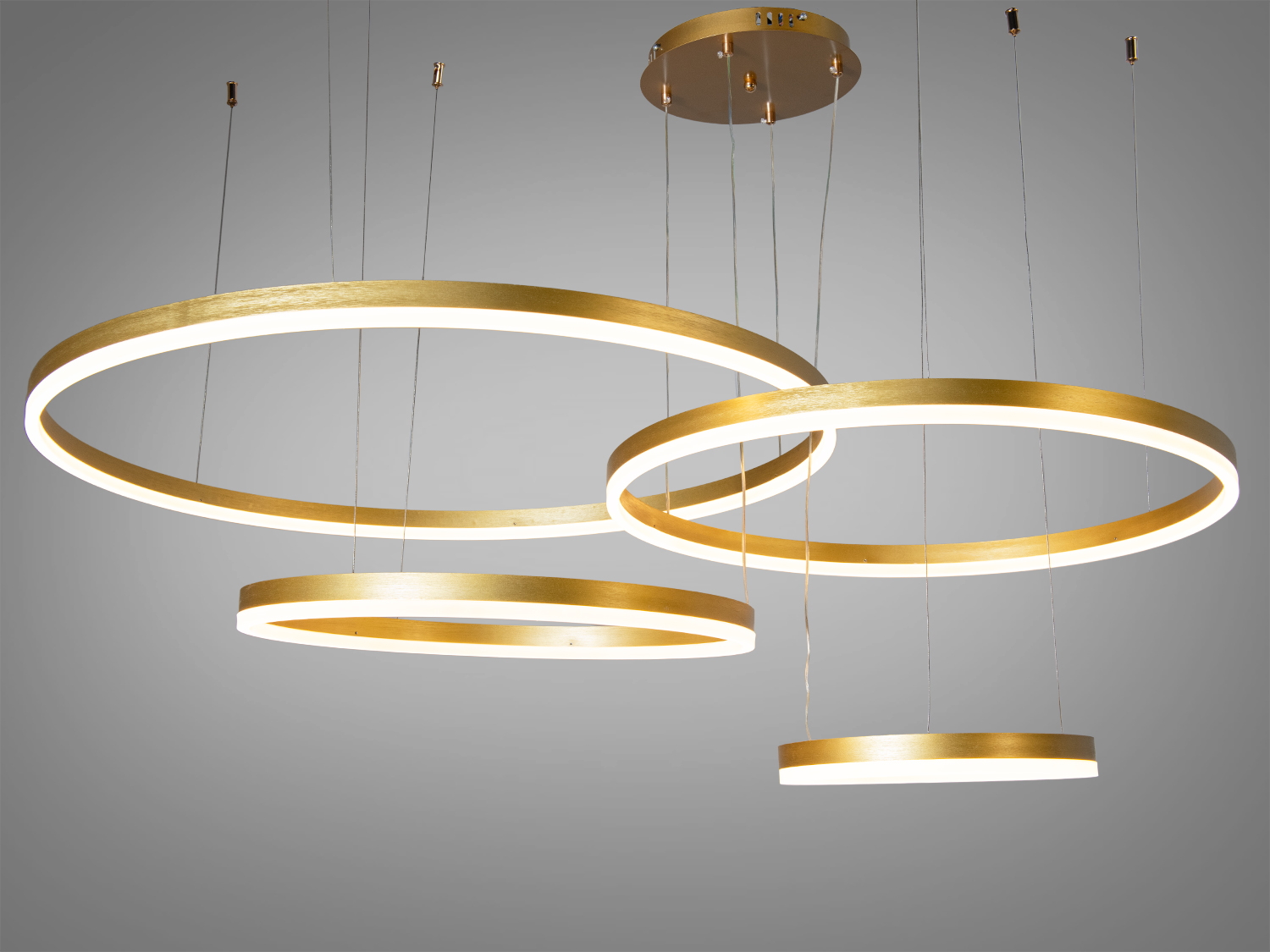 Ця люстра має чотири кільця різного діаметра (30 см, 50 см, 60 см, 80 см), які створюють унікальний візуальний ефект. Підвішені на тонких тросах, кільця додають динамічності та легкості в дизайн.