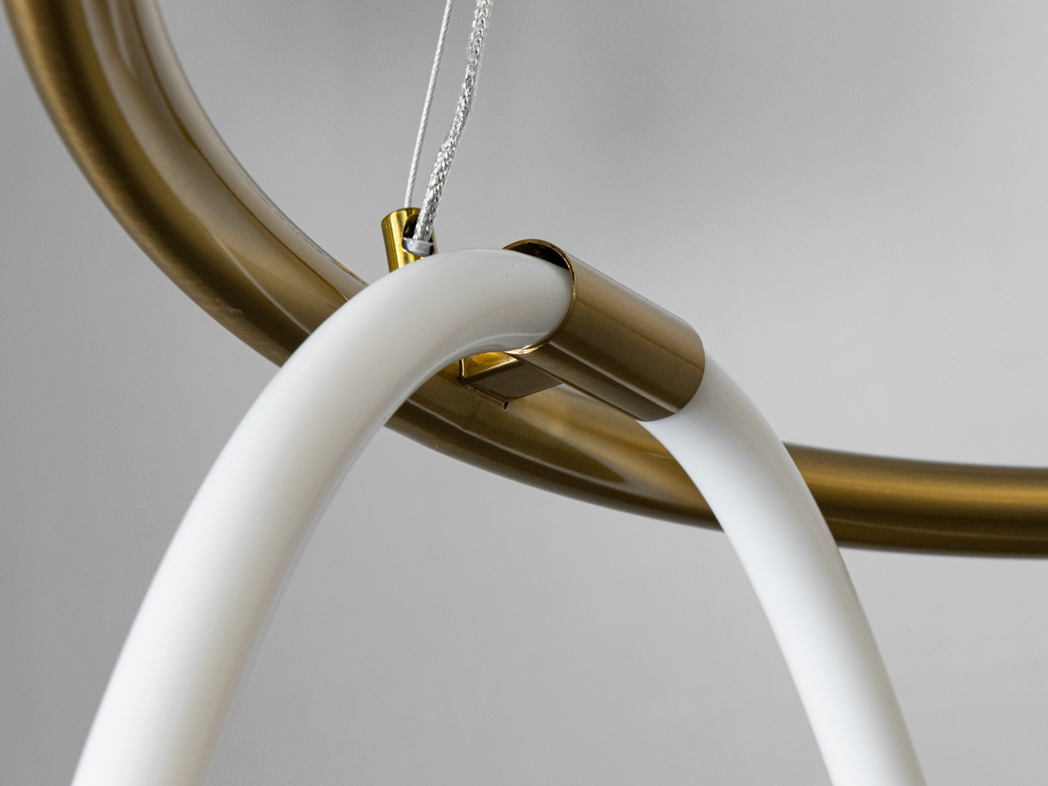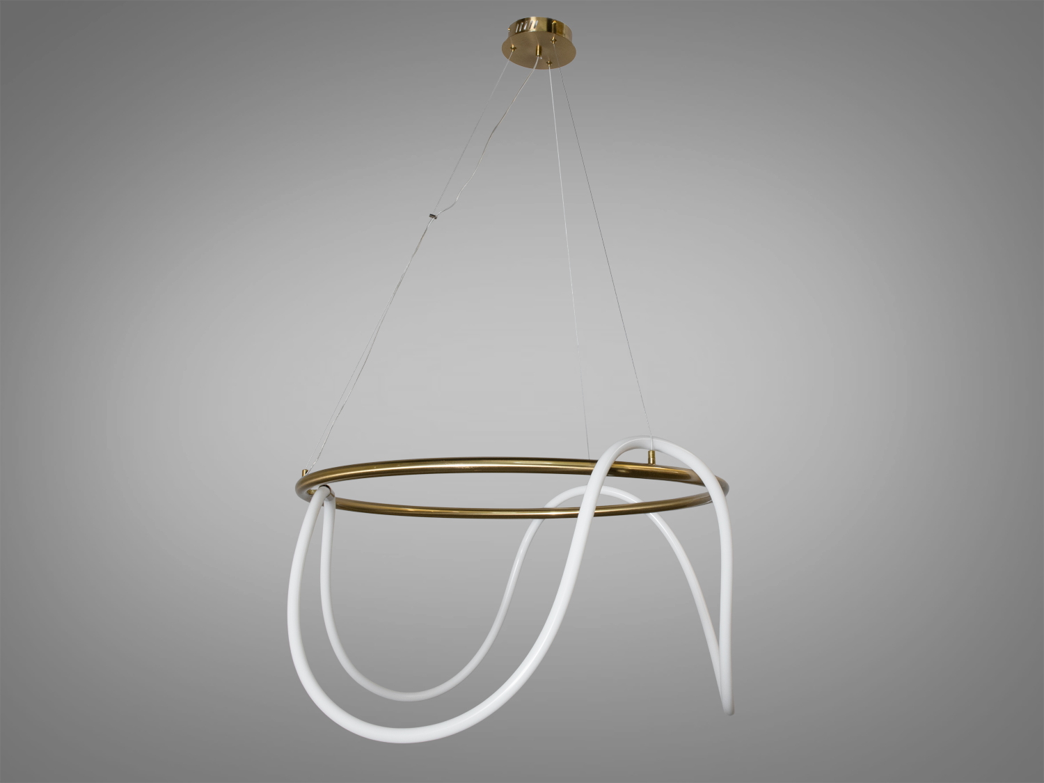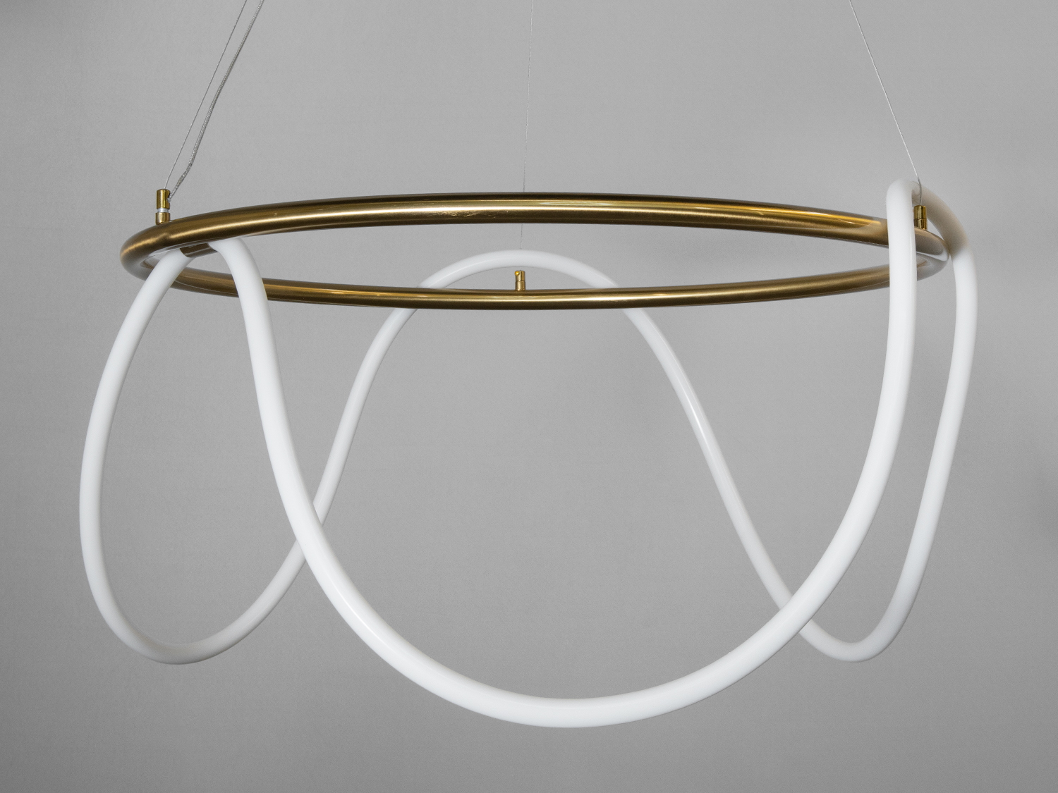 Люстра має унікальну конструкцію з білими LED трубками, які формують абстрактну форму навколо золотистого кільця. Така конструкція не лише приваблює увагу, але й забезпечує рівномірне розсіювання світла.