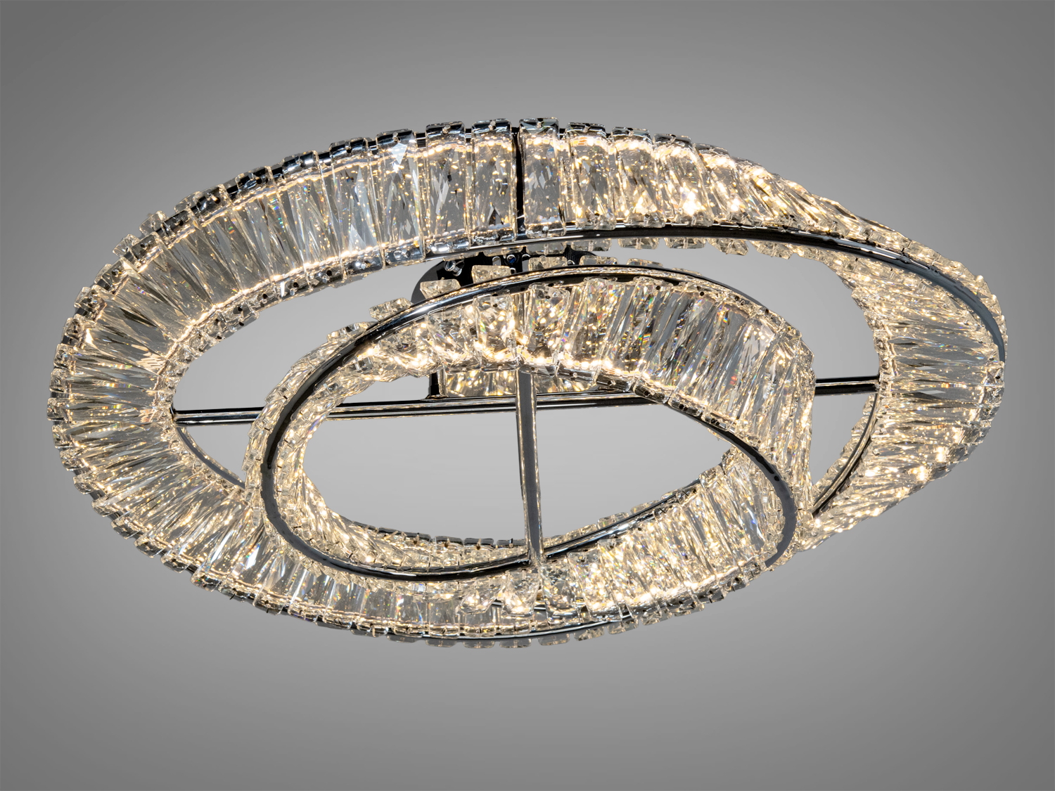 Люстра виготовлена в стилі стрічки Мебіуса, що надає їй унікальний вигляд. Два плафони створюють безперервний візерунок, а хромована поверхня додає сучасності.