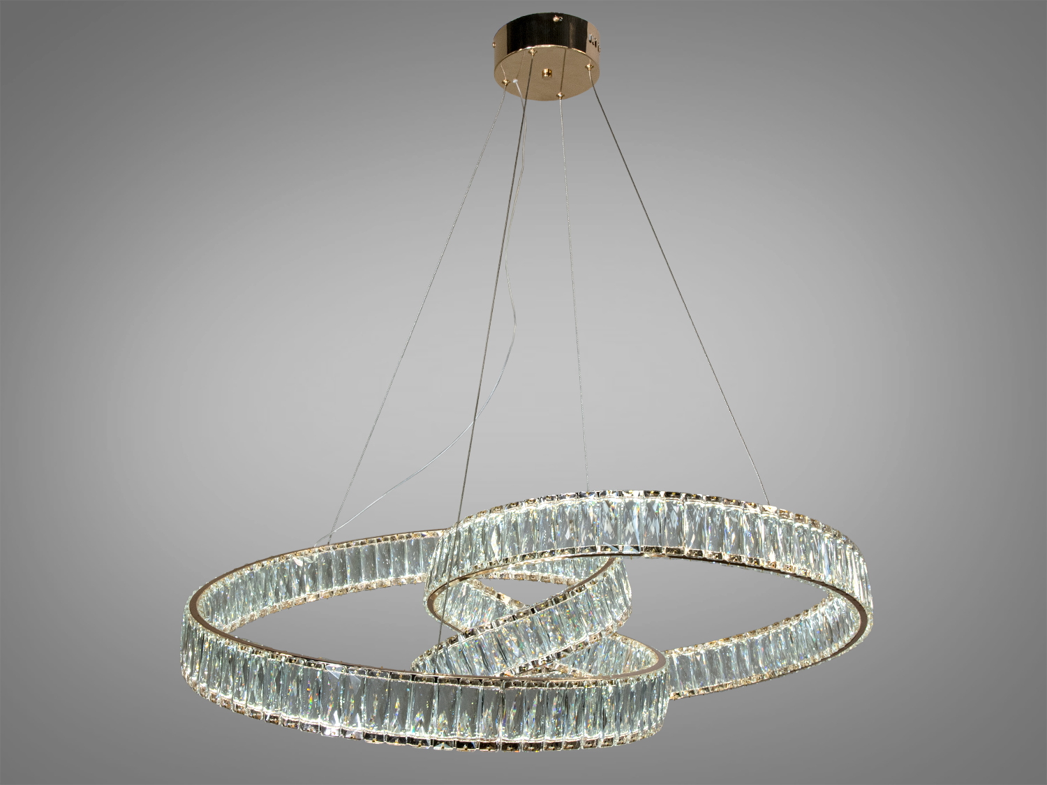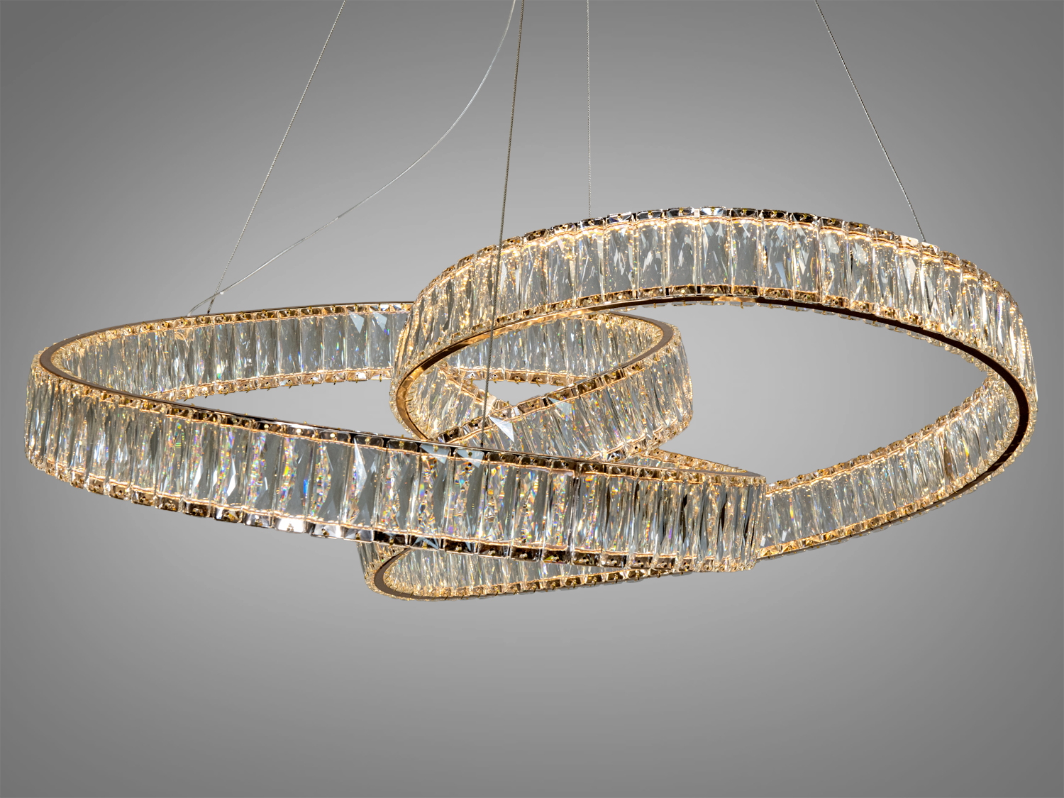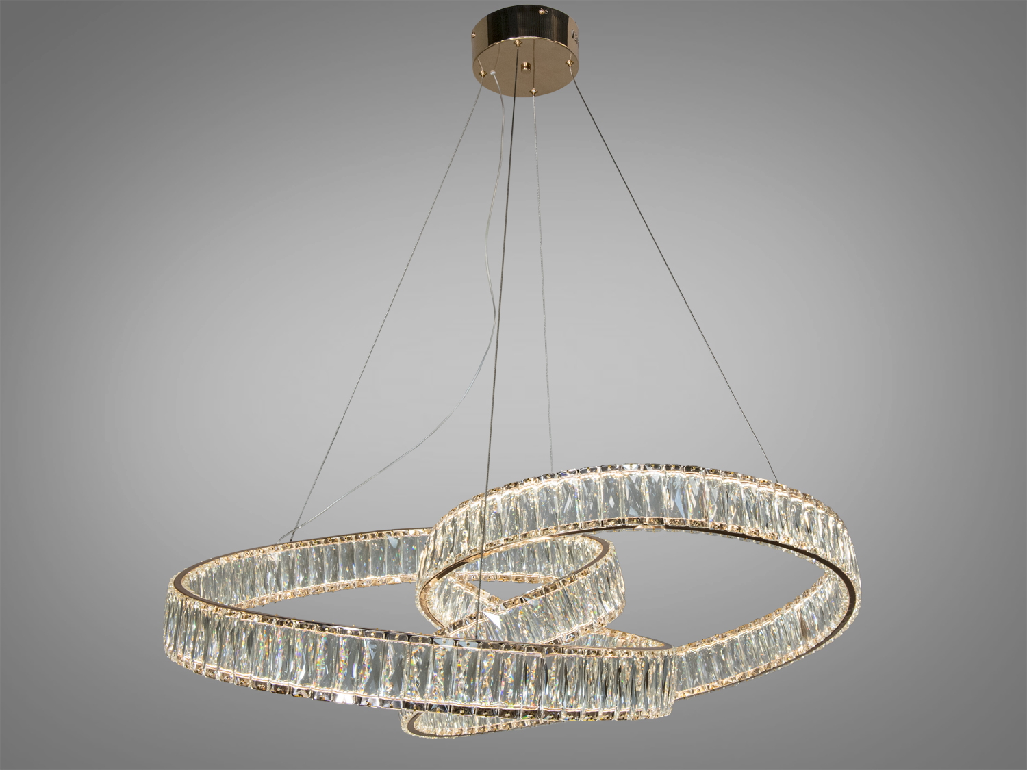 Ця дизайнерська люстра має три переплетені кільця з блискучого кришталю, підвішені на тонких тросах, створюючи ефект невагомості. Хромовані поверхні підкреслюють сучасний стиль, а золотистий колір додає розкіш.