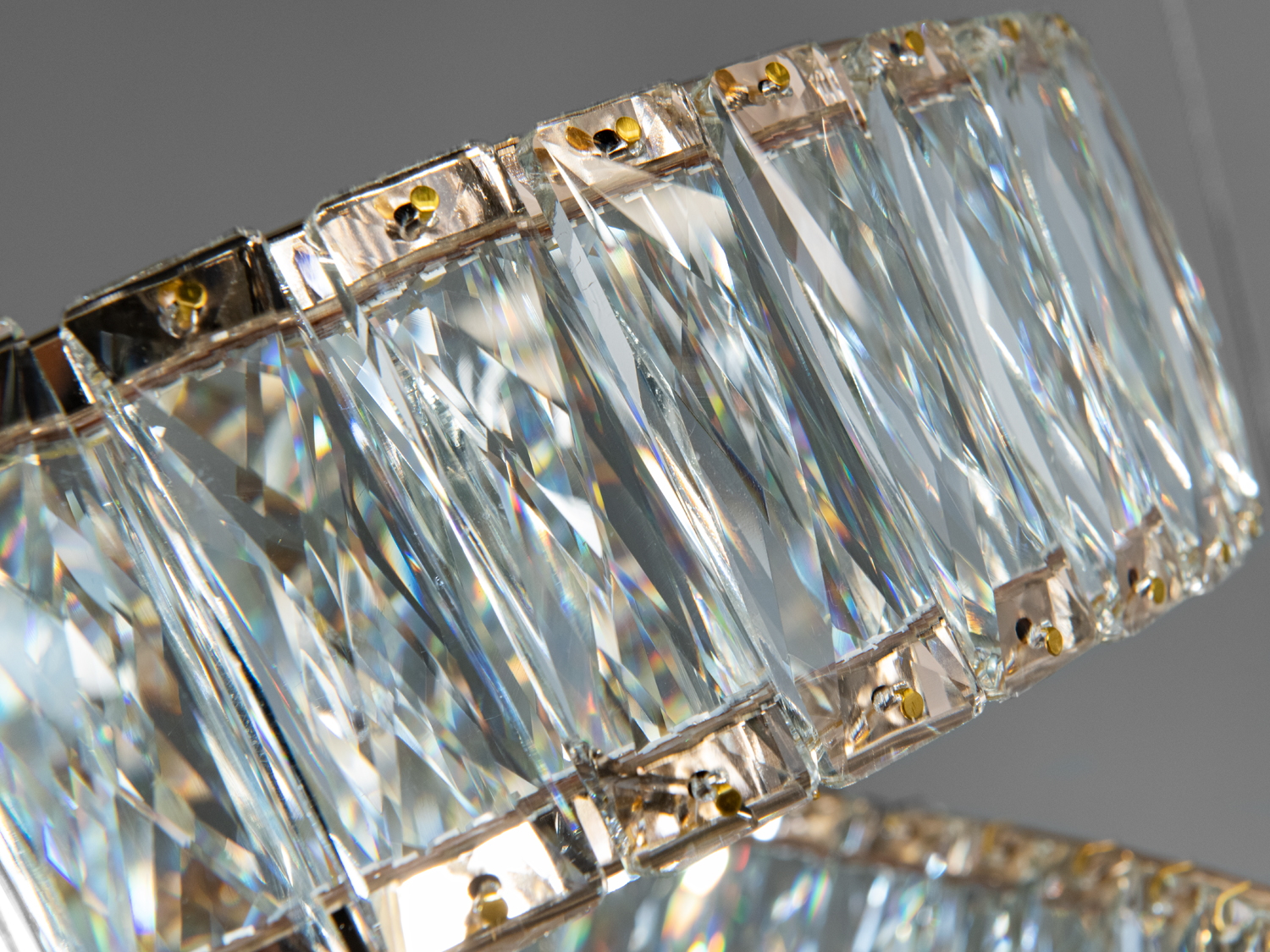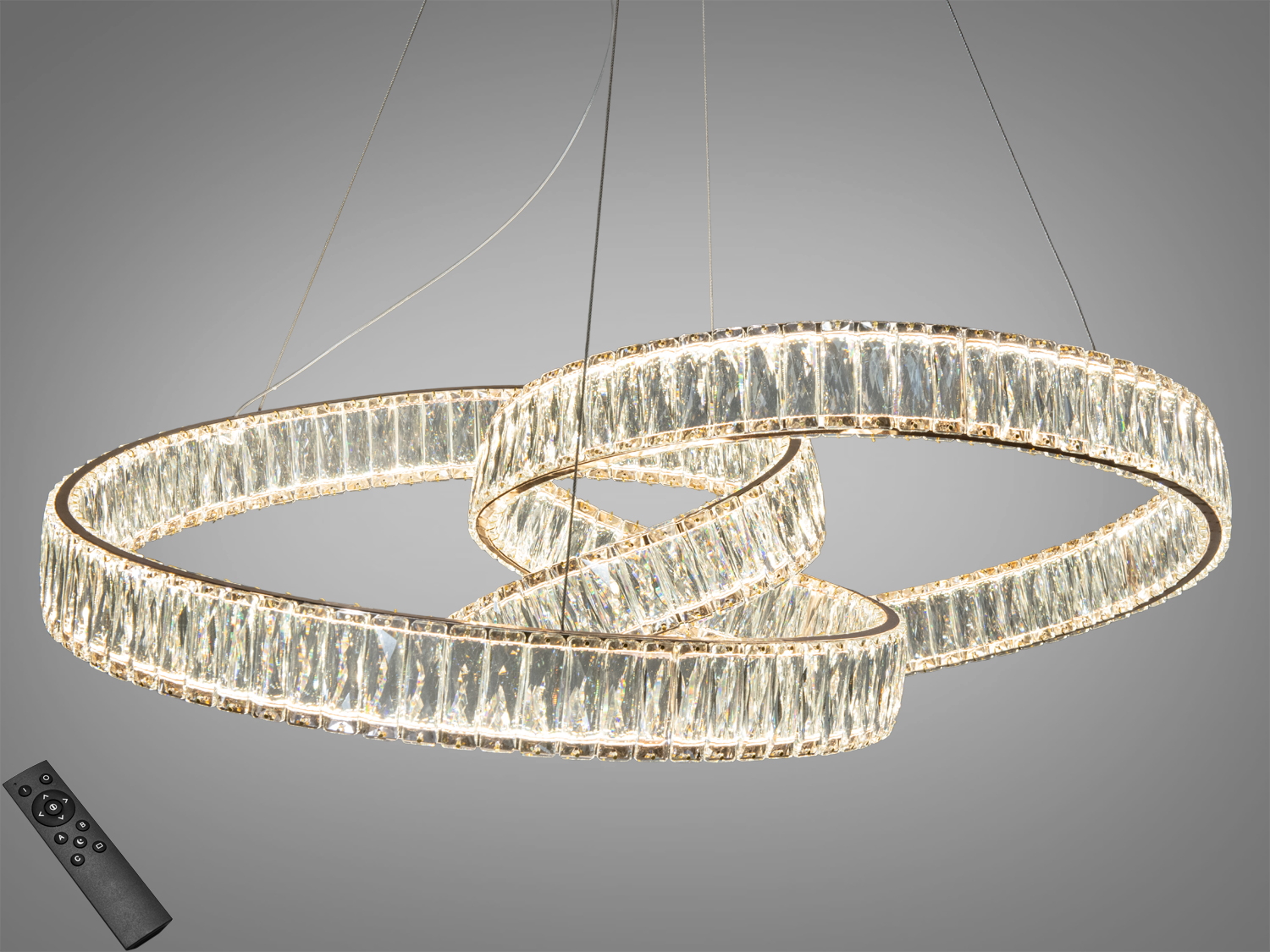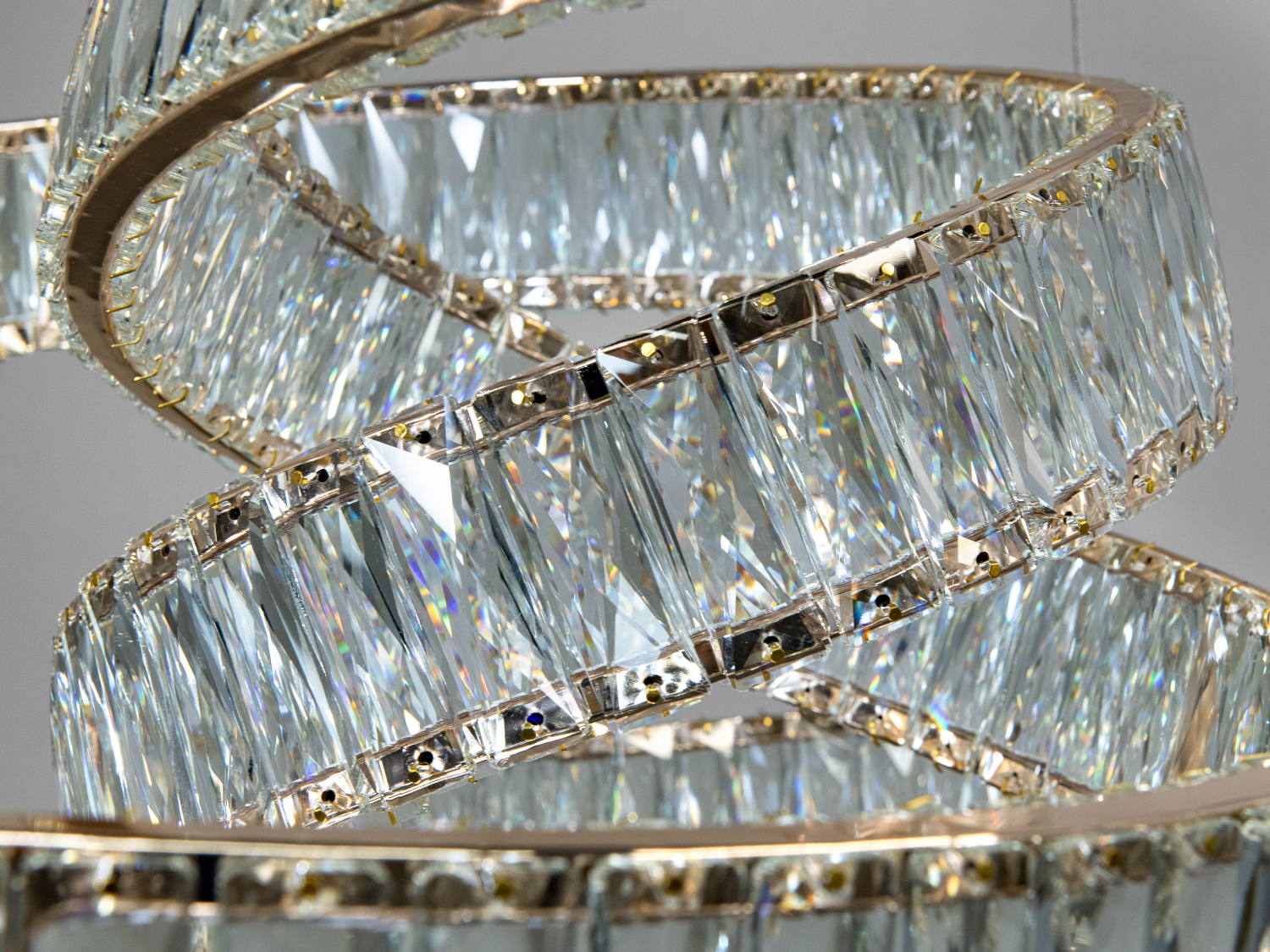 Ця дизайнерська люстра має три переплетені кільця з блискучого кришталю, підвішені на тонких тросах, створюючи ефект невагомості. Хромовані поверхні підкреслюють сучасний стиль, а золотистий колір додає розкіш.