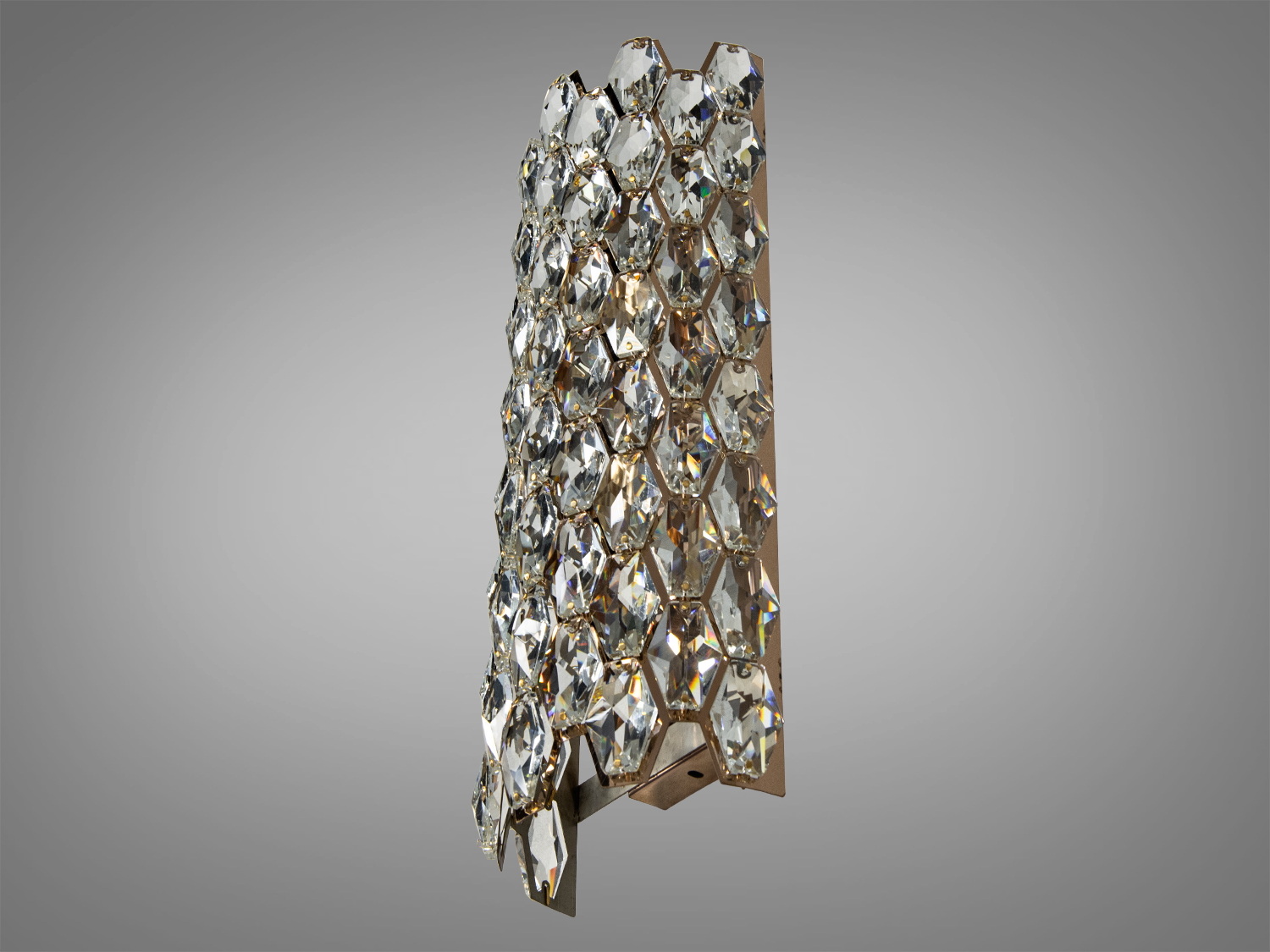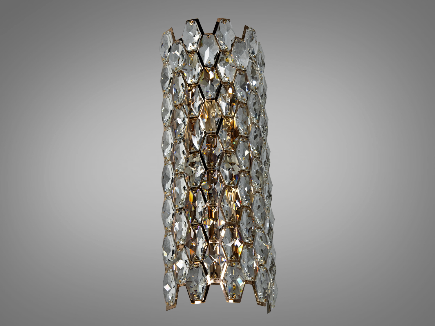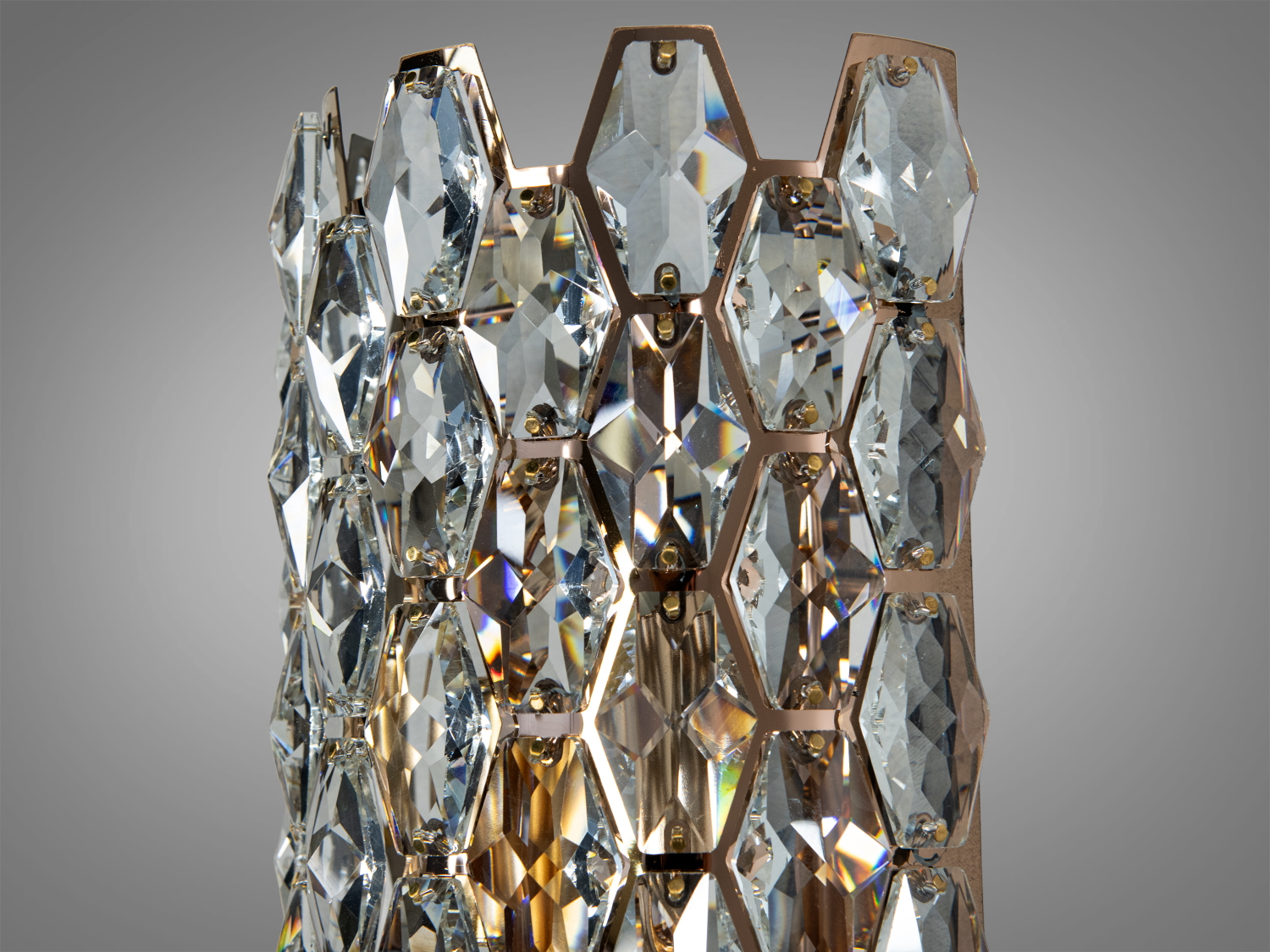 Світильник має циліндричну форму з прозорими кристалами, які створюють ефект розсіювання світла. Золота основа надає йому благородного вигляду, а багатогранні кристали створюють чарівне мерехтіння, яке захоплює з першого погляду.