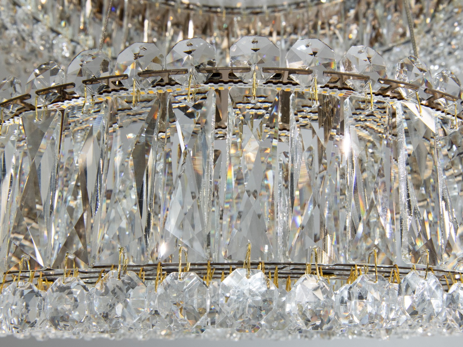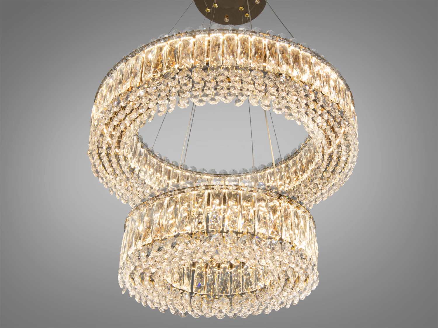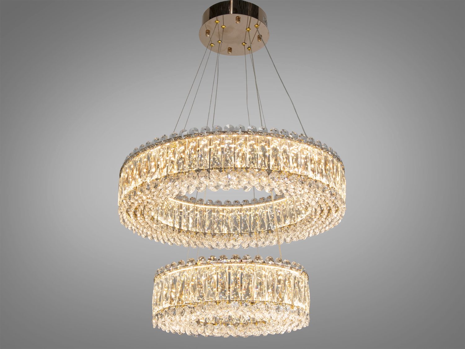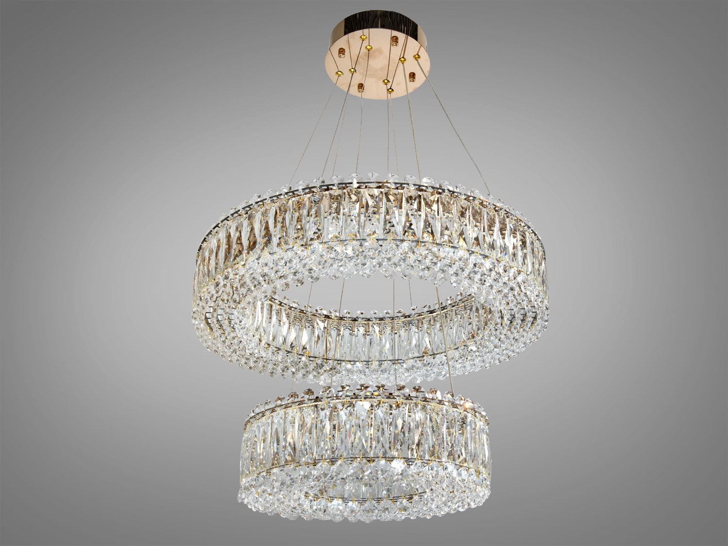 Два кільця люстри прикрашені прозорими кристалами, які чудово відбивають світло, створюючи гру блисків. Золото надає виробу сучасного та розкішного вигляду.