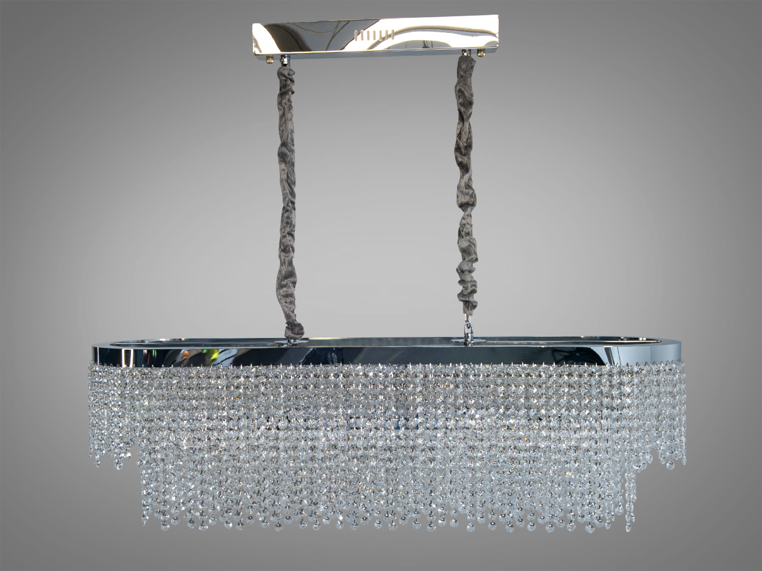 Ця кришталева люстра з хромованою основою втілює сучасний стиль та елегантність. Вона підходить для створення затишної атмосфери у вітальні або їдальні. Завдяки своїй прямокутній формі та підвісці на текстильних тросах, люстра стає центральним елементом інтер'єру, привертаючи увагу та захоплення гостей.