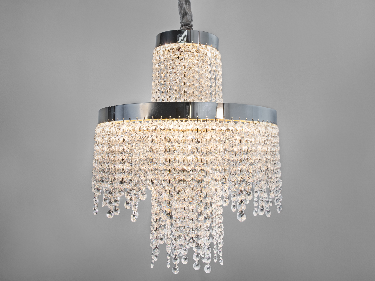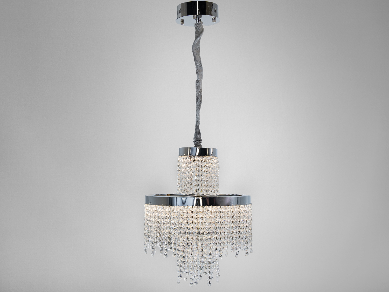 Люстра має два рівні кришталевих підвісок, які створюють ефект водоспаду. Така конструкція додає інтер'єру вишуканості та розкішності, привертаючи увагу та створюючи неповторну атмосферу.
