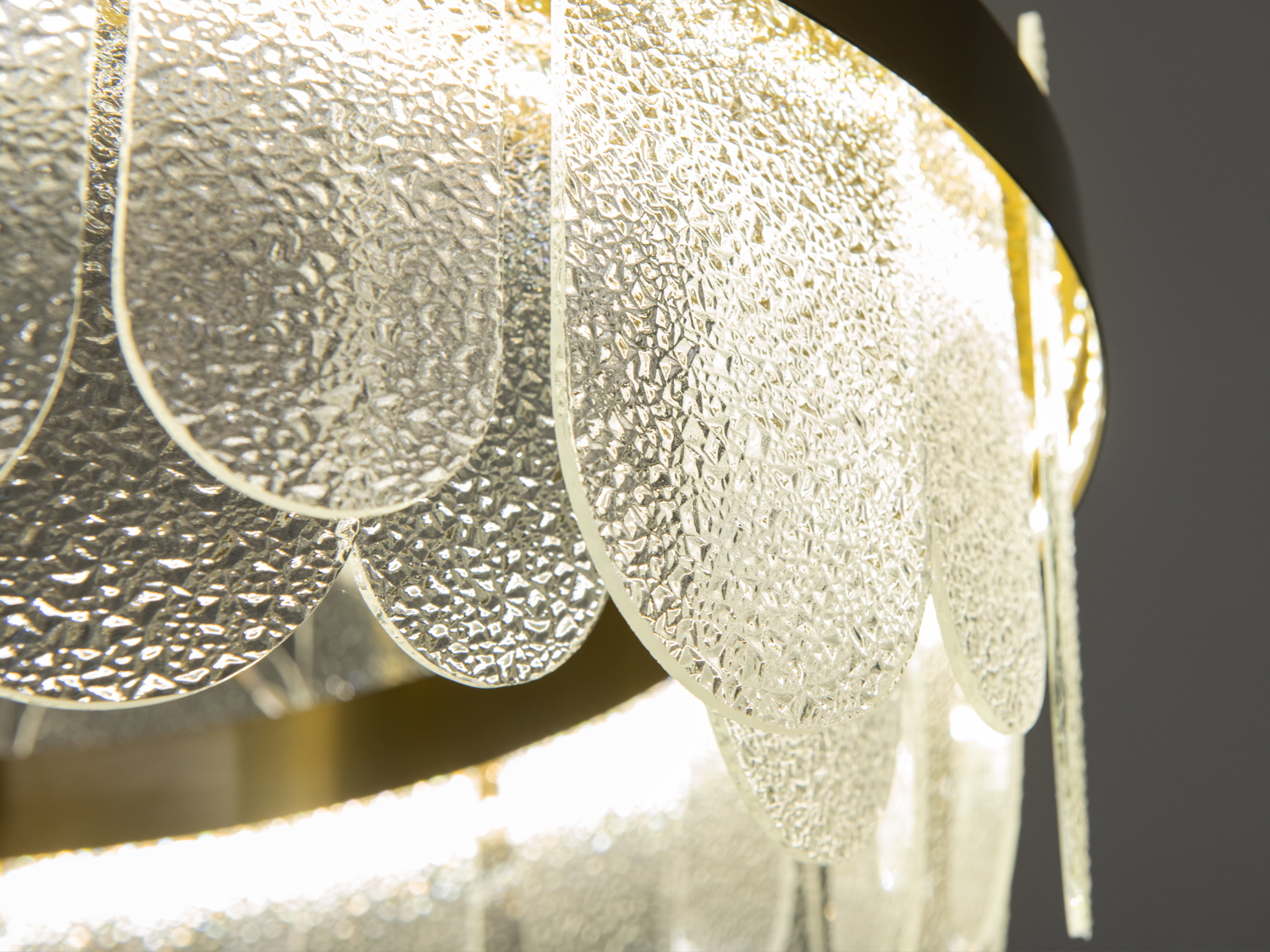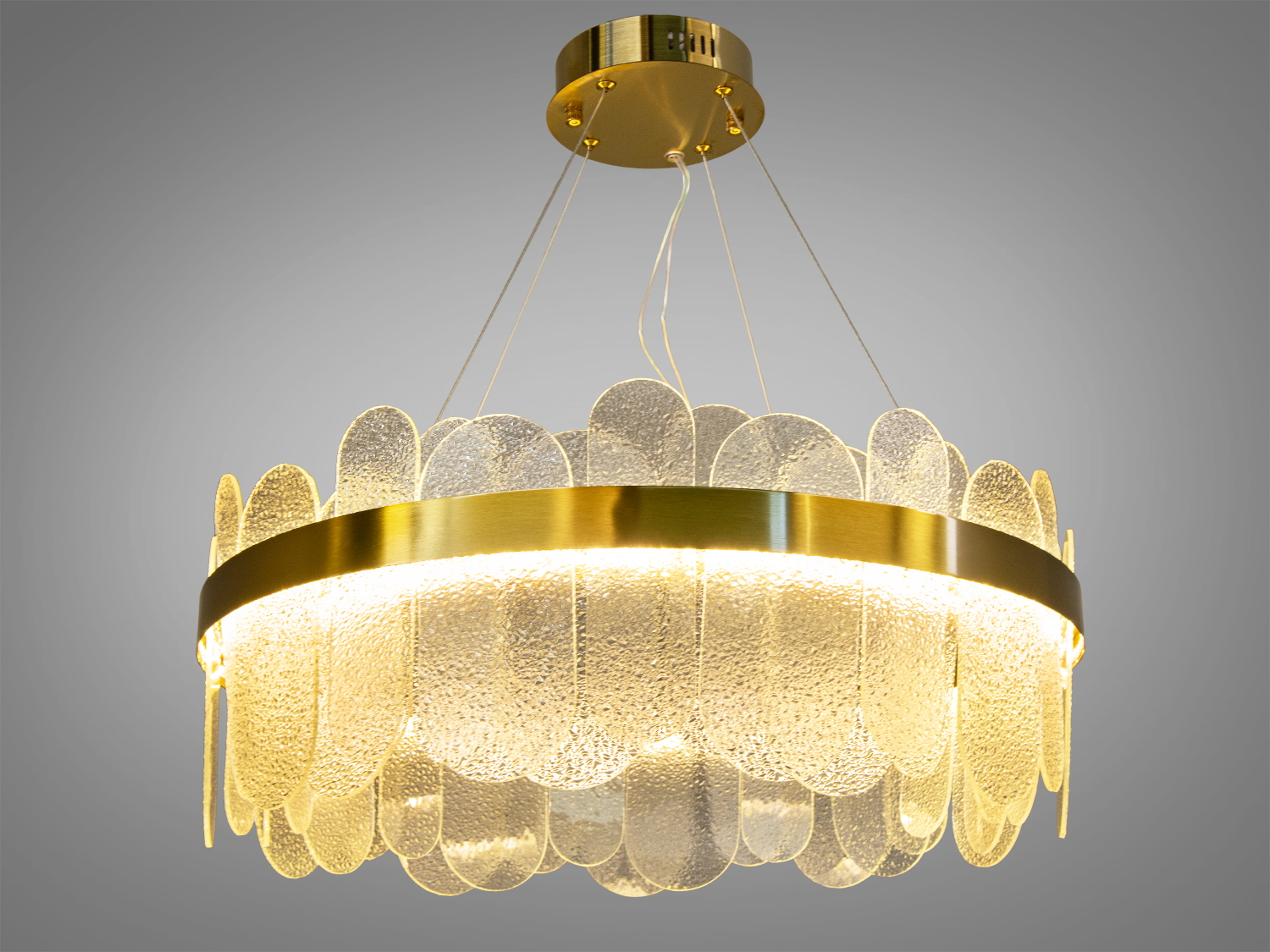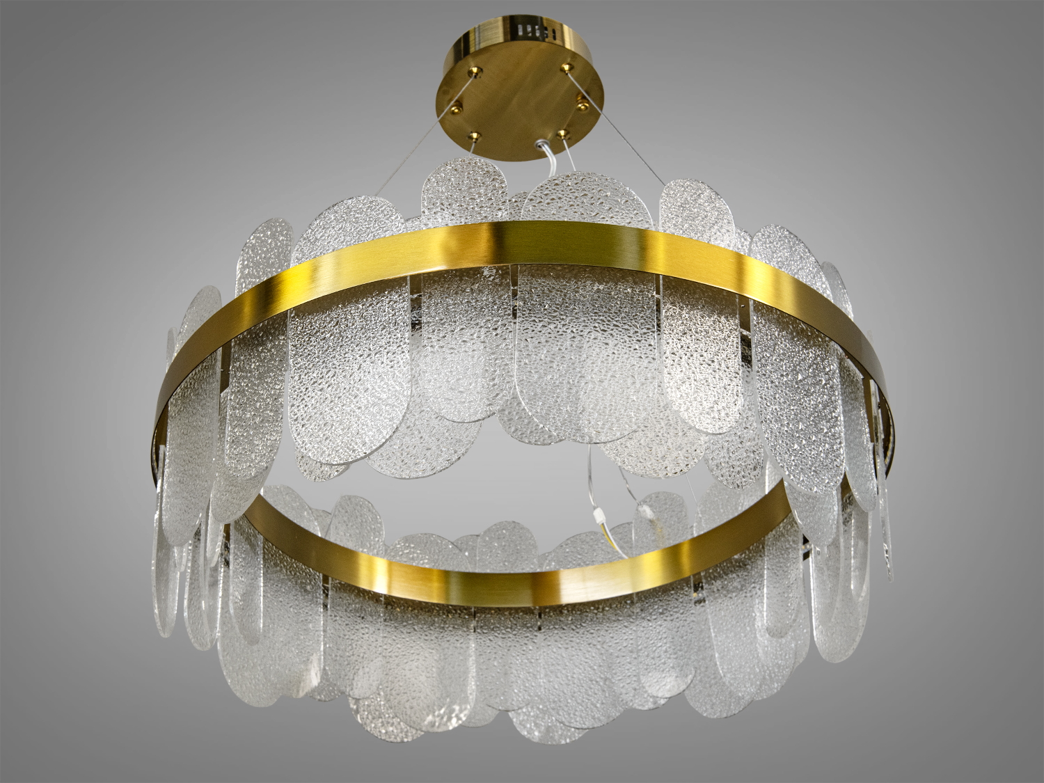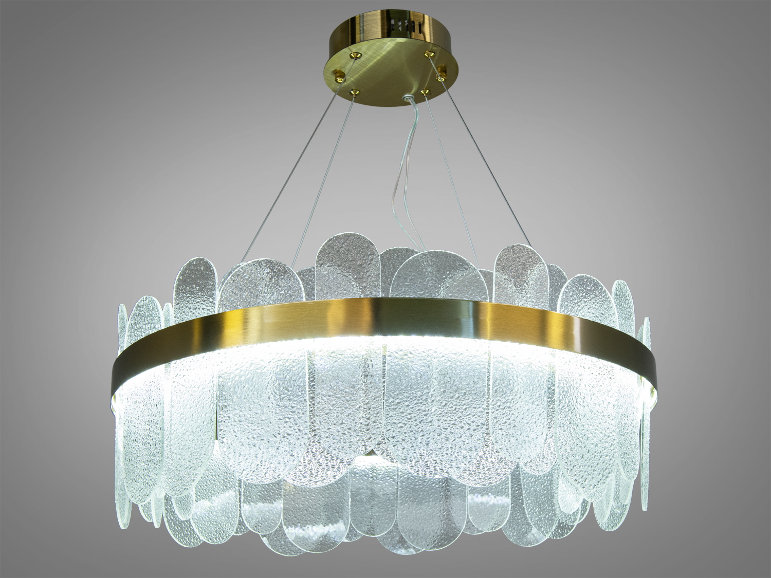 Люстра має елегантну круглу форму із золотистим обідком, який підкреслює її вишуканість. Матеріал каркасу — метал, а скляні панелі виконані з кришталю, що забезпечує високу якість та довговічність.