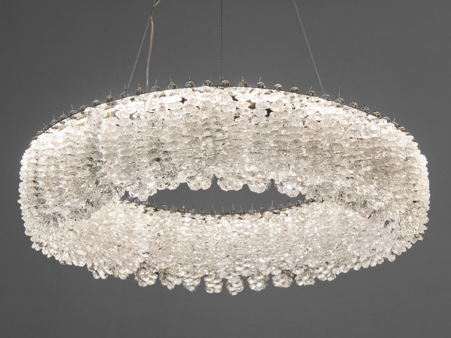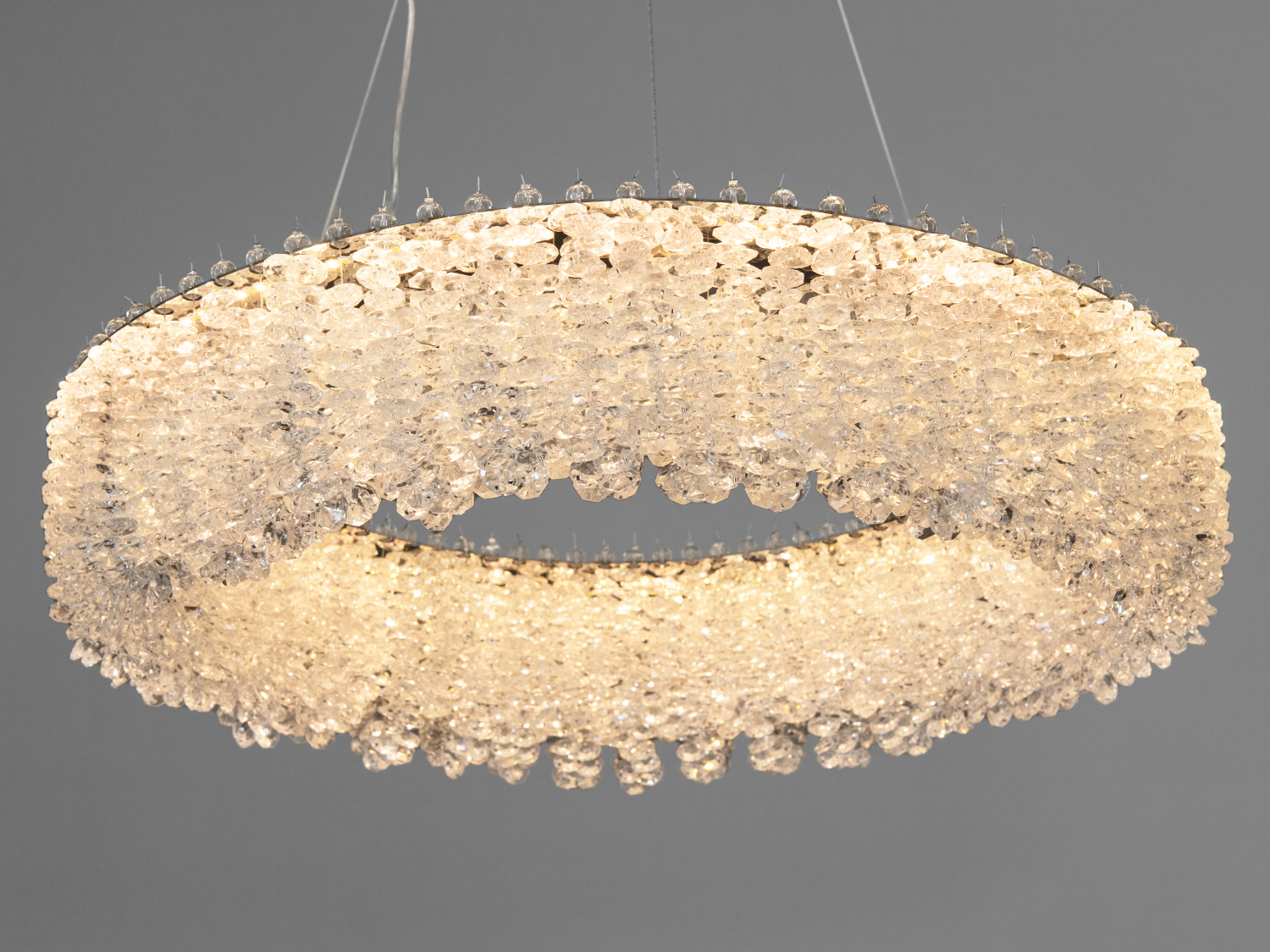 Люстра виконана у формі кільця з прозорими кришталевими підвісками, які відбивають і розсіюють світло, створюючи ефект сяйва. Хромовані елементи надають їй сучасного вигляду.
