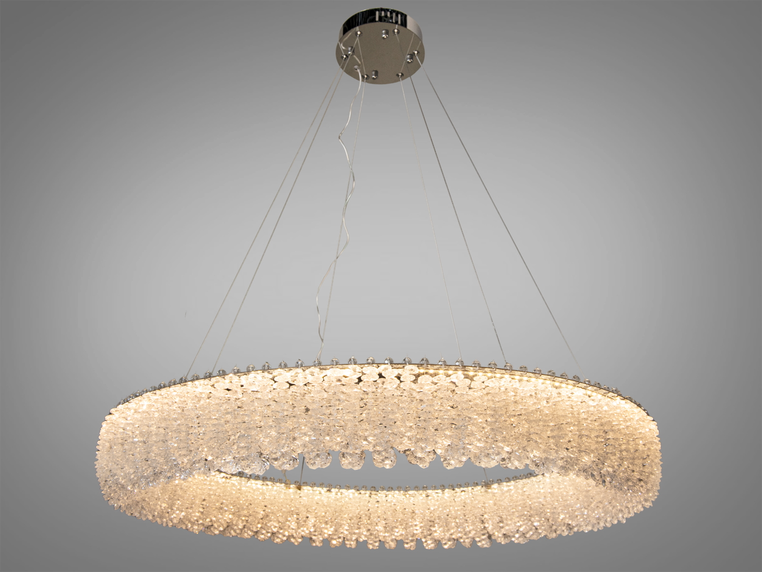 Люстра виготовлена з високоякісного хрому та прозорого кришталю, що створює вражаючий блиск і підкреслює сучасний стиль. Дві кільцеві конструкції прикрашені кришталевими підвісками, що відбивають світло на всі сторони.