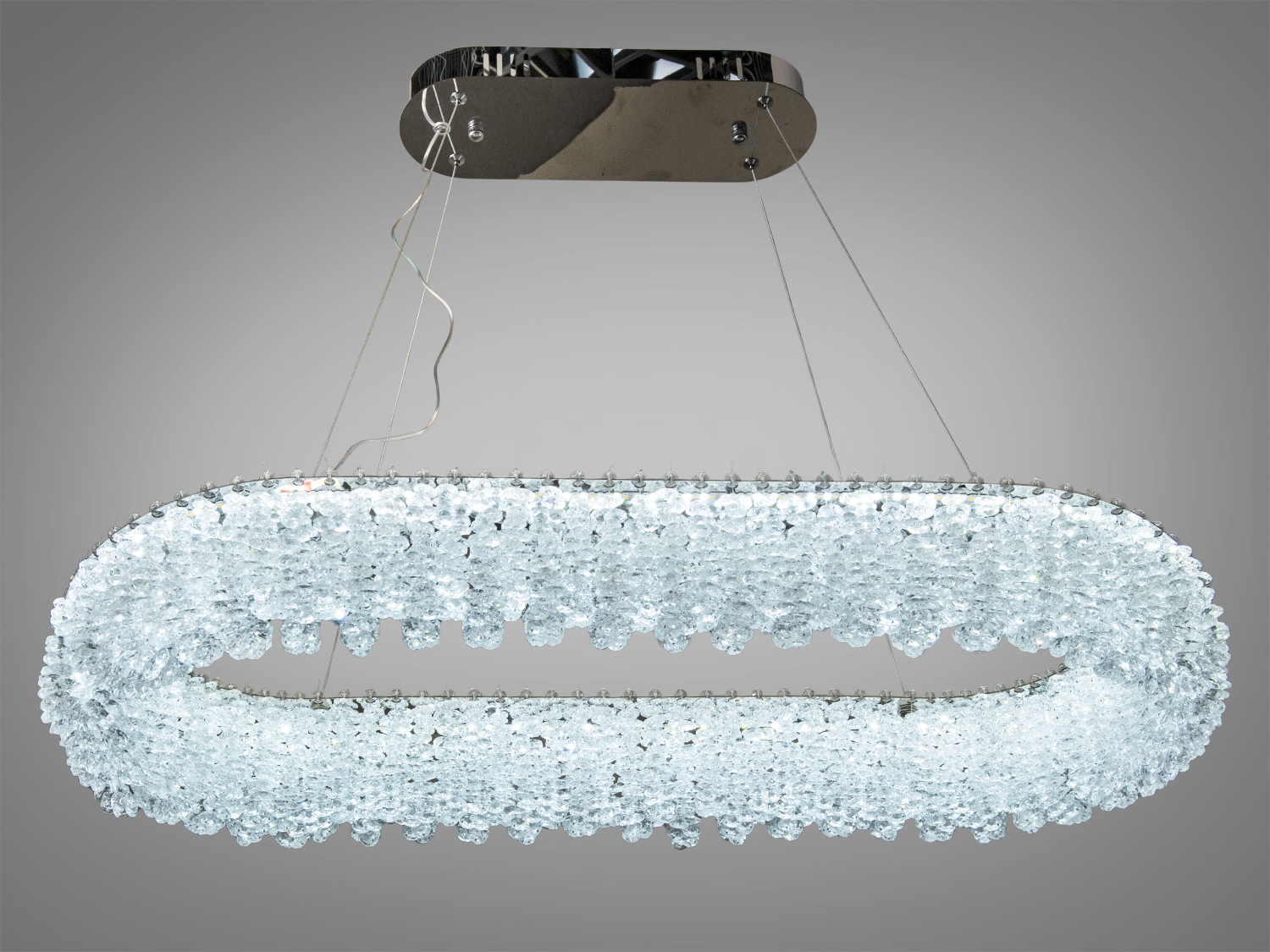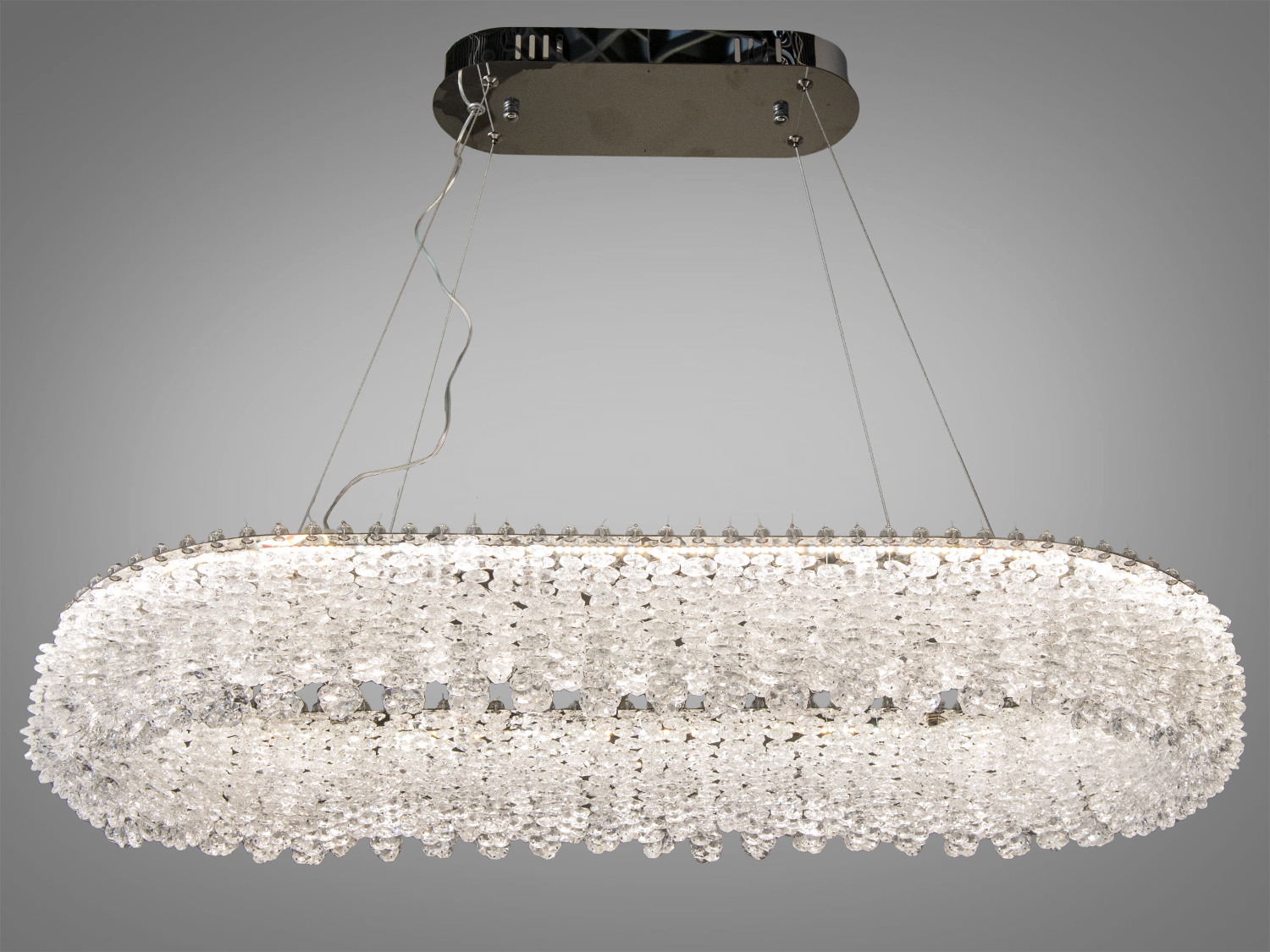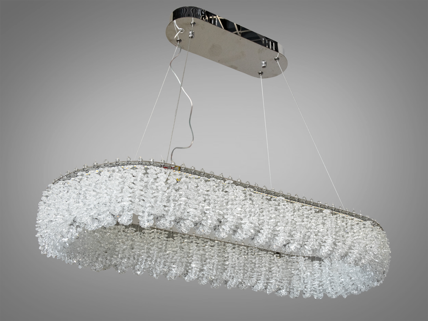Люстра має овальну форму, що додає їй унікальності і дозволяє гармонійно вписатися в будь-яку кімнату. Прозорі кришталеві елементи створюють ефект блиску, розсіюючи світло і створюючи чарівну атмосферу.