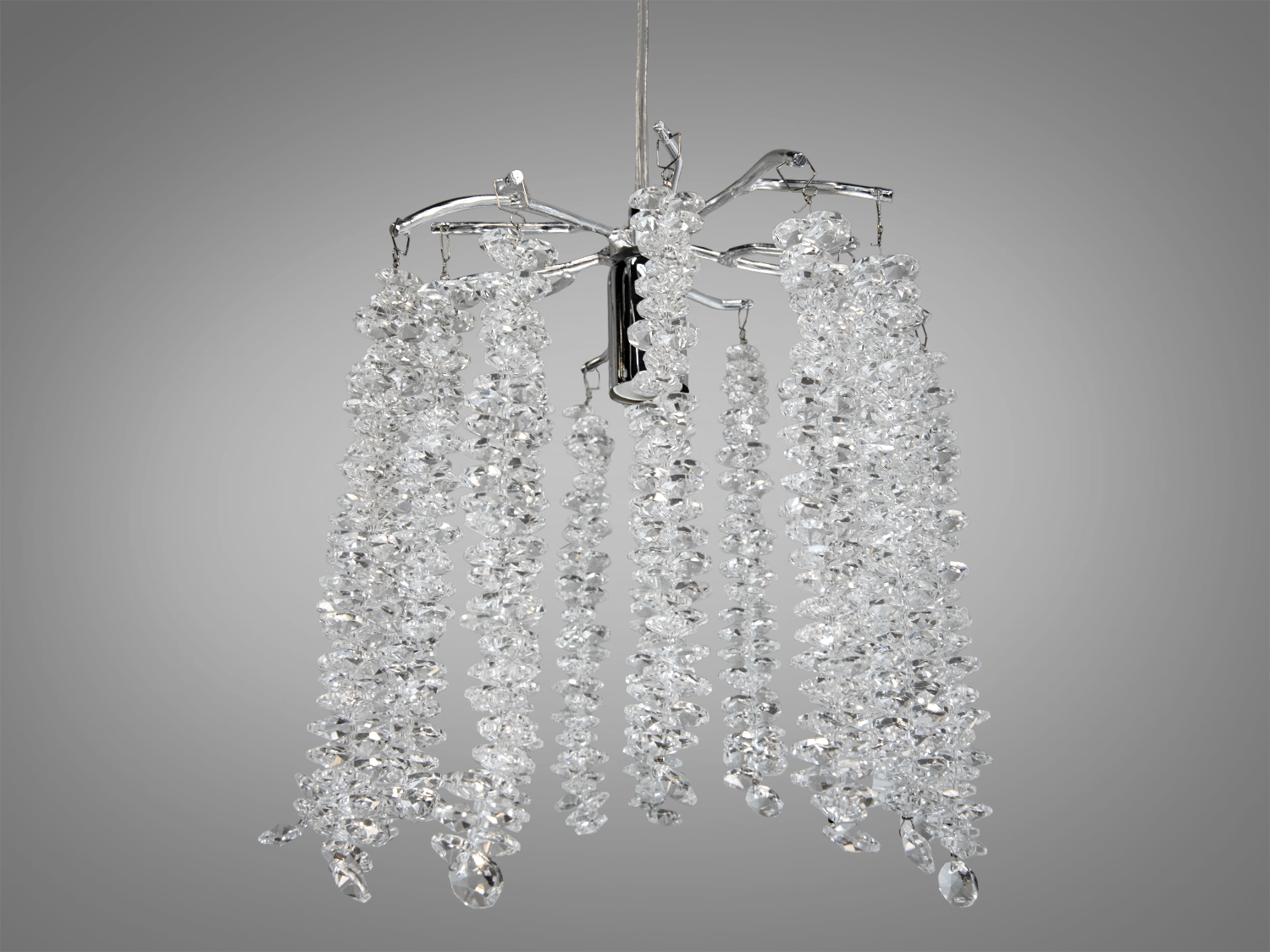 Світильник виконаний у мінімалістичному стилі з елементами розкоші. Кришталеві підвіски додають нотку елегантності, відбиваючи світло та створюючи мерехтливий ефект. Хромоване покриття надає сучасного вигляду і забезпечує довговічність.