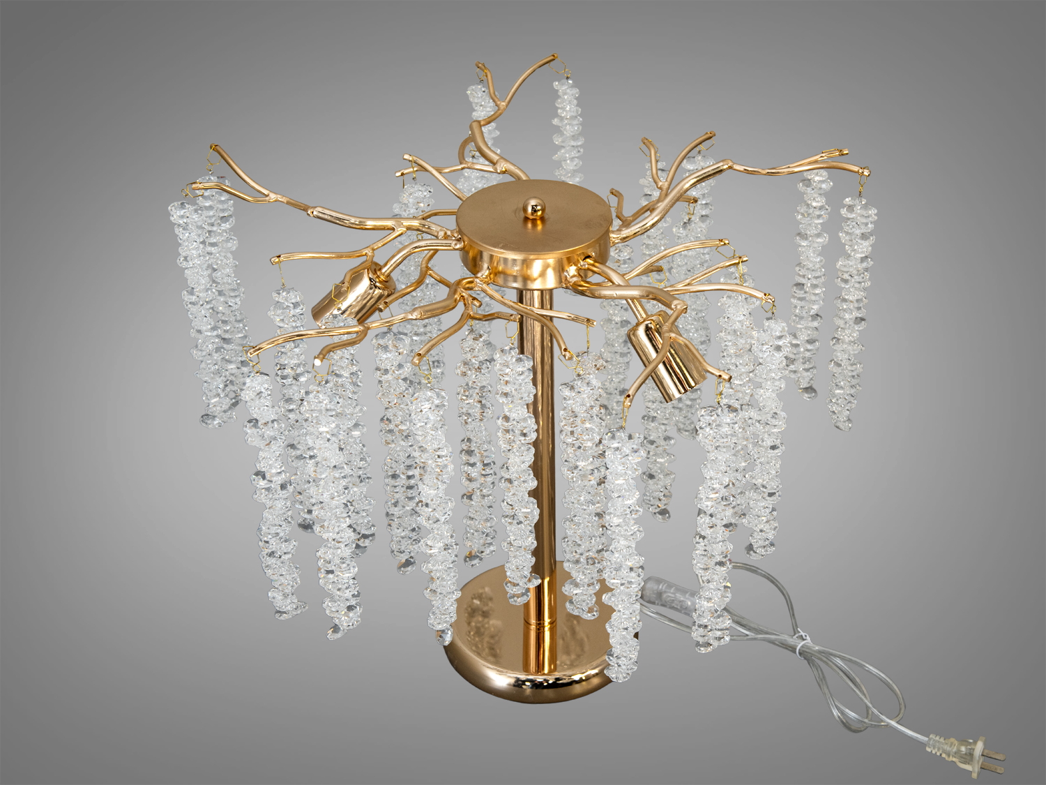 Настільна лампа серії Глициния — це поєднання елегантності та функціональності. Висота лампи становить 38 см, а діаметр — 45 см. Золотиста основа з металу надає виробу розкішного вигляду, а кришталеві підвіски, що нагадують блискучі гілки дерева, створюють неповторну атмосферу.