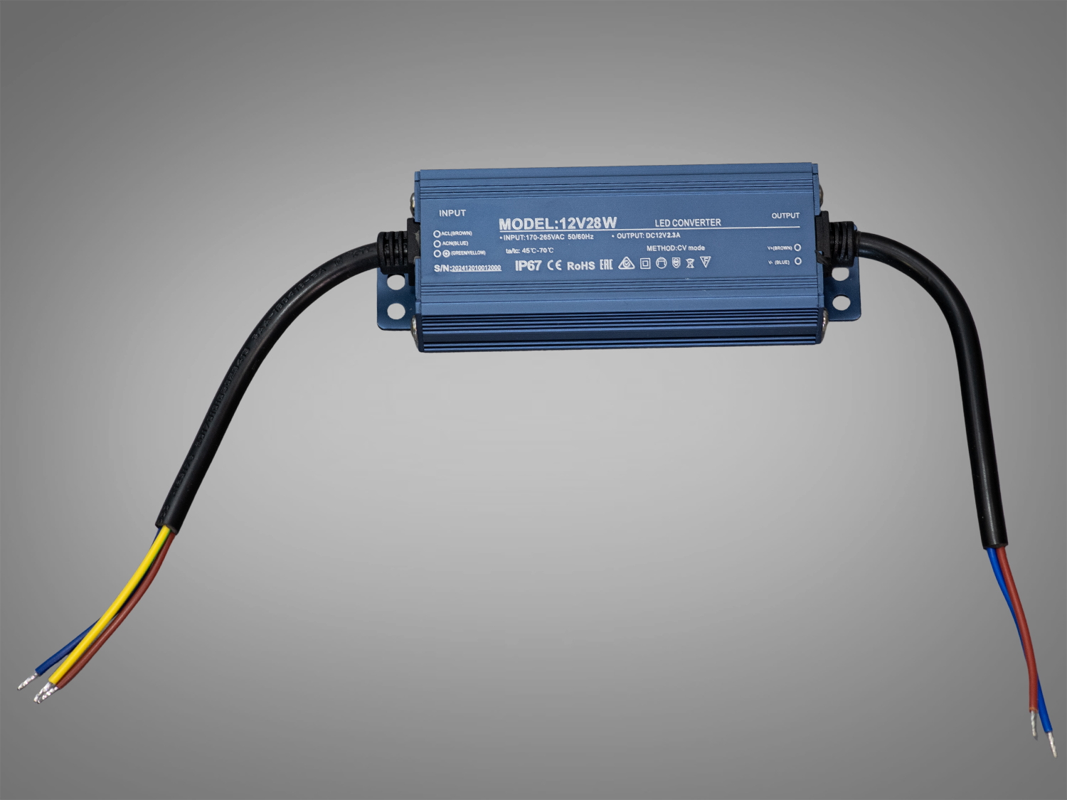 Візуально цей герметичний блок живлення виглядає елегантно і надійно: компактний алюмінієвий корпус у синьому кольорі з текстурованим покриттям підкреслює технічну витонченість пристрою. Акуратні кріпильні вушка з обох боків дозволяють безпечно фіксувати блок на будь-якій поверхні. З обох сторін виходять товсті кабелі з уже зачищеними кінцями, готовими до підключення, що значно полегшує монтаж навіть у важкодоступних місцях.