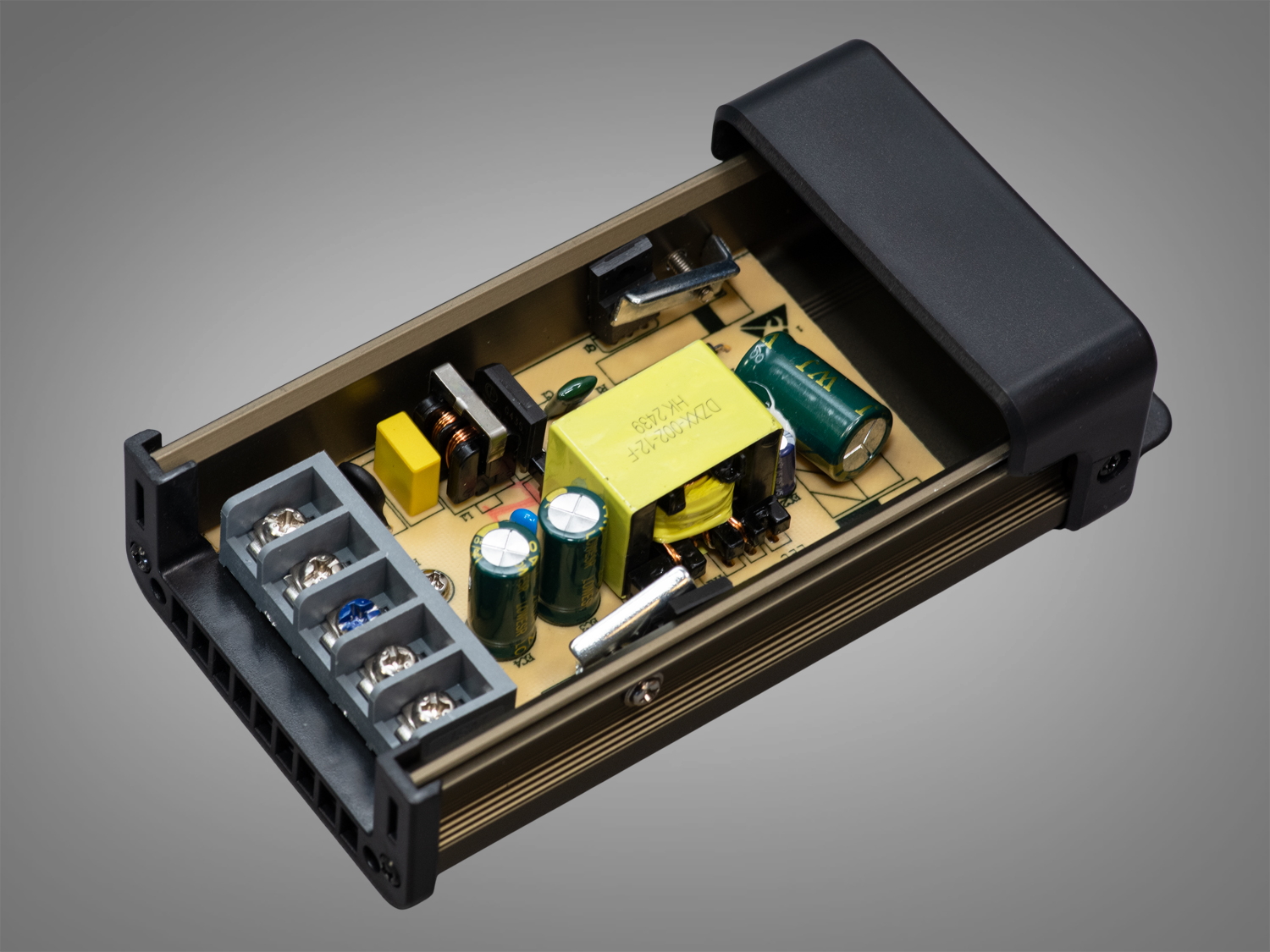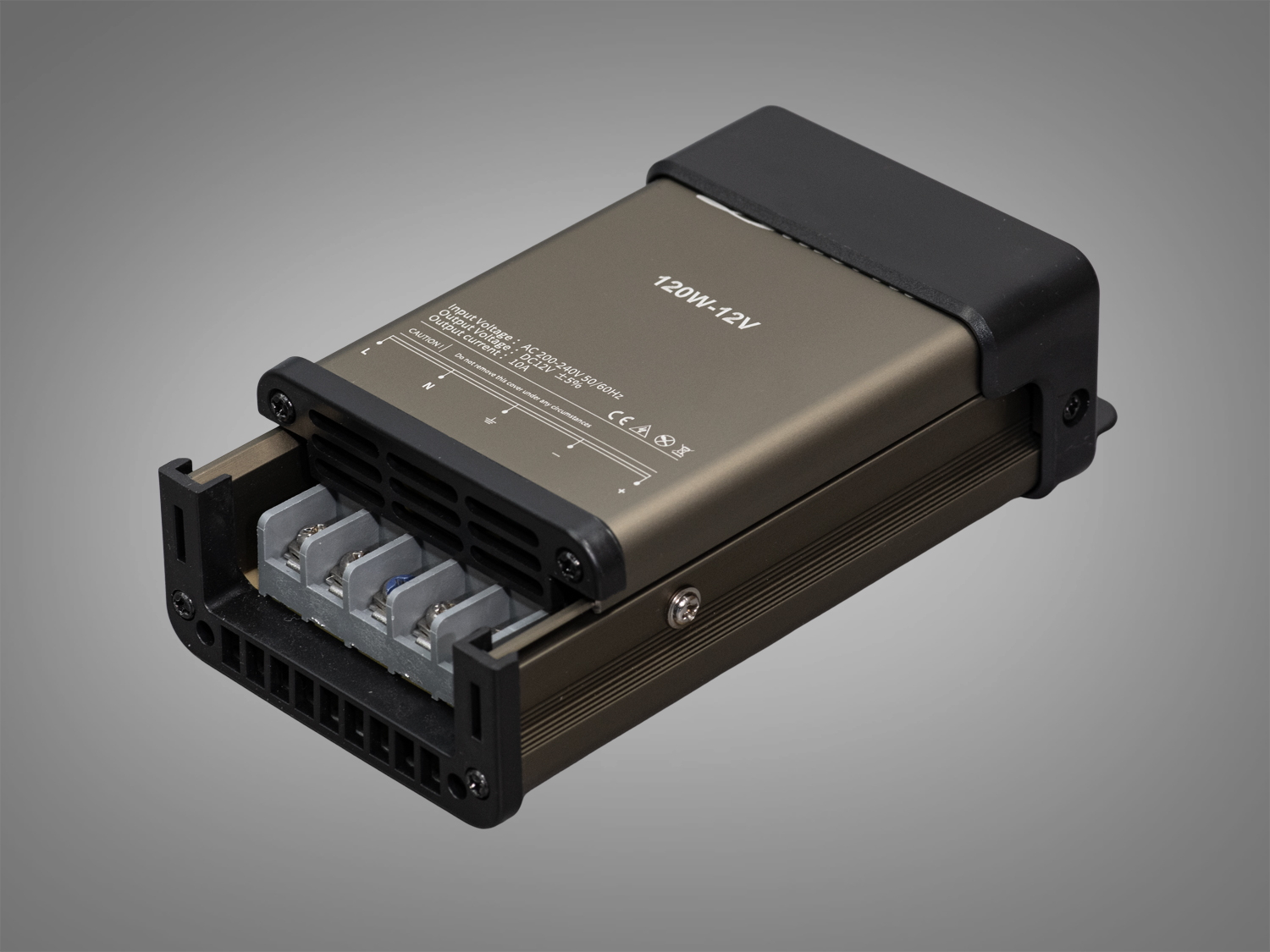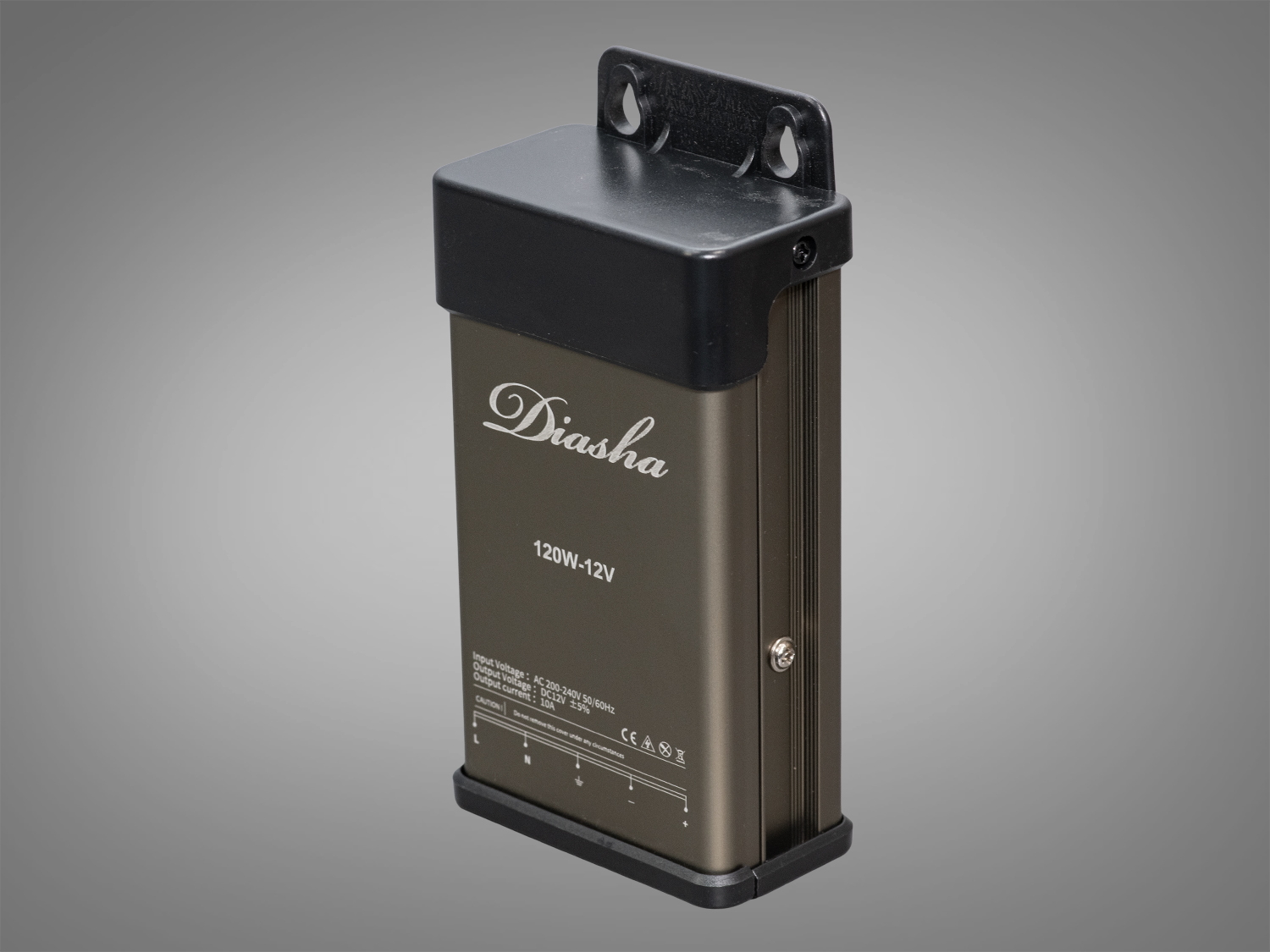 Блок живлення PPF-PW-IP54-12V-120W від ТМ "Diasha" одразу привертає увагу витонченим і водночас потужним дизайном. Його алюмінієвий корпус із чорними елементами виглядає стильно та надійно, а точна обробка деталей підкреслює високу якість виготовлення. Компактна прямокутна форма і продумана конструкція дозволяють легко інтегрувати пристрій у будь-який освітлювальний проєкт.