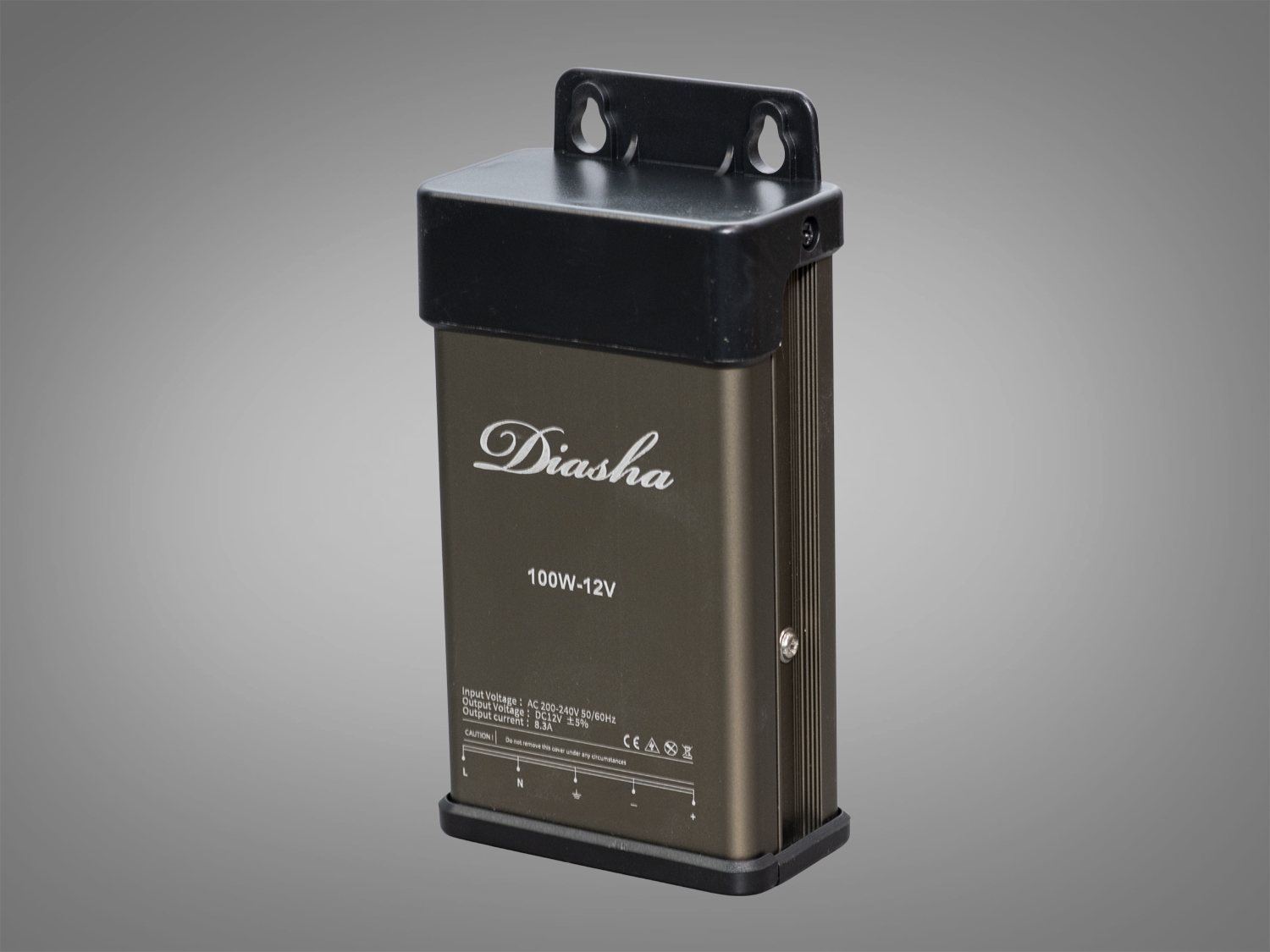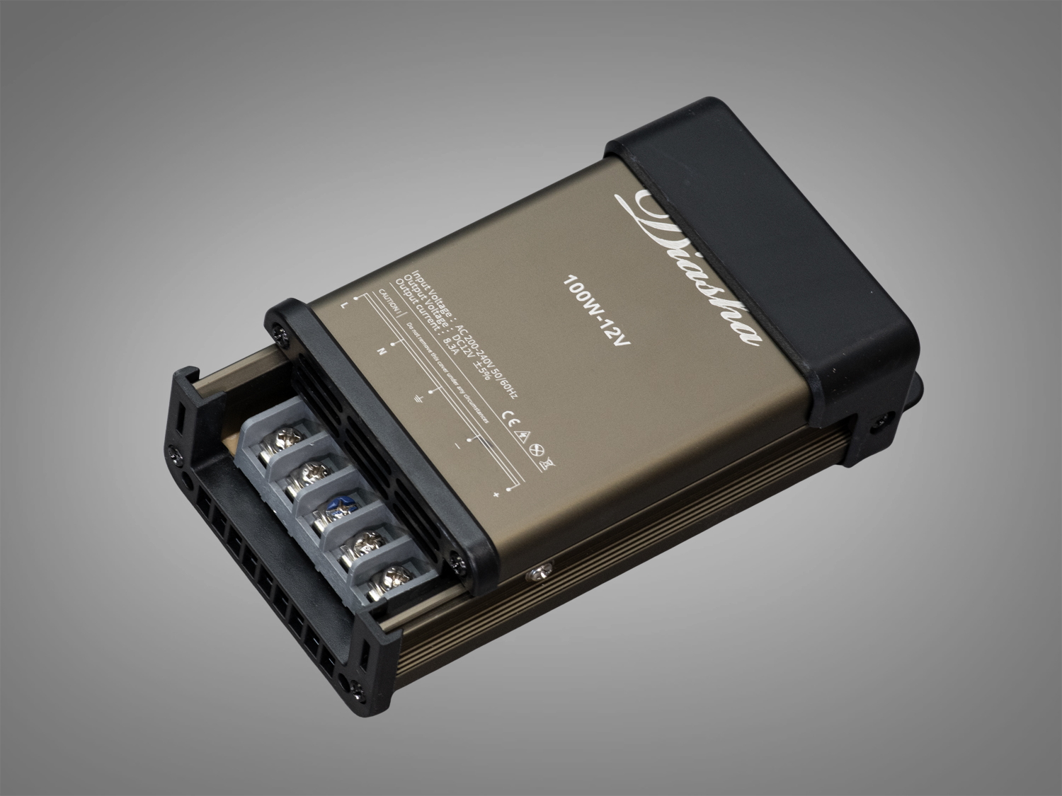 Блок живлення PPF-PW-IP54-12V-100W від ТМ "Diasha" вражає витонченим зовнішнім виглядом: строгий алюмінієвий корпус насиченого сірого кольору із захисними вставками чорного відтінку одразу передає відчуття надійності й витримки. Компактна прямокутна форма дозволяє зручно монтувати пристрій навіть у вузьких просторах, роблячи його добрим вибором для професійних і побутових проєктів освітлення.