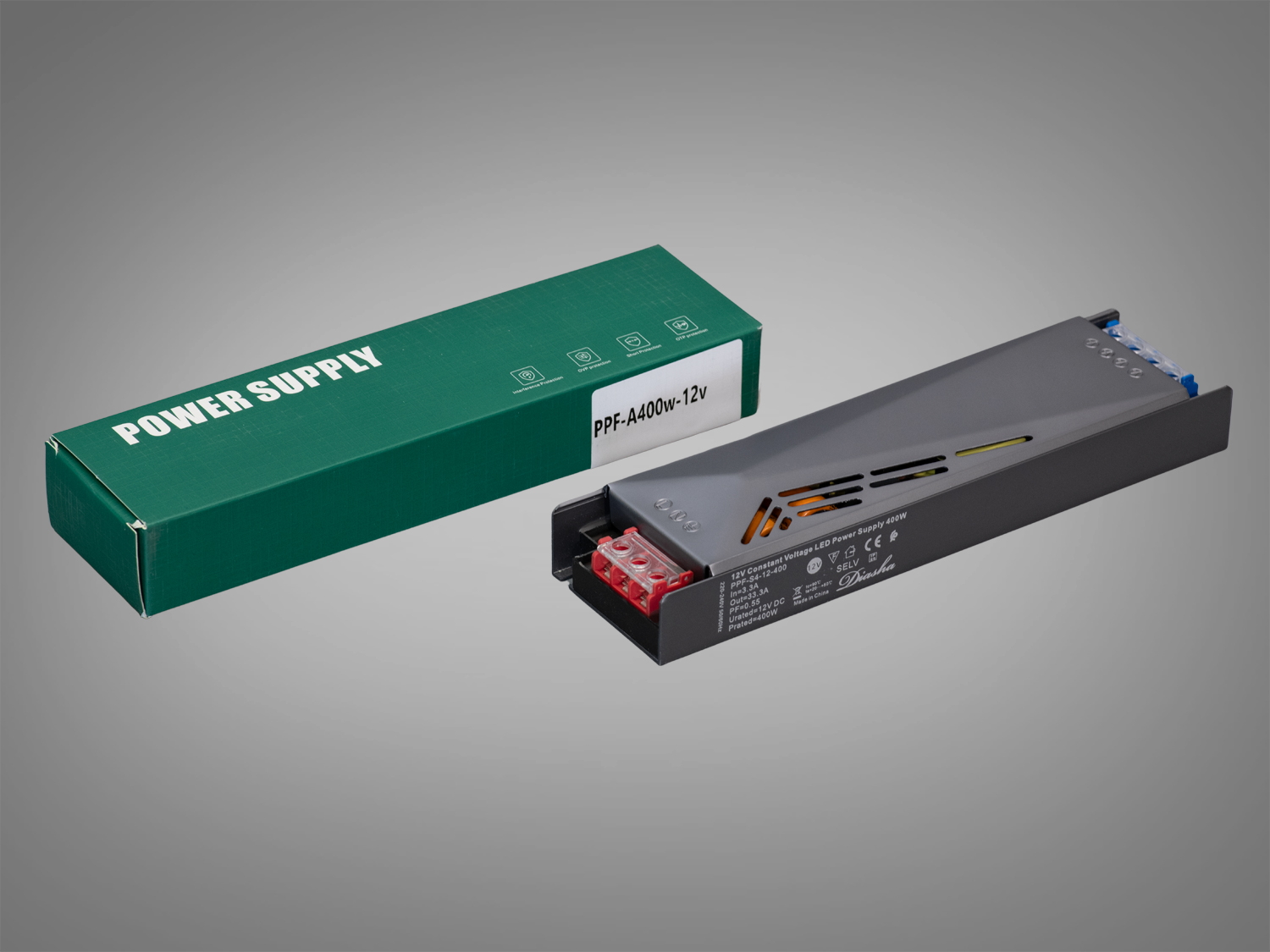Блок живлення PPF-A400W-12V від ТМ "Diasha" є добрим рішенням для побудови великих і потужних систем світлодіодного освітлення, де ключовими вимогами є надійність, довговічність і стабільність роботи. Висока вихідна потужність, якісні матеріали, ефективне охолодження та сучасний захист роблять його незамінним у професійному використанні.