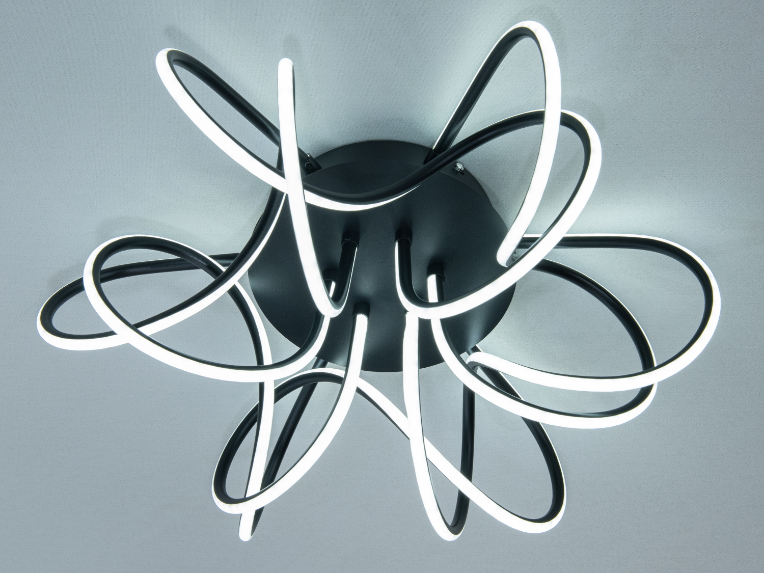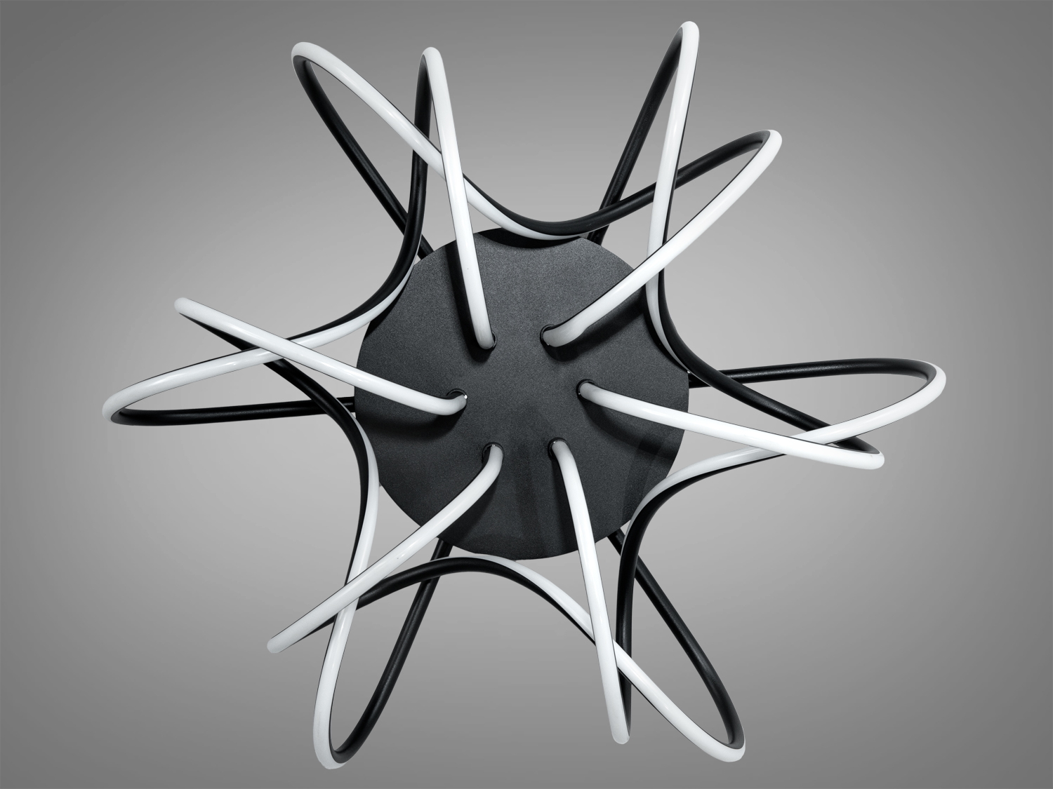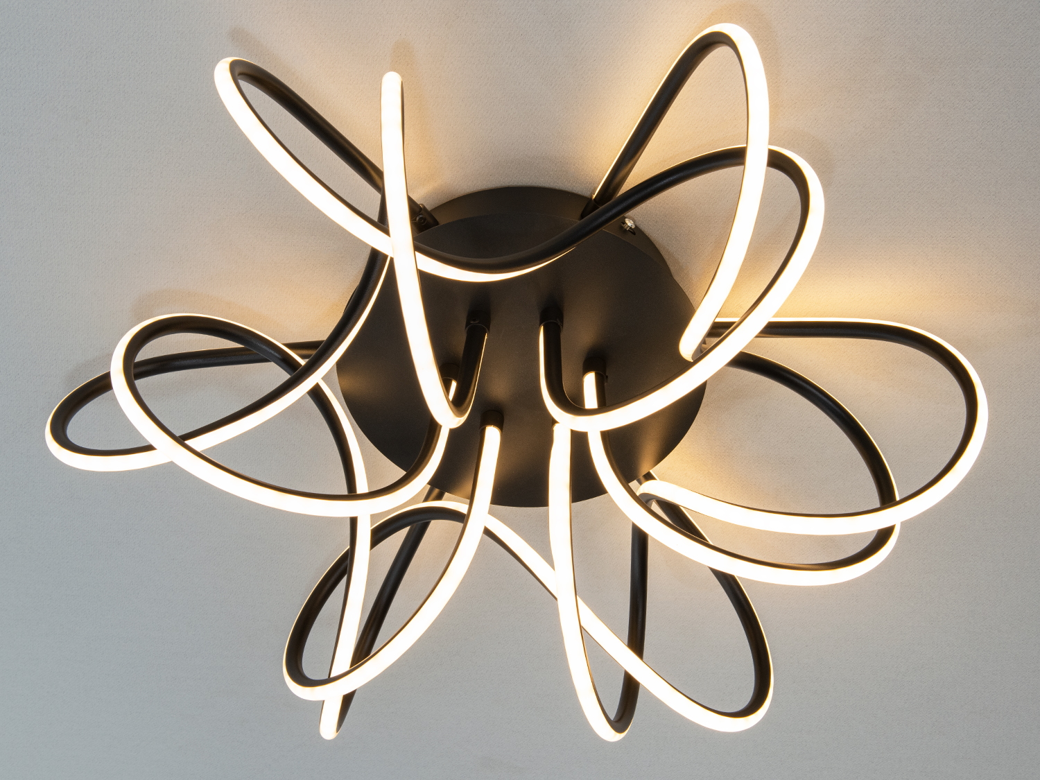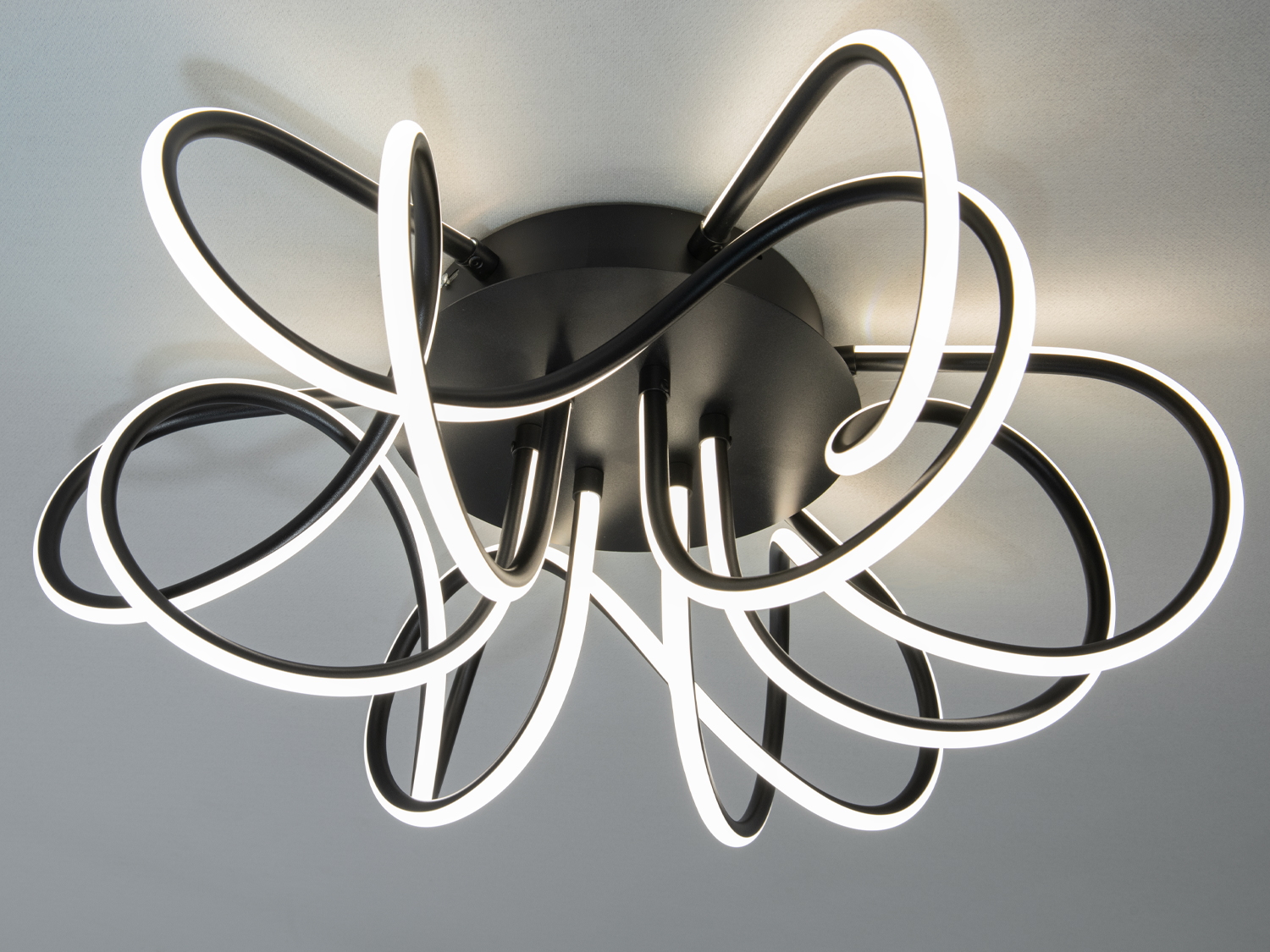 Ця модель вражає своєю динамічною формою: вигнуті трубки утворюють складний об’ємний малюнок, що нагадує хаотичний, але гармонійний візерунок. Чорне металеве покриття надає виробу стриманості та сучасності, а LED-елементи відповідають за високоефективне освітлення з мінімальним енергоспоживанням.