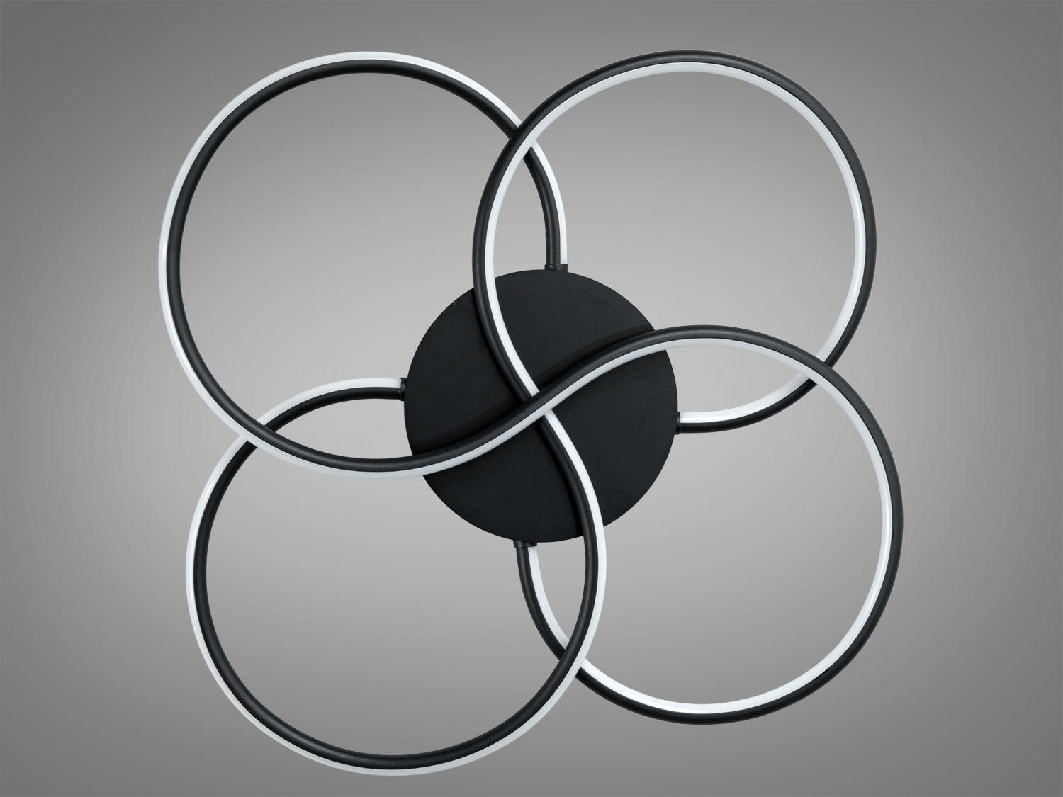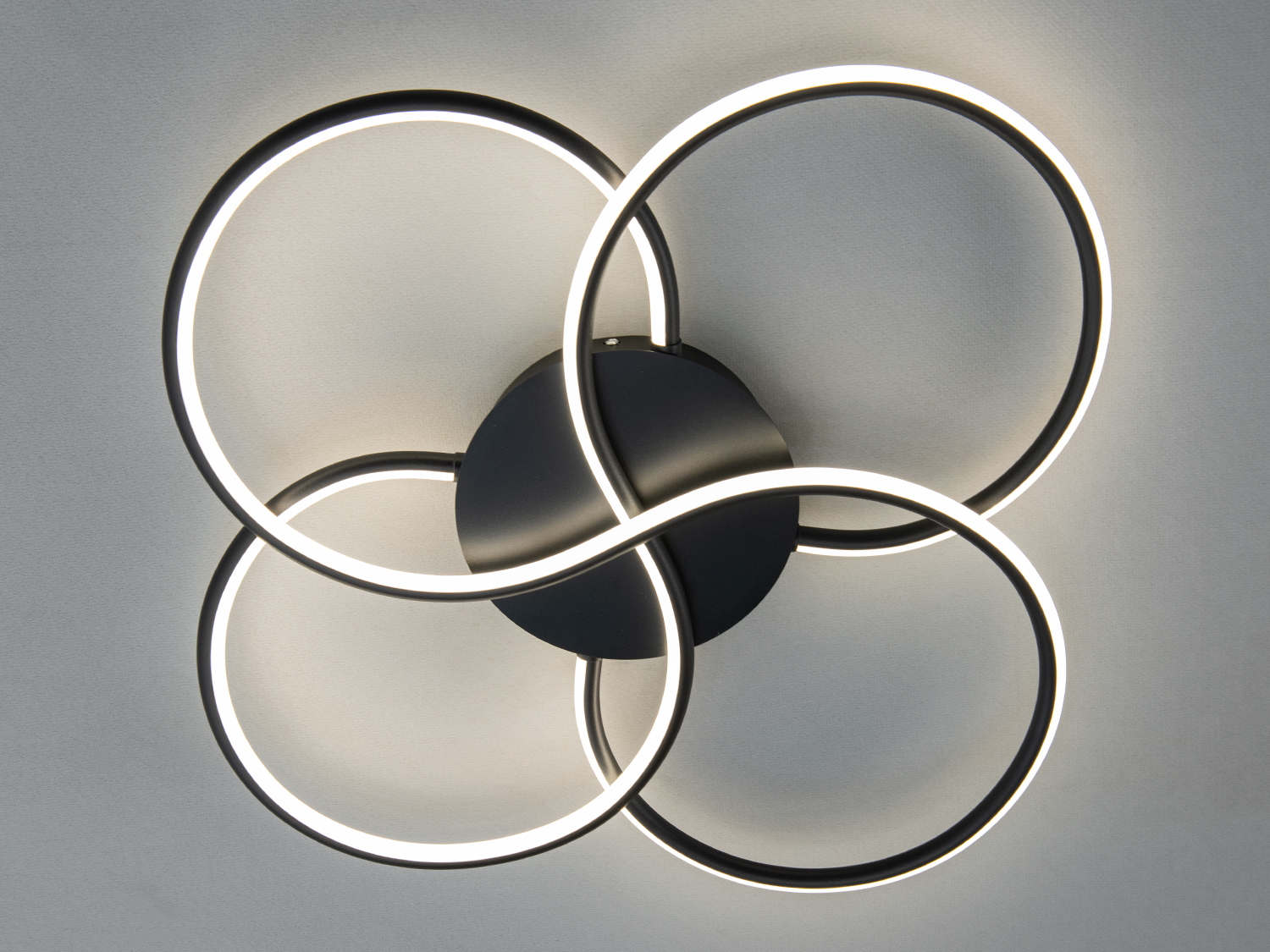 Світлодіодна люстра Diasha – це стильне та сучасне рішення для вашого інтер’єру. Чорний колір корпусу в поєднанні з чотирма переплетеними кільцями створює унікальний геометричний дизайн, який стане акцентом у будь-якій кімнаті. Цей світильник підійде для вітальні, спальні чи офісу.