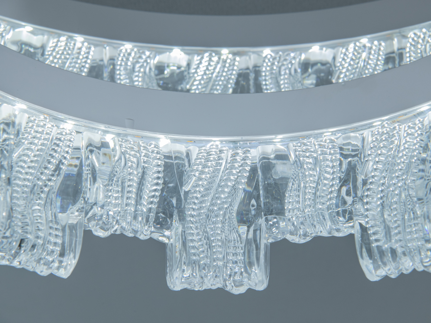 Люстра виконана у сучасному стилі та поєднує металевий каркас і акрилові елементи, що робить її елегантною та універсальною. Білий колір корпусу і прозорі кільця підкреслюють мінімалістичний дизайн, підходящий для скандинавських та сучасних інтер'єрів.