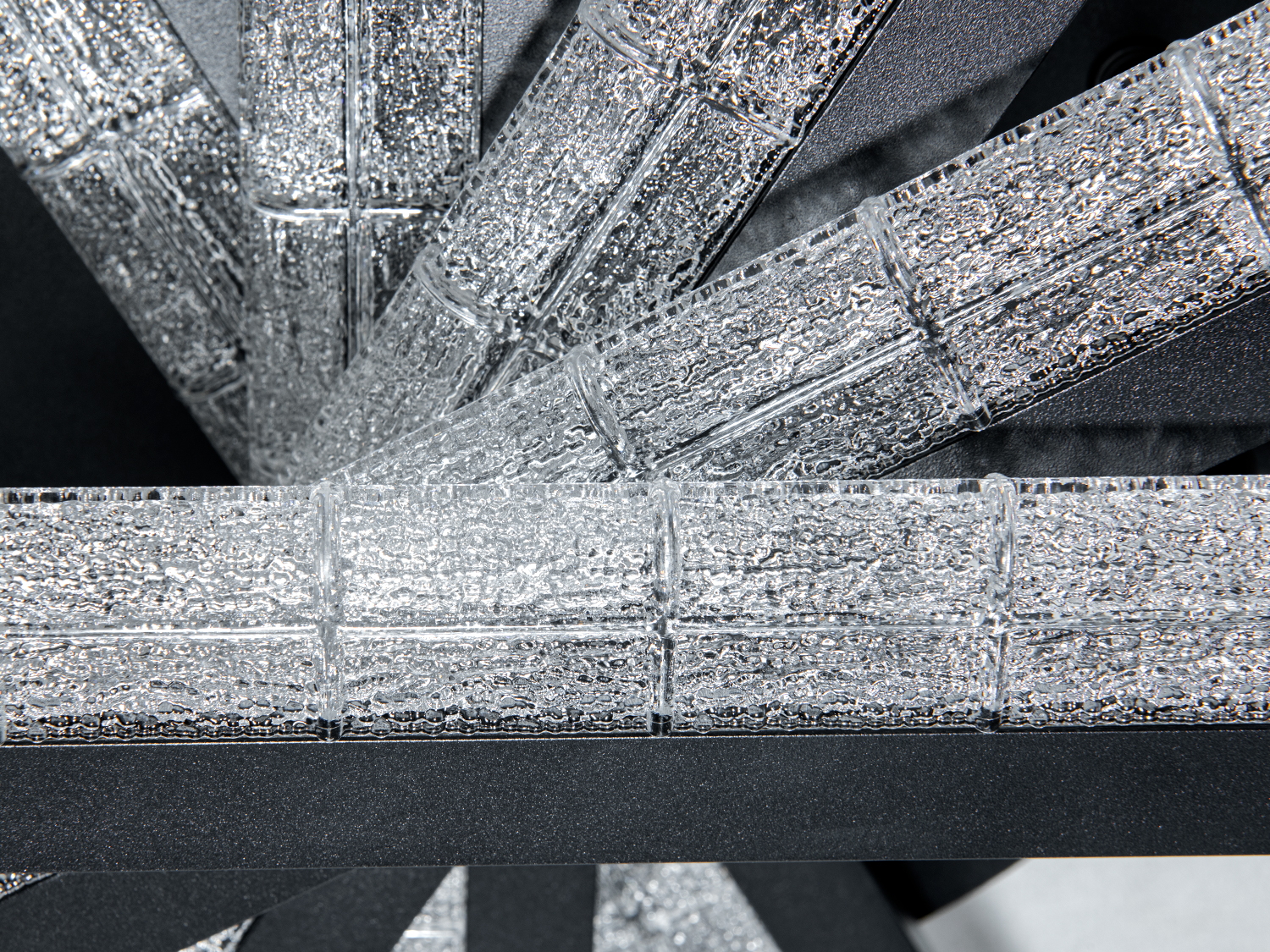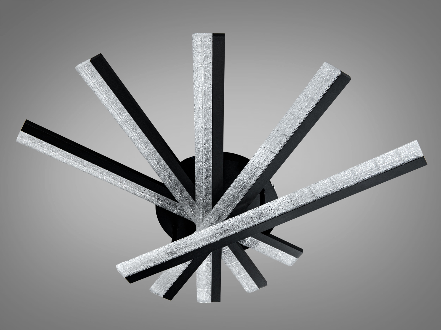 Конструкція складається з п’яти чорних металевих планок з акриловими розсіювачами. Це забезпечує рівномірний, м’який світловий потік в межах 3850 лм, що робить люстру оптимальною для просторів до 20 м².