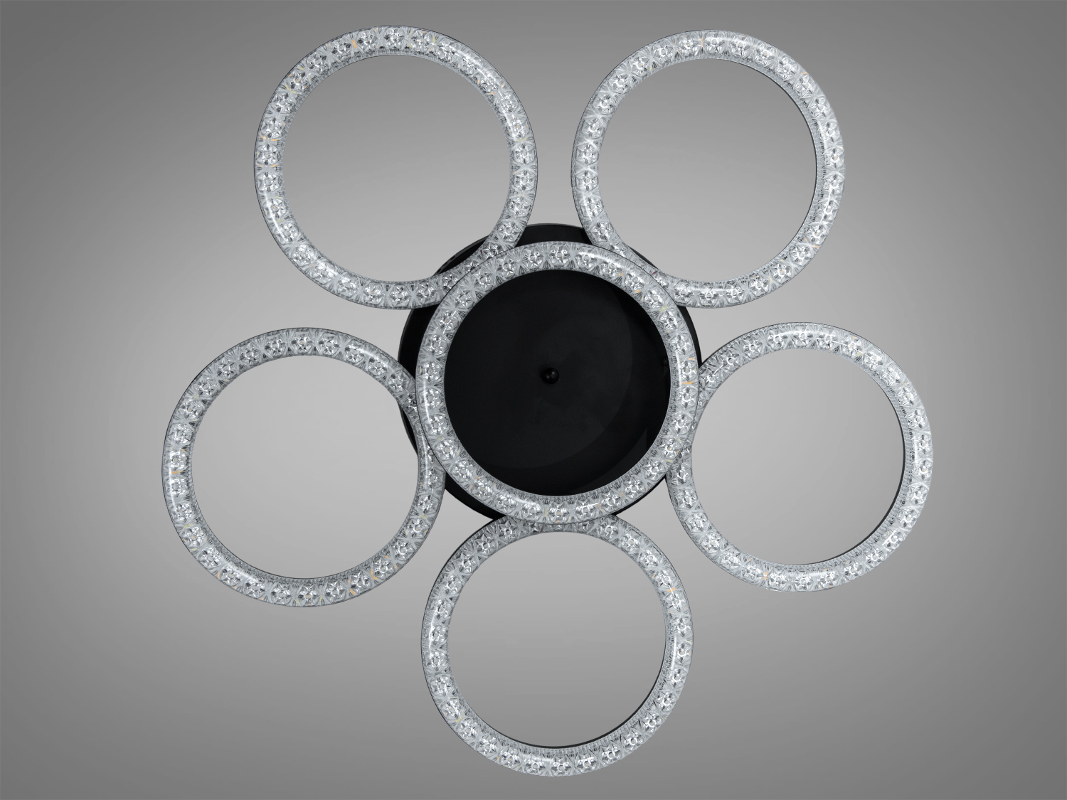 Кільця люстри декоровані кристалічними елементами, що додають глибини та виразності світловому ефекту. Чорна основа створює стильний контраст зі світлими стінами та стелею, підкреслюючи геометрію композиції.