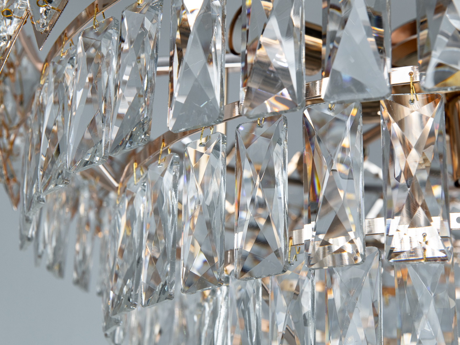 Люстра виконана з високоякісного металу з золотим покриттям, що надає їй вишуканий вигляд. Кришталеві підвіски різноманітної форми створюють унікальні світлові переливи, додаючи глибину та блиск вашому інтер'єру.