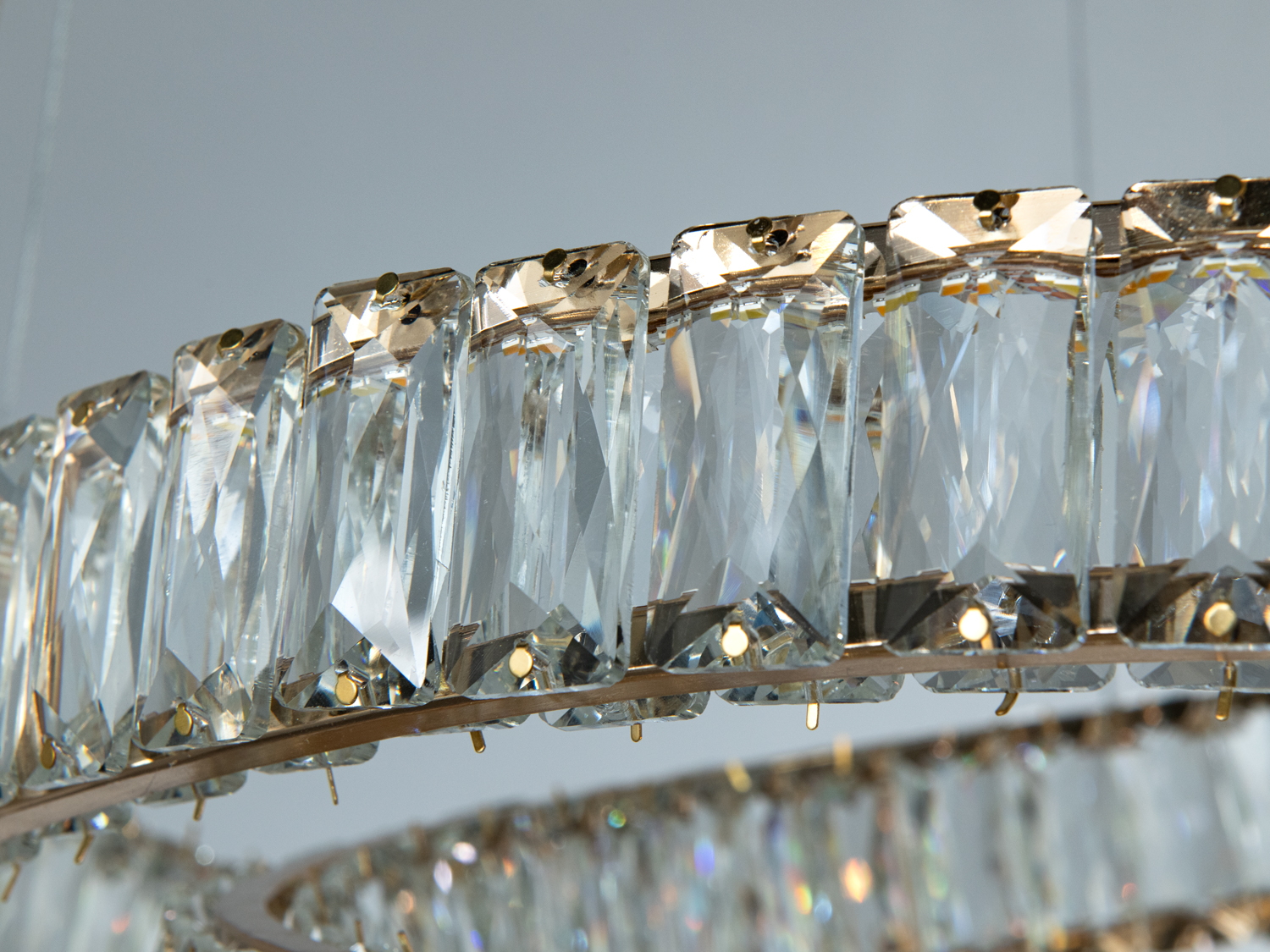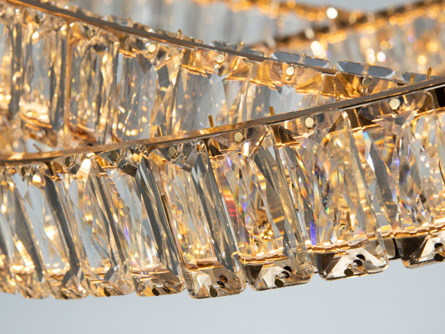 Металева основа з гальванічним покриттям у золотому кольорі надає світлу теплий відтінок, підсилюючи відчуття затишку. Кришталі виконують роль природного дифузора, створюючи м'які переливи та насичені відблиски. Підвіс на тросах додає візуальної легкості, ніби люстра плаває у просторі.