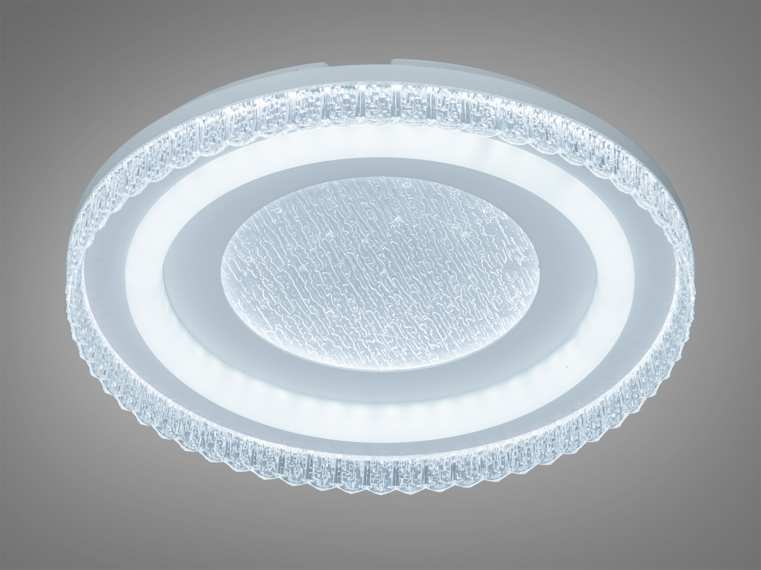 Декоративне рельєфне скло з прозорим обідком додає виробу унікальності, створюючи ефект хрустального сяйва. Така конструкція підкреслює сучасний стиль інтер’єру, а монтаж на стелю робить світильник практичним рішенням для кімнат з різною площею.