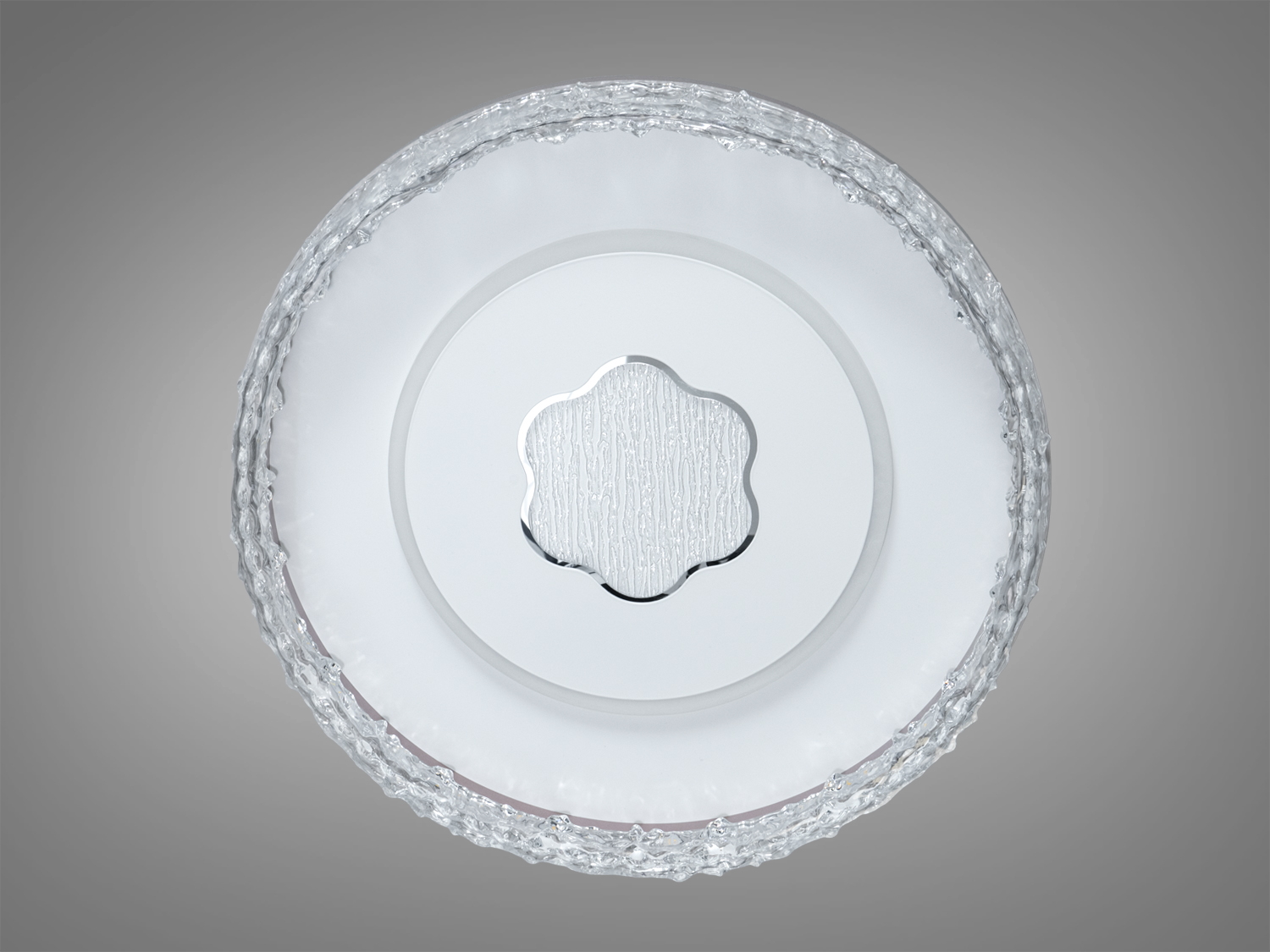 Корпус світильника виконаний з міцного металу, а плафон з акрилу, що забезпечує довговічність і стійкість до пошкоджень. Рельєфний край імітує кришталь, створюючи незвичайну гру світла і тіні.