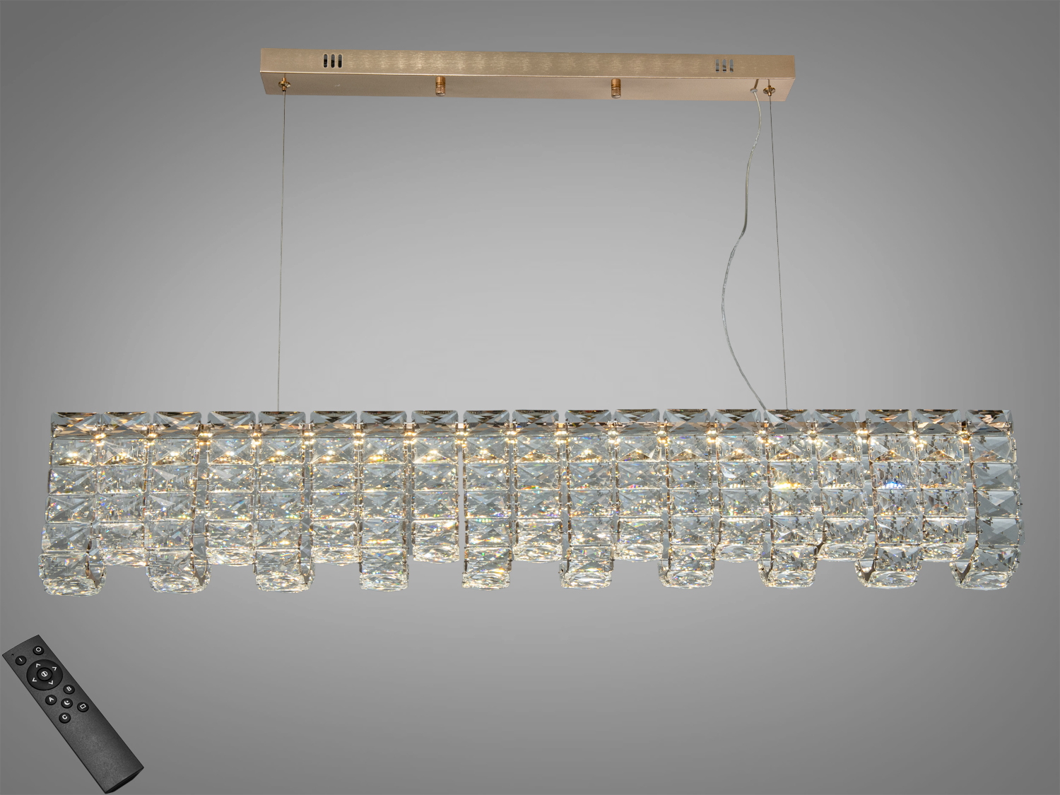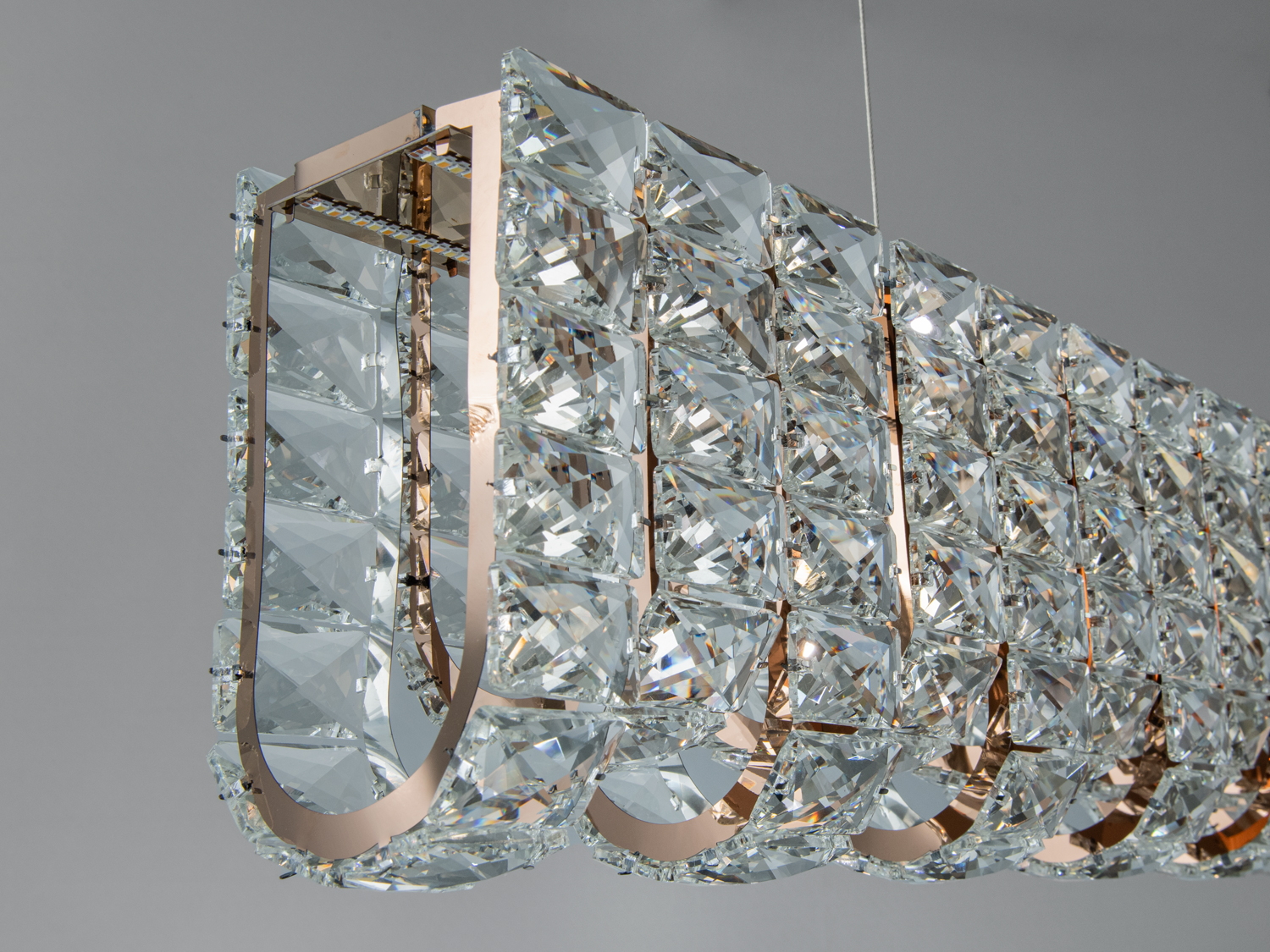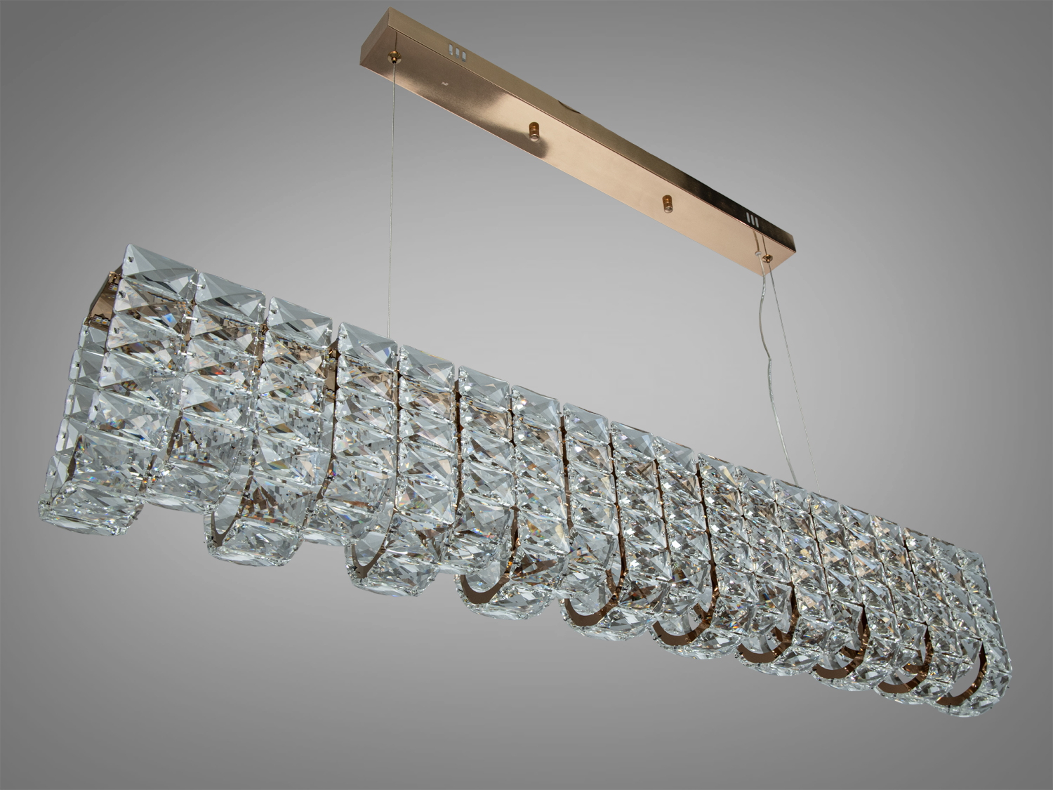 Люстра має продовгувату прямокутну форму з кришталевими елементами, які розсіюють світло, створюючи виразні відблиски. Металевий каркас із глянцевою або сатиновою золотою поверхнею підкреслює блиск кришталів. Висота люстри регулюється, що дозволяє адаптувати її під будь-які умови приміщення.