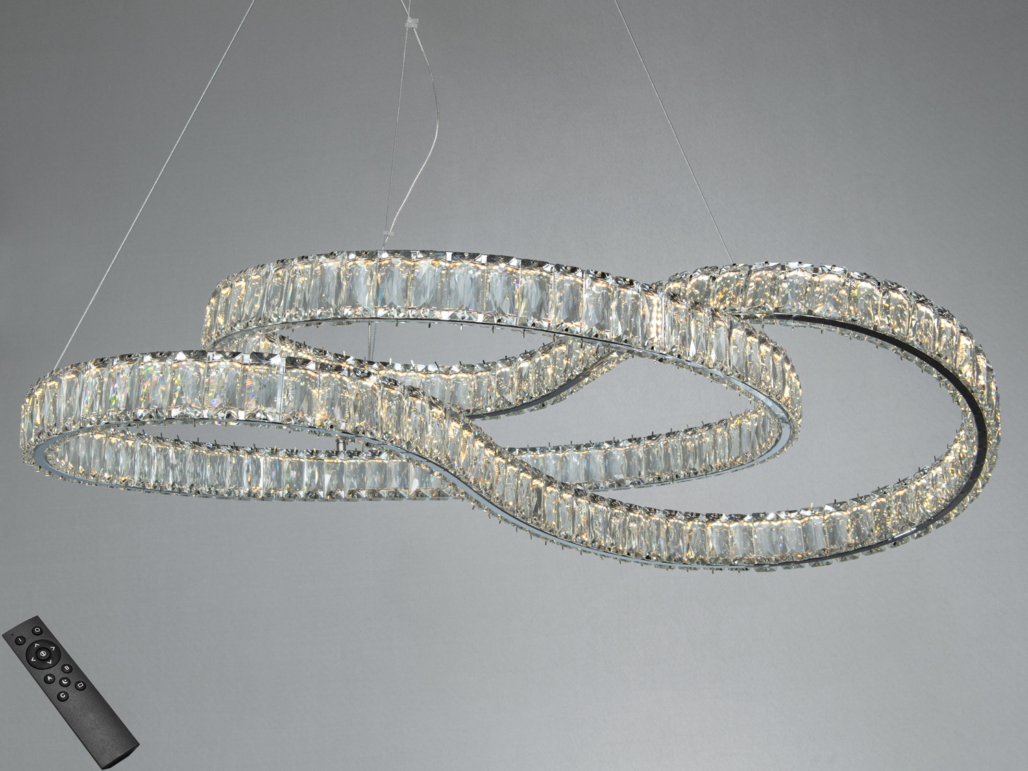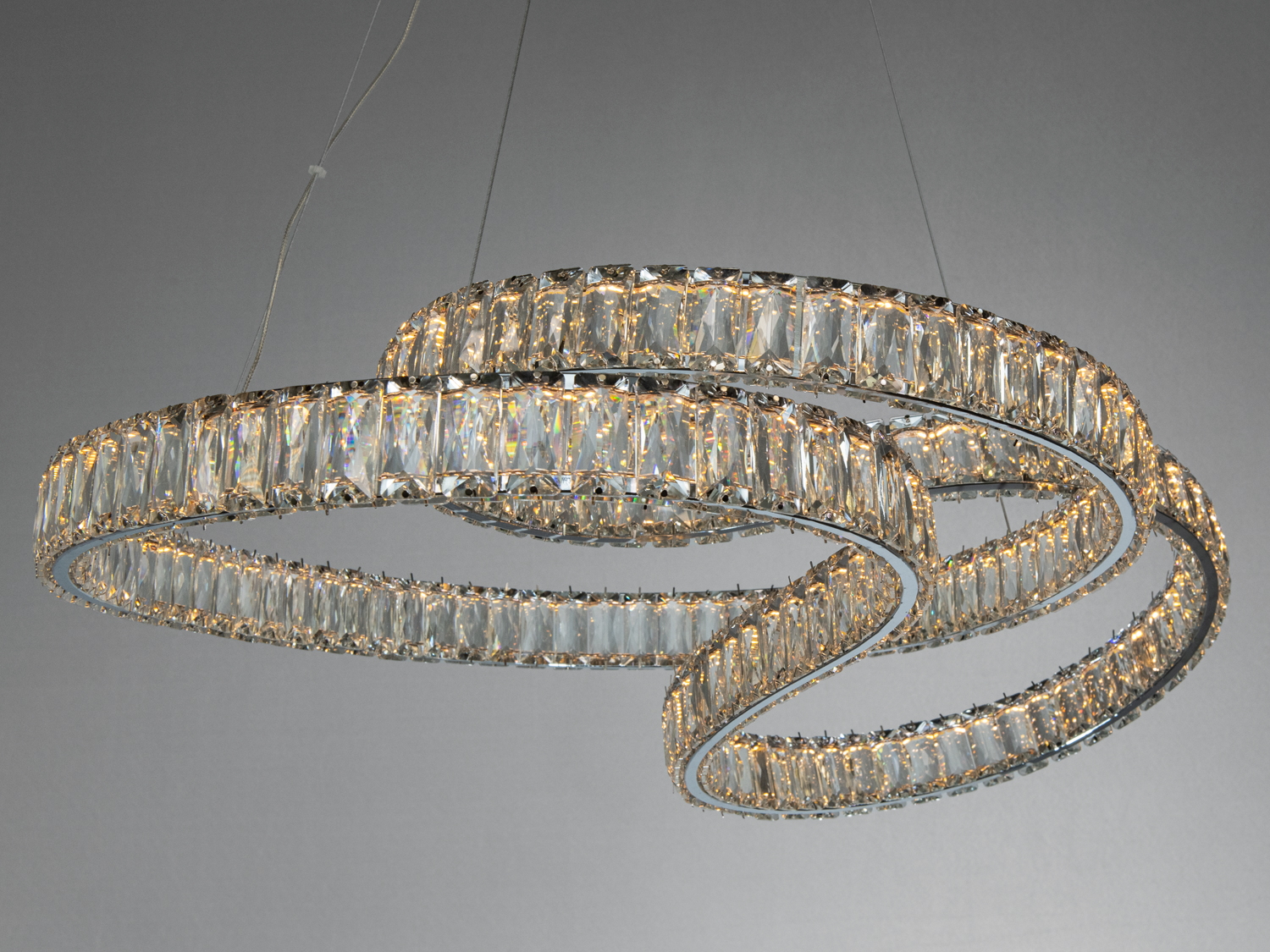 Світлодіодна люстра D8816 – це вишукане рішення для вашого інтер'єру. Люстра виконана в хромованому виконанні та прикрашена трьома переплетеними кришталевими кільцями, що створюють унікальний спіральний силует. Такий дизайн не лише привертає увагу, але й візуально полегшує простір.