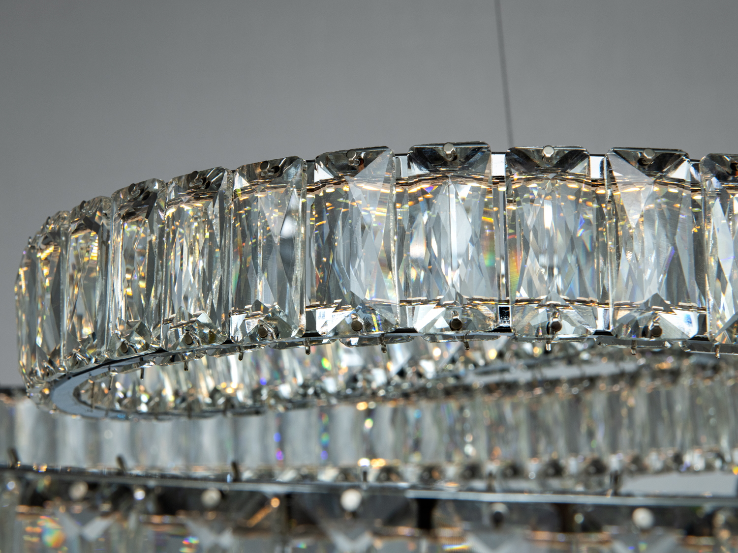Кристали, фасетовані для збільшення світлового ефекту, дарують м'які переливи та відблиски. Хромований металевий корпус з дзеркальним блиском гармонійно поєднується з сучасними інтер'єрами холодних відтінків. Підвіска на міцних тросах дозволяє регулювати висоту монтажу, адаптуючи люстру під різні стелі.